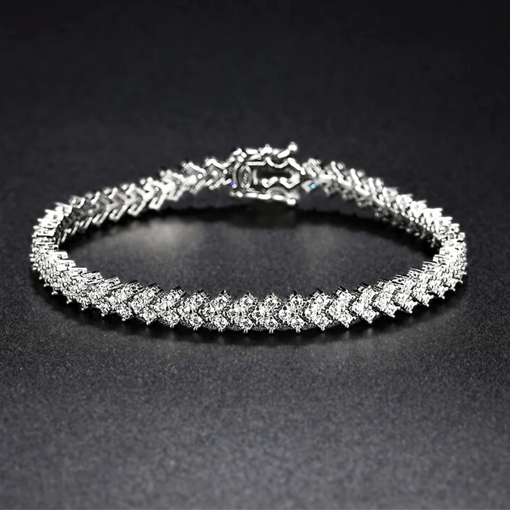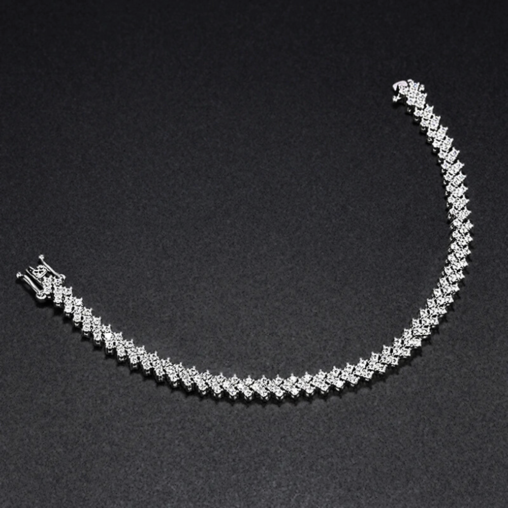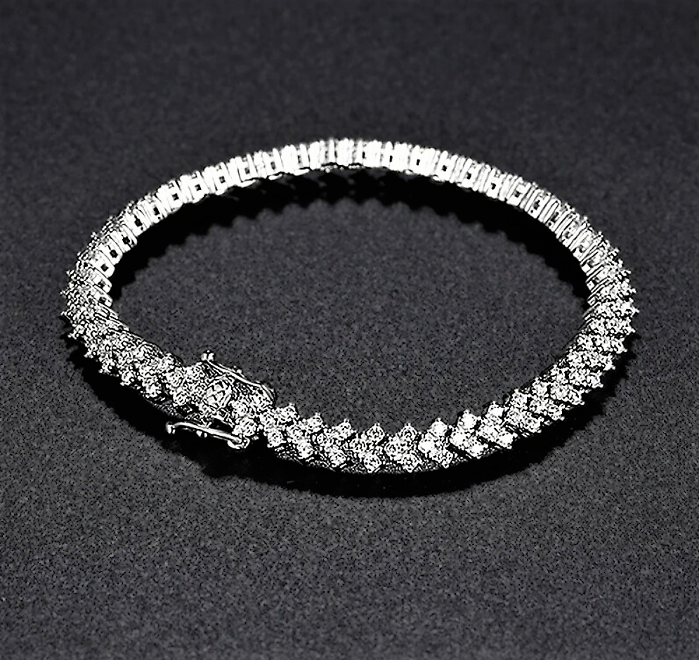 Il bracciale è realizzato completamente a mano in Argento Sterling 925, rifinito con tripla placcatura in oro bianco a 18 carati e completato da una rodiatura finale. La superficie lucida amplifica la resa delle pietre e garantisce una luminosità stabile e duratura nel tempo.
