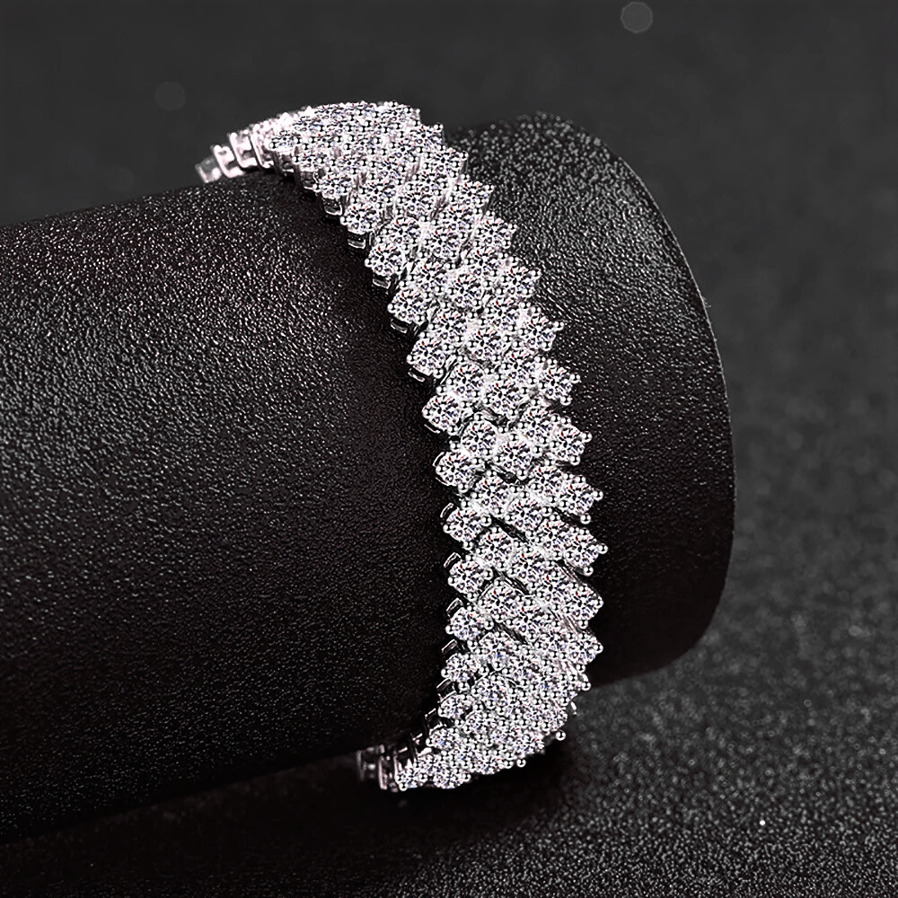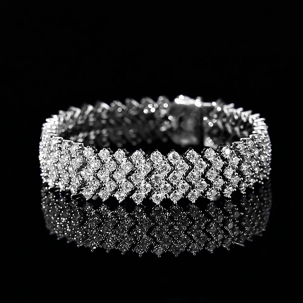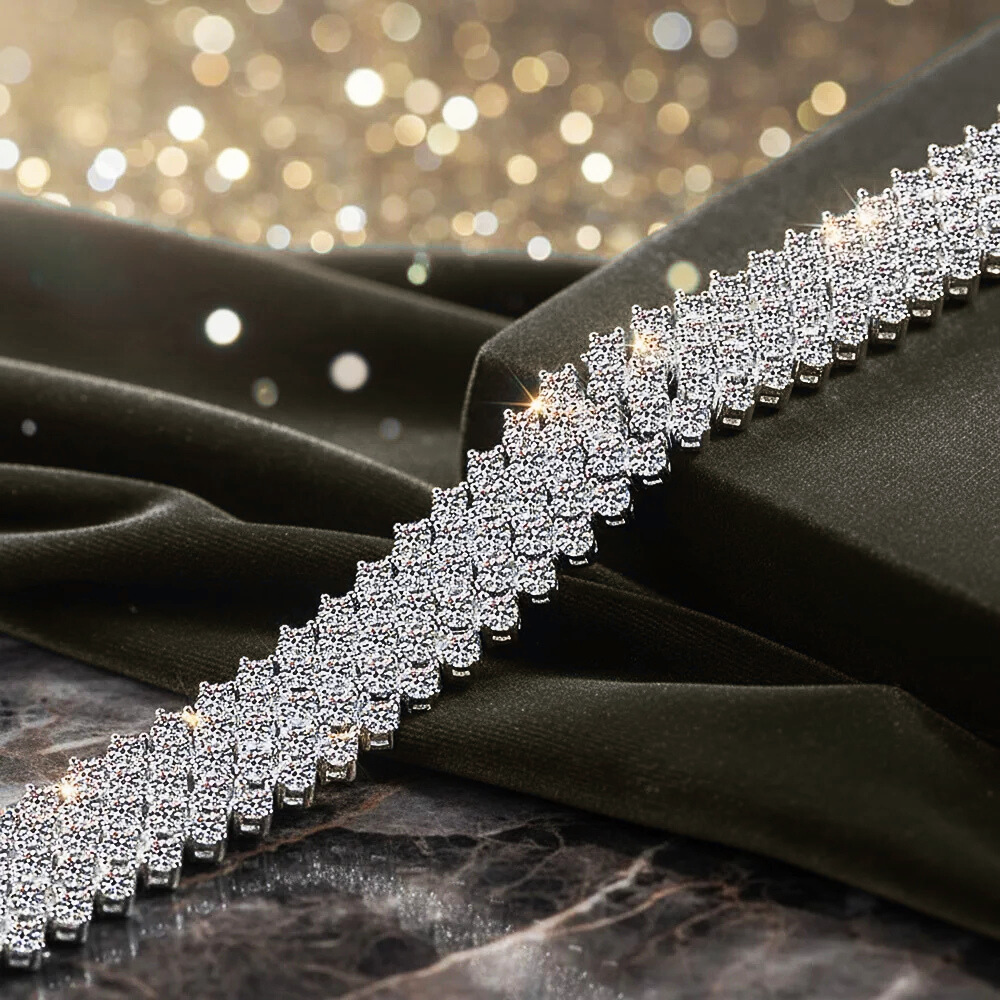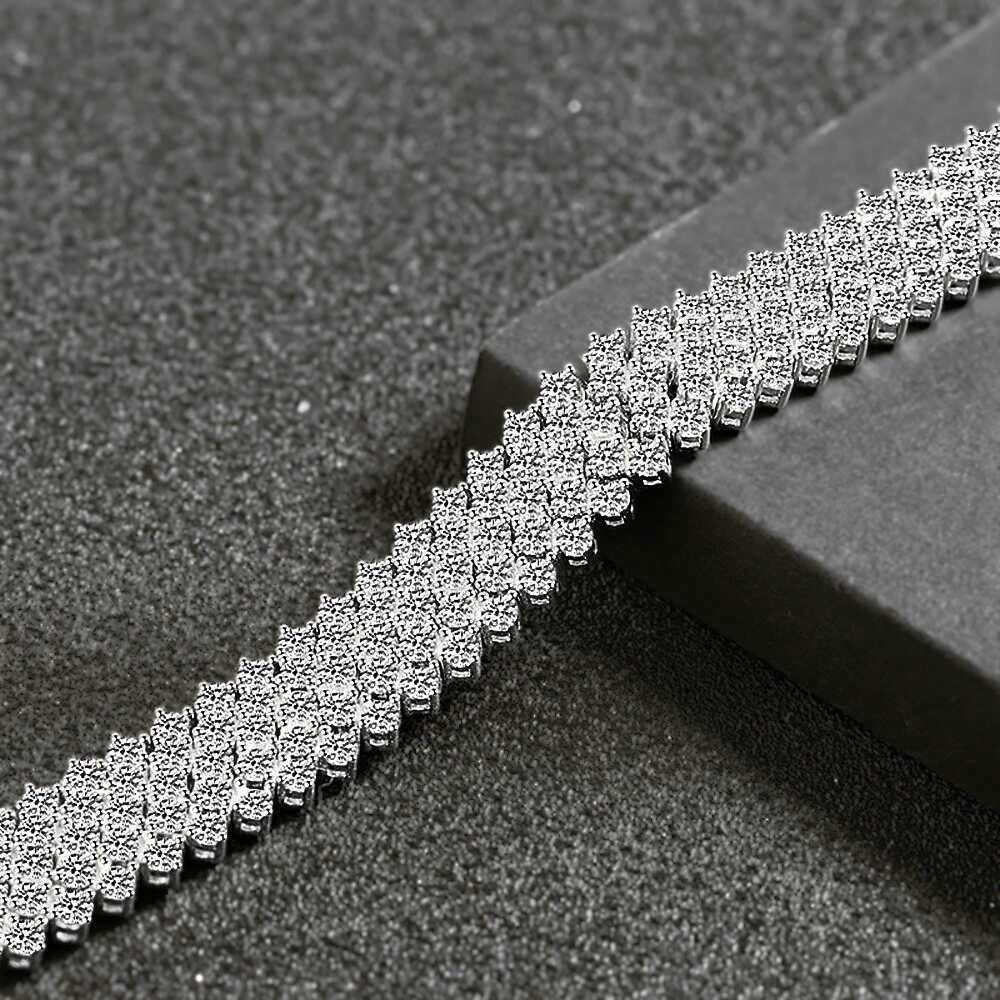 Ogni castone è leggermente decentrato rispetto alle file adiacenti, generando un effetto ottico dinamico e sofisticato. Questa struttura rompe la rigidità delle file tradizionali e dona al bracciale una flessibilità elegante, simile a un manto ricamato di luce. La superficie appare compatta, vibrante, perfettamente bilanciata.