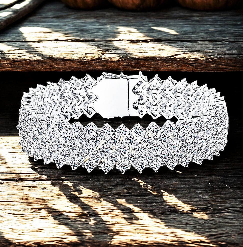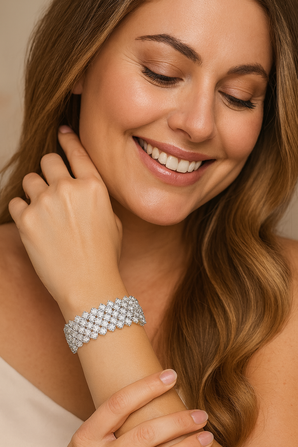 Questo bracciale nasce da una visione precisa: trasformare la brillantezza in superficie continua, senza interruzioni, senza vuoti, senza rigidità visiva. Il design “a tappeto” crea l’effetto di un tessuto luminoso che scorre con naturalezza, seguendo il movimento del polso e amplificando ogni riflesso. L’eleganza è piena, mai aggressiva, costruita su equilibrio, ritmo e proporzione. È un gioiello pensato per chi ama una presenza decisa ma composta, capace di comunicare lusso attraverso la qualità della luce e la perfezione dell’insieme.