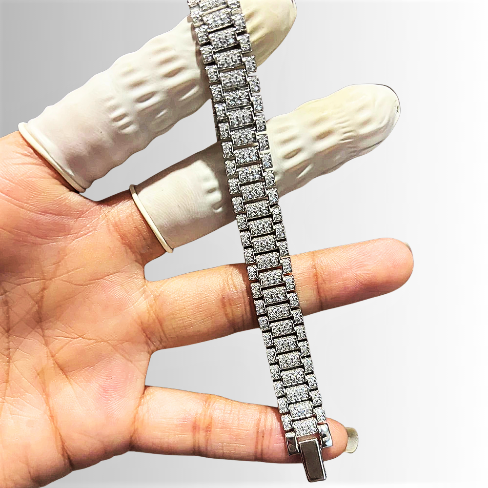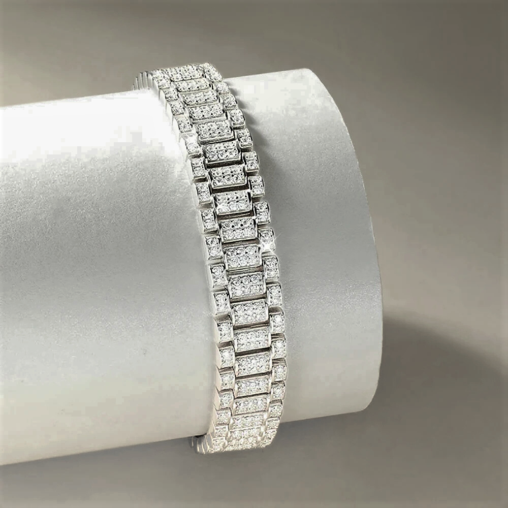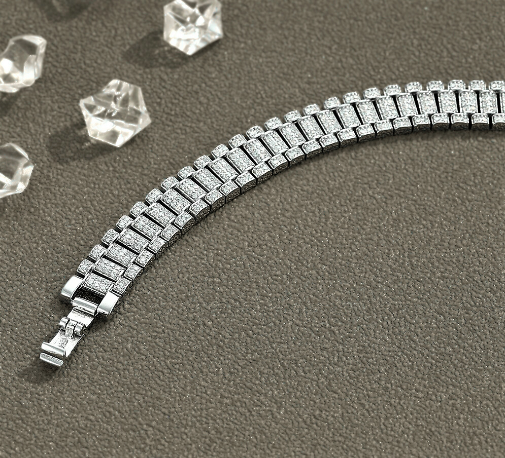 La struttura a doppia maglia rettangolare richiama i celebri "link bracelet" degli orologi di lusso, con elementi piatti, articolati e perfettamente allineati. La modularità delle maglie crea un ritmo visivo regolare e sofisticato, evocando solidità, continuità e precisione meccanica. Un design che parla di equilibrio e controllo, rivisitato in chiave gioiello. Ogni maglia è impreziosita da un pavé di moissaniti D color da 1,2 mm, incastonate a mano per garantire uniformità e pulizia visiva. La brillantezza è intensa ma misurata, pensata per valorizzare la geometria del bracciale senza sovrastarla. La luce scorre lungo la superficie con naturalezza, creando un effetto scintillante continuo e raffinato.