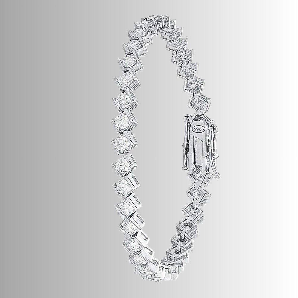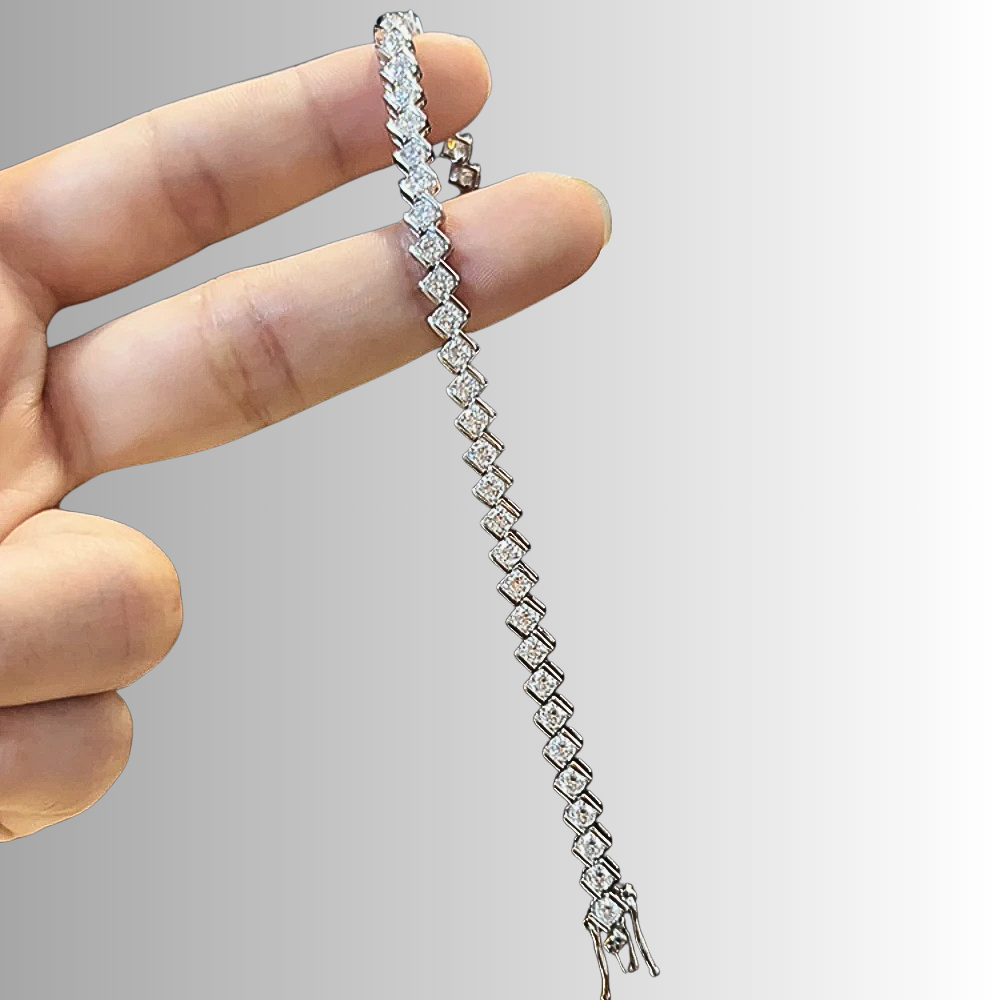 Questo bracciale tennis nasce per chi ama distinguersi con discrezione, scegliendo dettagli che raccontano personalità e gusto contemporaneo. La linea iconica del tennis viene reinterpretata attraverso una sequenza ritmata di castoni quadrati disposti a rombo, creando un gioco visivo dinamico, elegante e sorprendente. Un gioiello che non segue le mode, ma le anticipa, pensato per valorizzare il polso con una luce intensa e sofisticata, mai prevedibile.