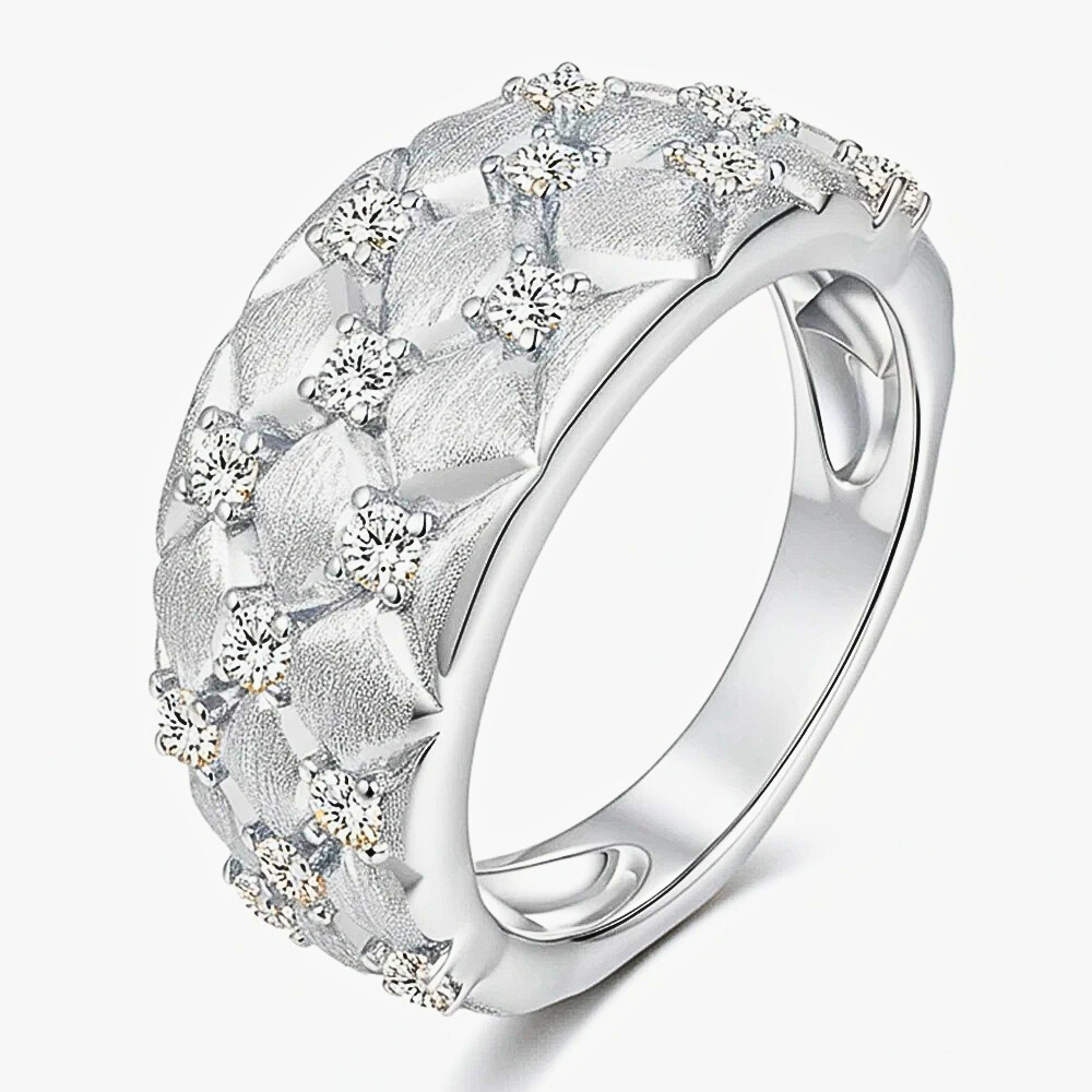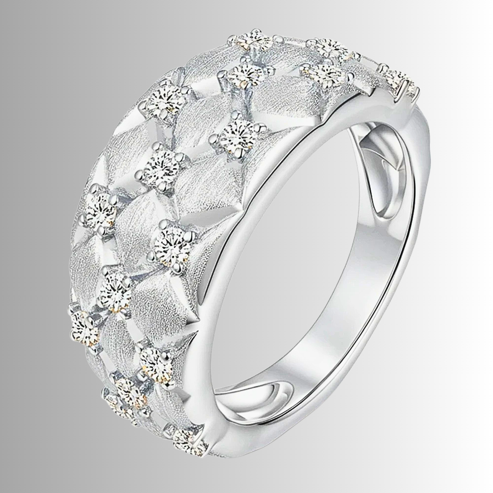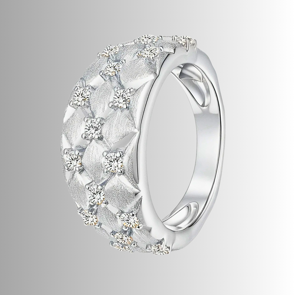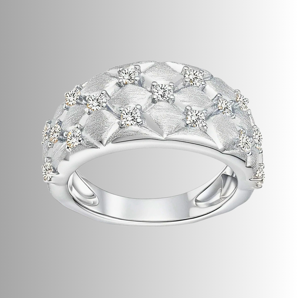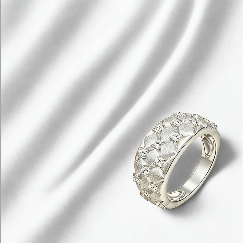 Nei punti di incontro tra i rombi è incastonata una moissanite D color da 2 mm, fissata con quattro sottili griffes. La disposizione crea una costellazione ordinata di punti luce che valorizza la geometria senza interrompere l’armonia del disegno.