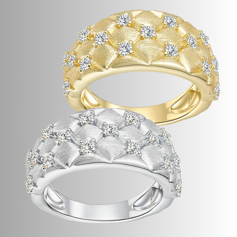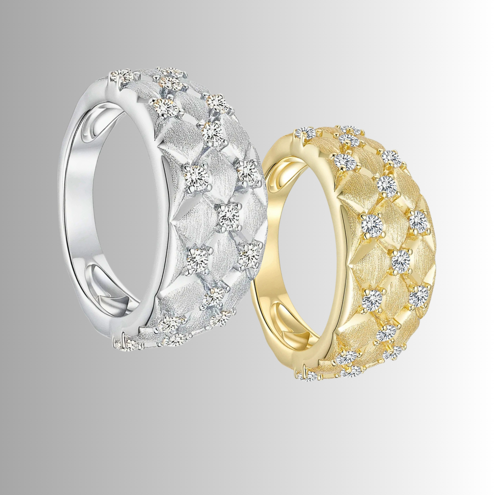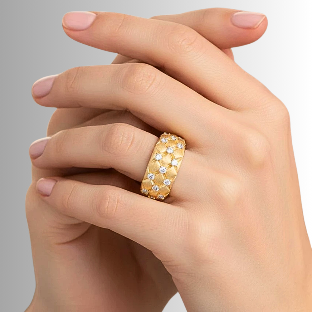 Questa fascia interpreta l’idea della trapuntatura in chiave orafa, trasformando un motivo tessile in un segno grafico elegante e contemporaneo. La forma bombata regala presenza alla mano, ma mantiene equilibrio e misura. È un gioiello pensato per chi ama le superfici lavorate, i dettagli studiati e una luminosità distribuita con criterio.
