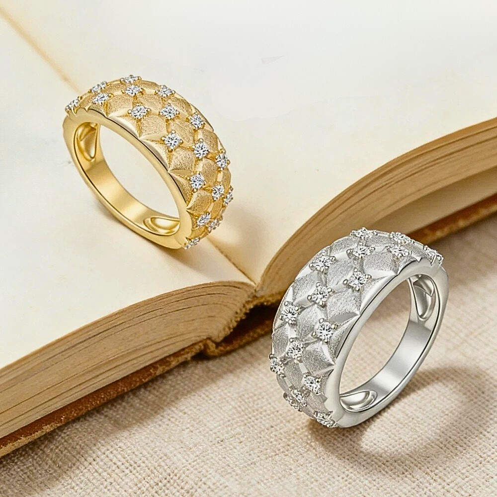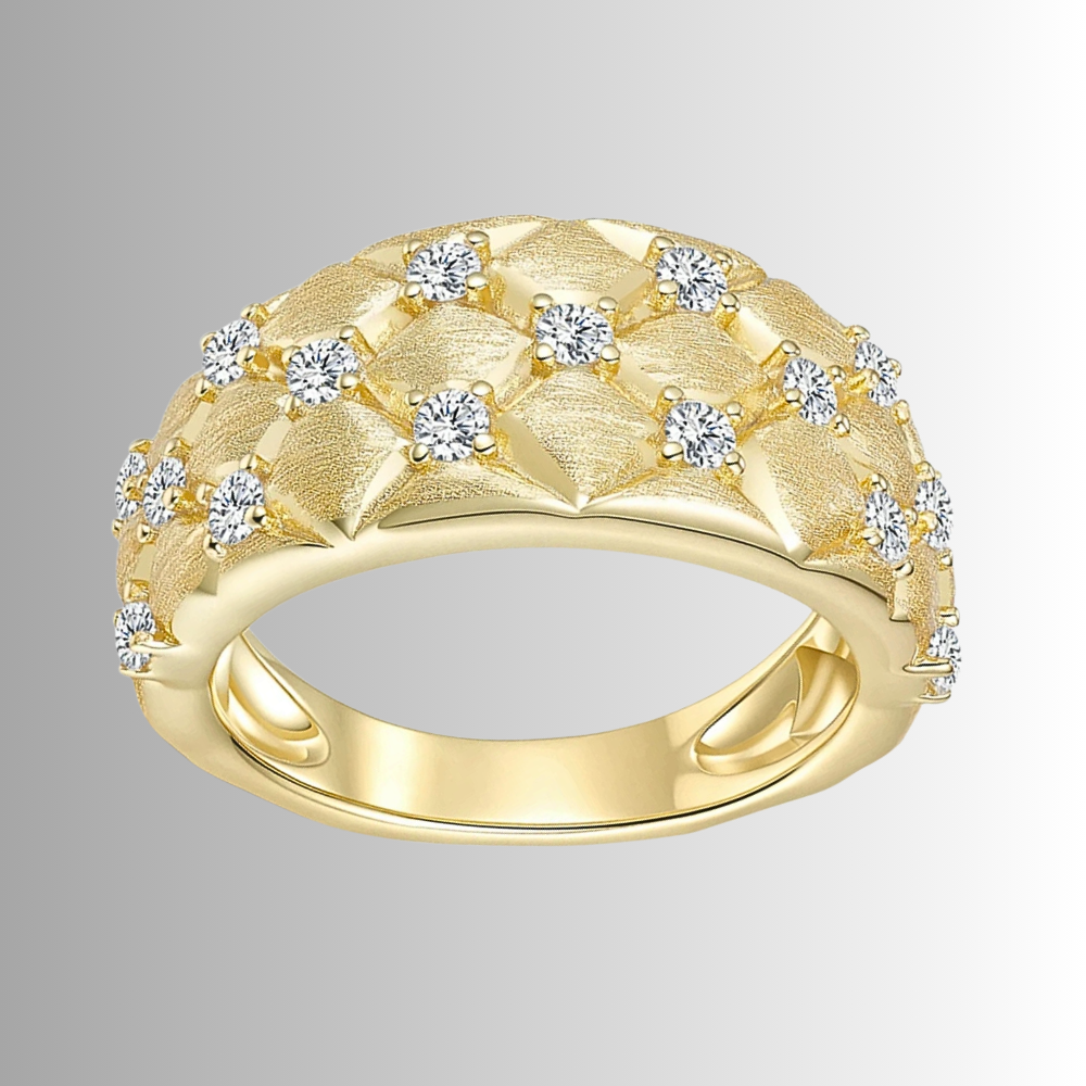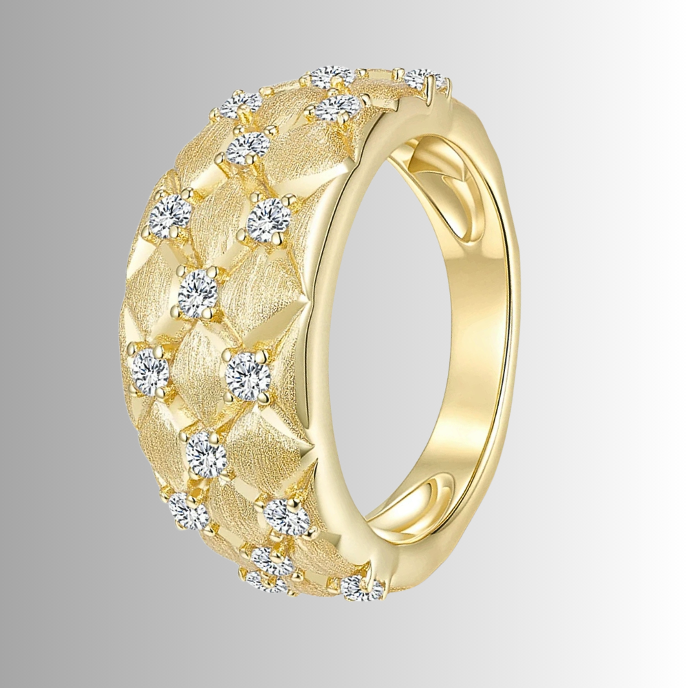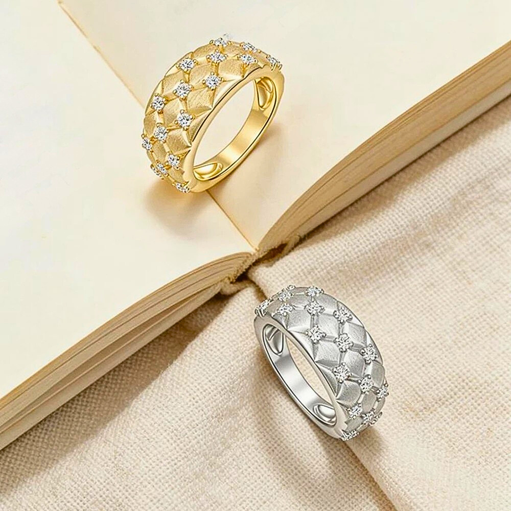Questa fascia interpreta l’idea della trapuntatura in chiave orafa, trasformando un motivo tessile in un segno grafico elegante e contemporaneo. La forma bombata regala presenza alla mano, ma mantiene equilibrio e misura. È un gioiello pensato per chi ama le superfici lavorate, i dettagli studiati e una luminosità distribuita con criterio.