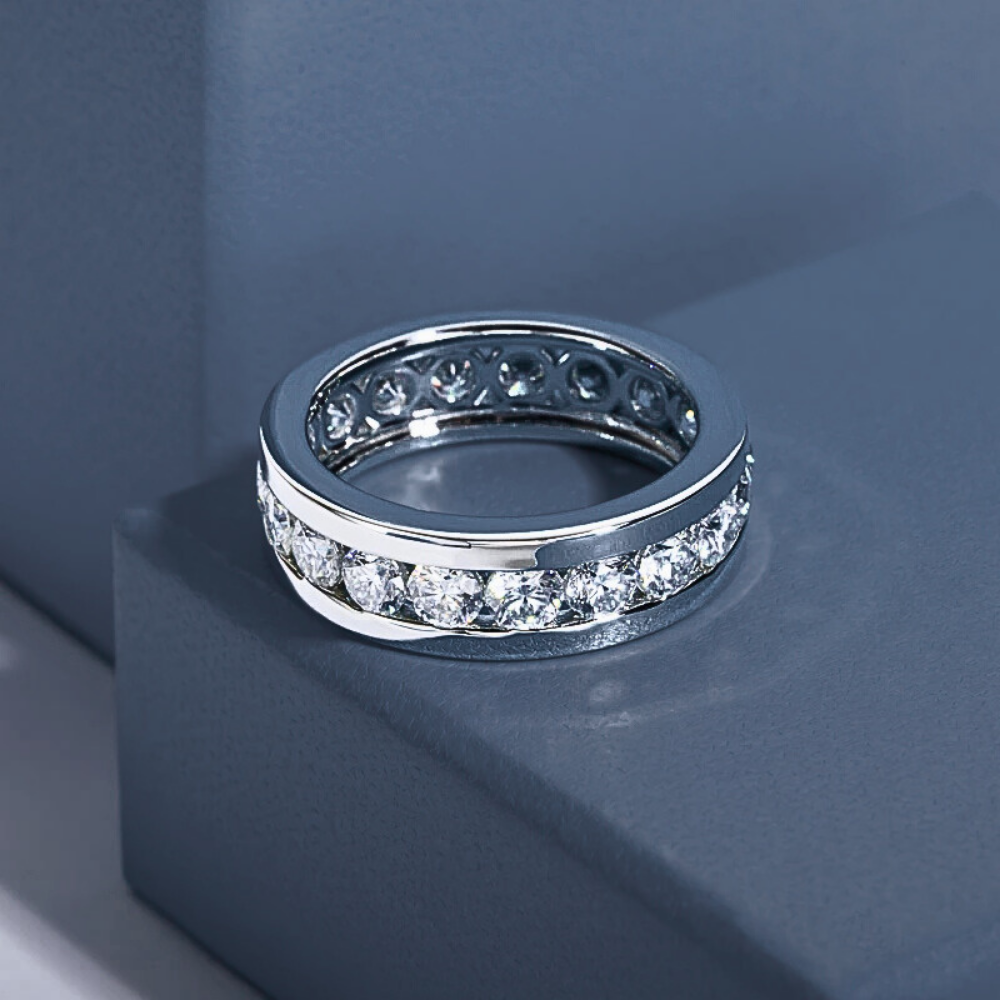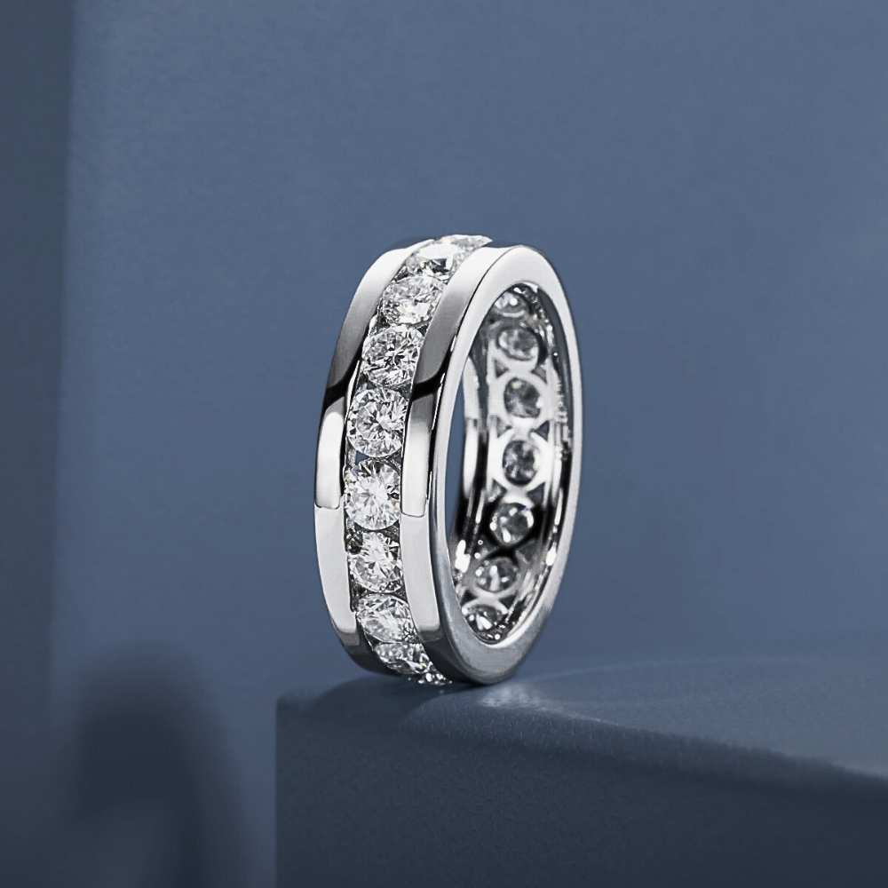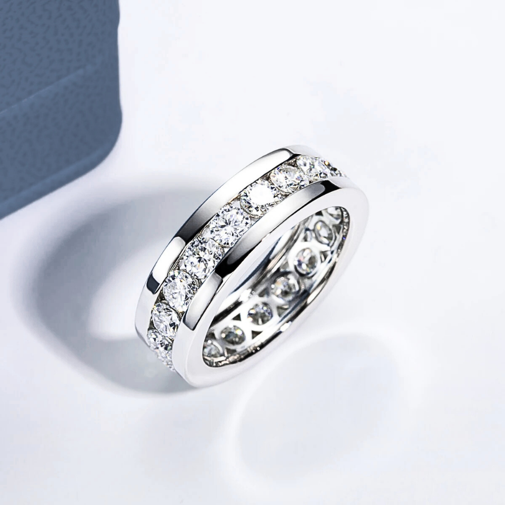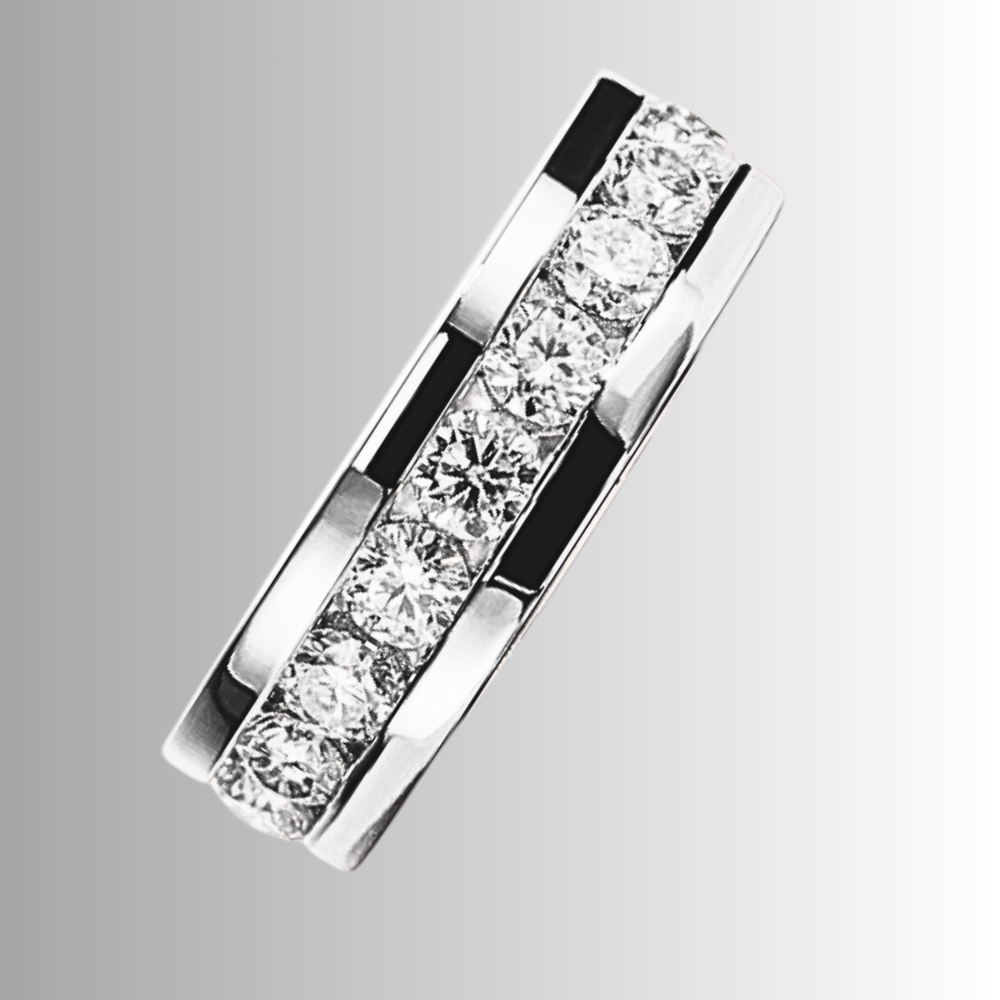 Al centro del design, un binario lineare accoglie moissaniti D Color VVS1 da 4 mm, incastonate con precisione millimetrica. La disposizione regolare garantisce continuità visiva e brillantezza costante, offrendo un effetto luminoso armonico che cattura ogni riflesso.