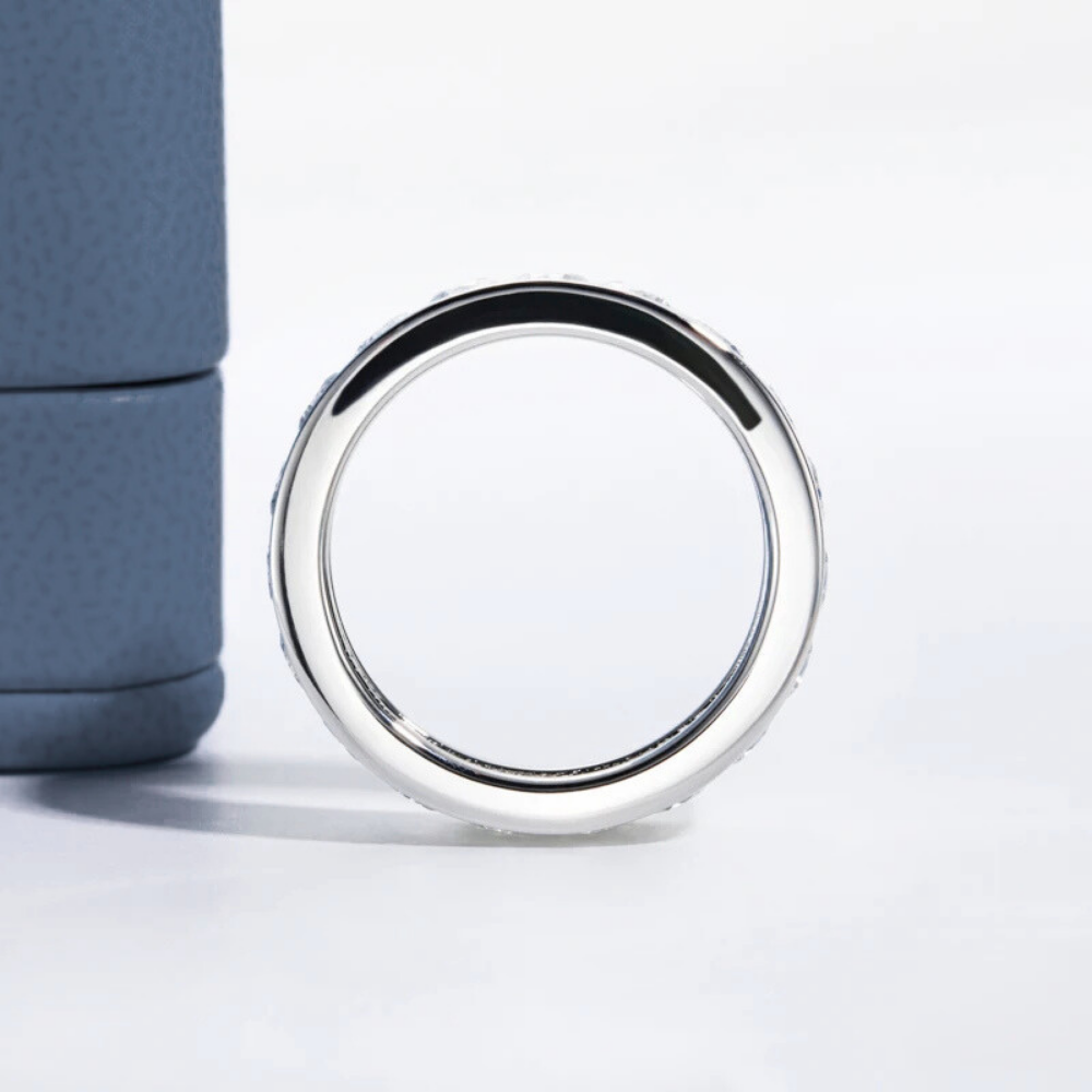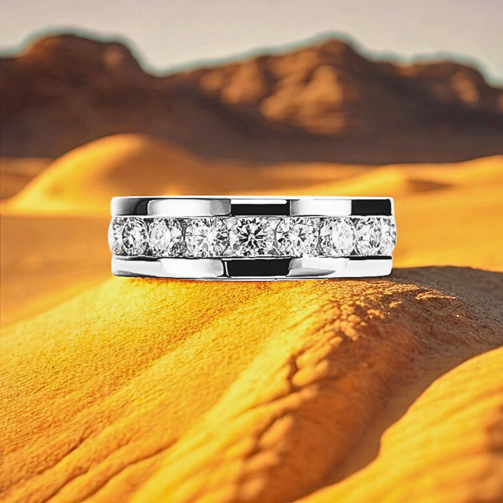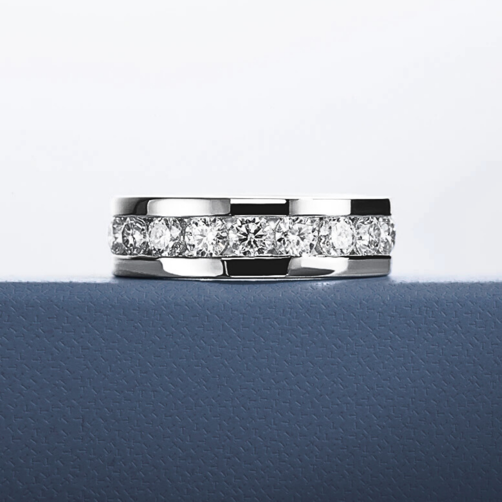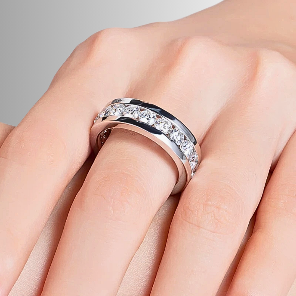 Al centro del design, un binario lineare accoglie moissaniti D Color VVS1 da 4 mm, incastonate con precisione millimetrica. La disposizione regolare garantisce continuità visiva e brillantezza costante, offrendo un effetto luminoso armonico che cattura ogni riflesso.