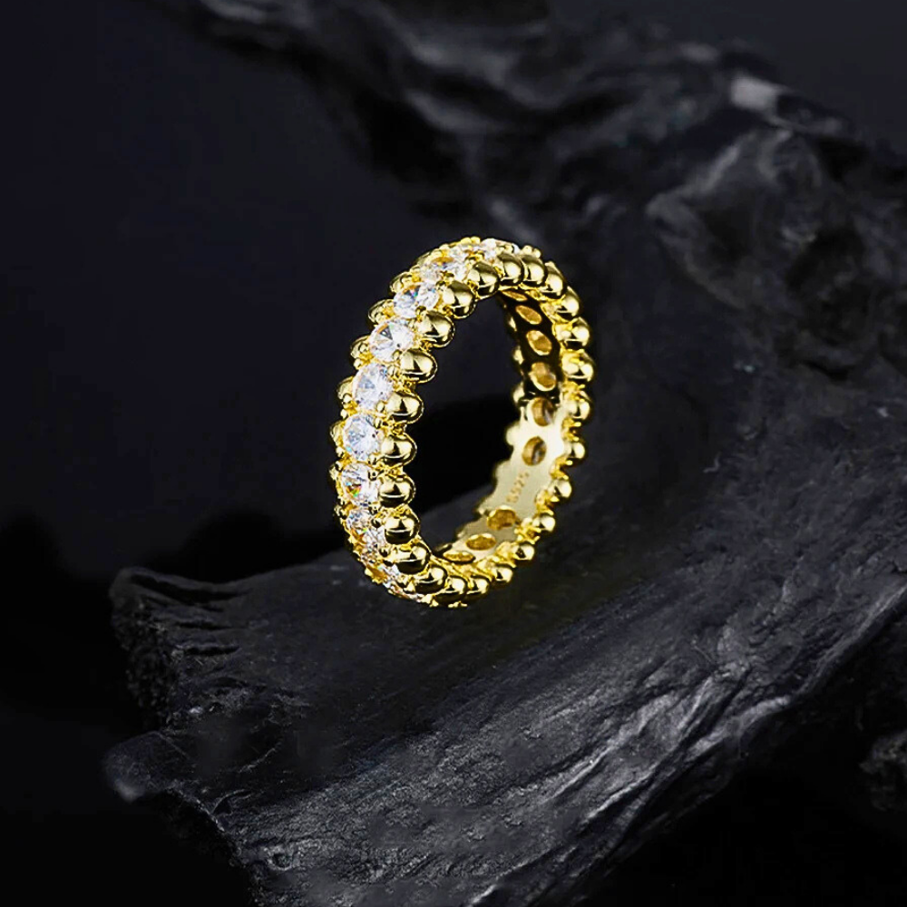 La fascia accoglie al centro 24 moissaniti D color VVS1 da 3,00 mm ciascuna, per un totale di 2,40 carati complessivi. Ogni pietra, certificata GRA, presenta un taglio calibrato per massimizzare rifrazione e purezza visiva, creando una linea di luce uniforme e intensa. Le gemme sono disposte in sequenza perfettamente allineata, generando l’effetto eternity, simbolo di continuità e armonia. La loro dimensione garantisce presenza e brillantezza, mantenendo però una proporzione elegante e bilanciata sulla mano.