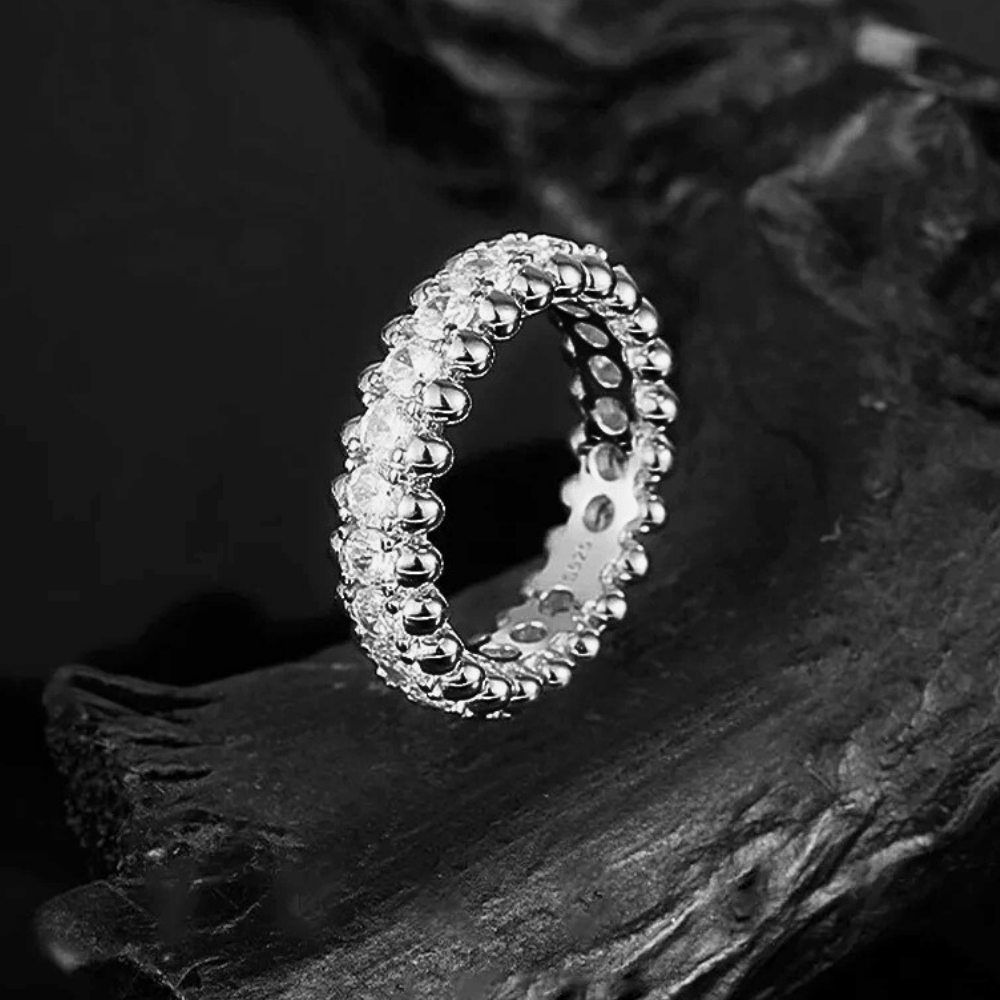 Ai lati della striscia centrale si sviluppa una bordatura tridimensionale leggermente rialzata rispetto al piano delle pietre. È composta da micro sfere in metallo lucido che si susseguono senza interruzioni, creando una cornice architettonica raffinata e protettiva. Ogni anello è disegnato, realizzato e rifinito interamente a mano in Argento Sterling 925, metallo scelto per stabilità, resistenza e qualità strutturale. La tripla placcatura può essere selezionata in oro bianco con rodiatura finale oppure in oro giallo. La rodiatura incrementa brillantezza e protezione dall’ossidazione, contribuendo a preservare la superficie nel tempo. La precisione degli incastri, l’uniformità delle sfere e l’allineamento delle gemme testimoniano una lavorazione eseguita con competenza avanzata.