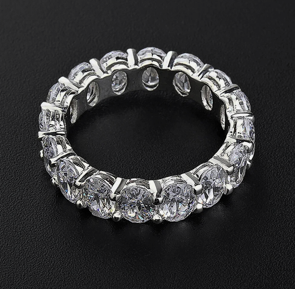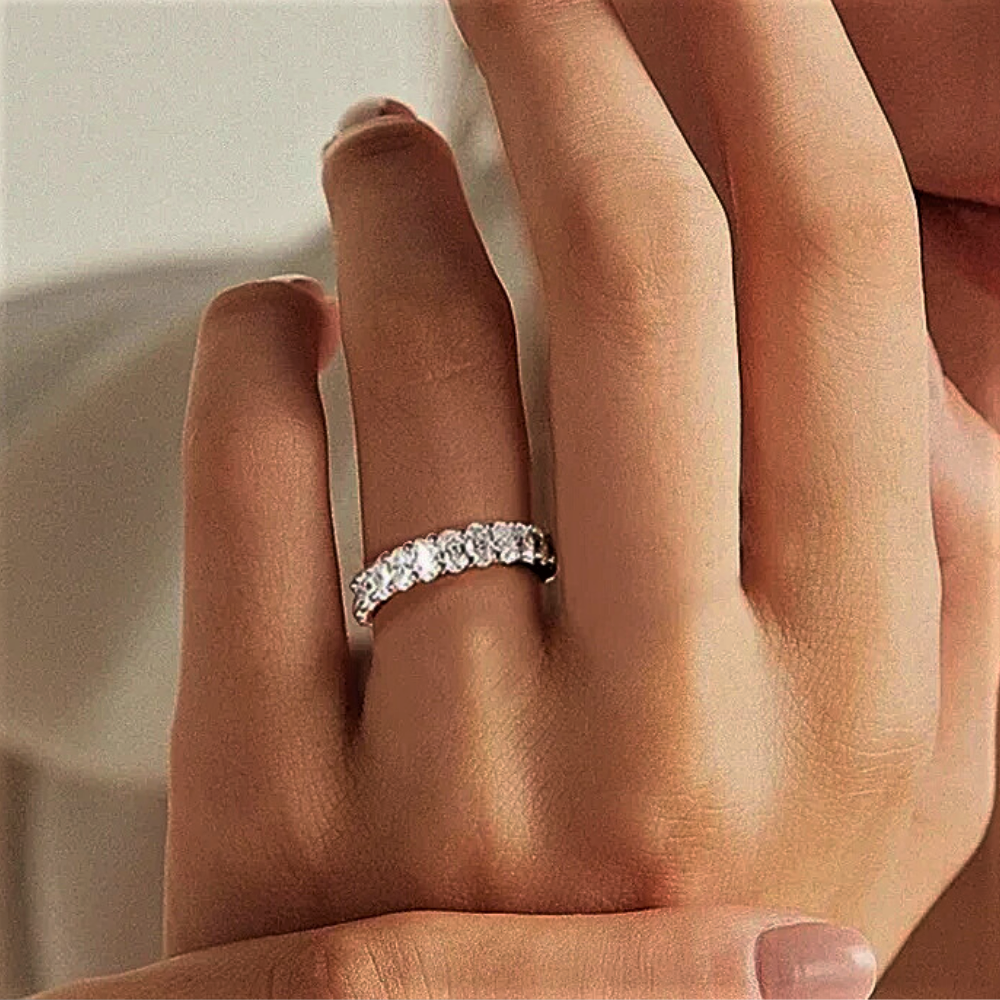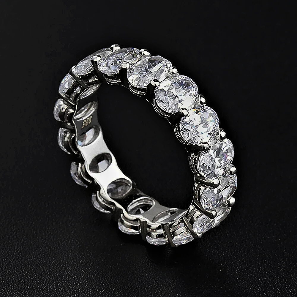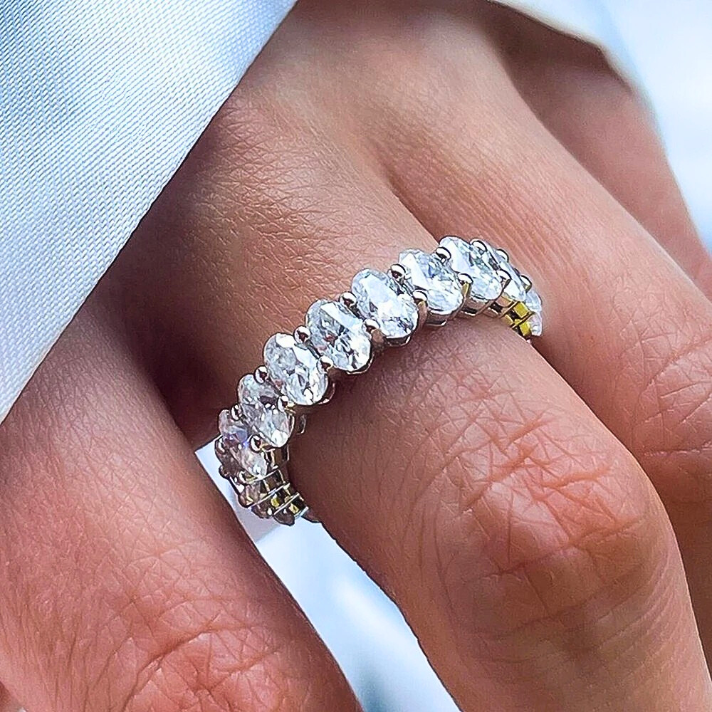 Questa fedina eternity con moissaniti taglio ovale racconta una storia di precisione e armonia. Le pietre, disposte lungo tutta la circonferenza, formano un flusso luminoso uniforme che cattura lo sguardo senza essere invadente. Il design lineare e calibrato valorizza la mano con naturalezza, creando un gioiello elegante che accompagna ogni gesto con discrezione.