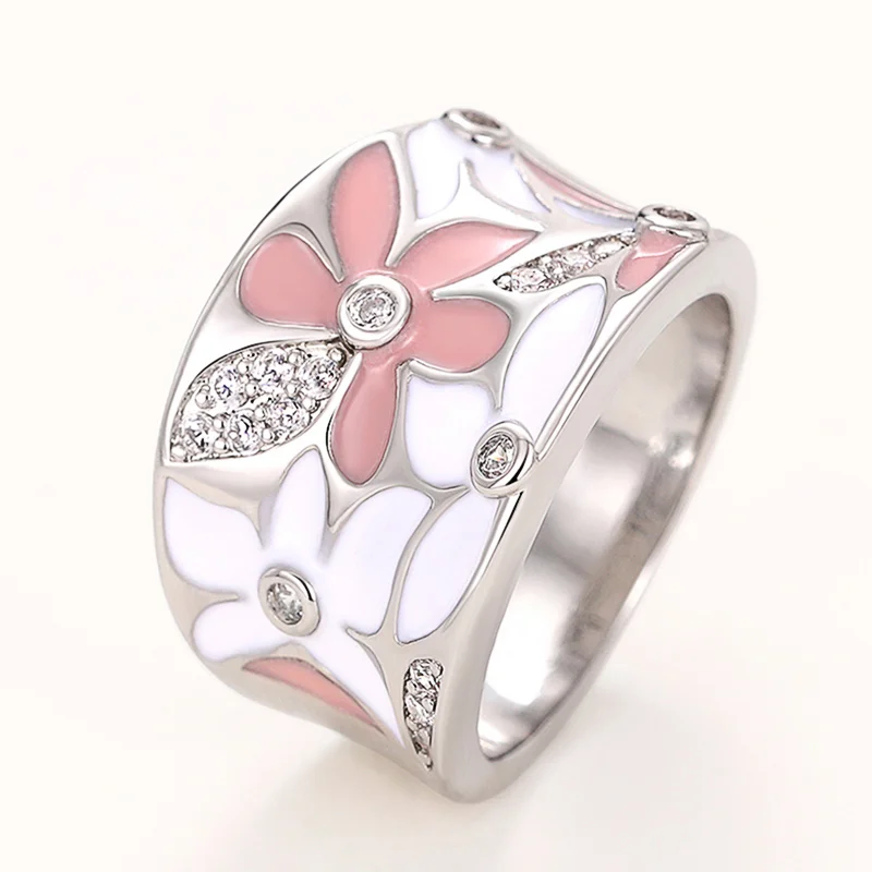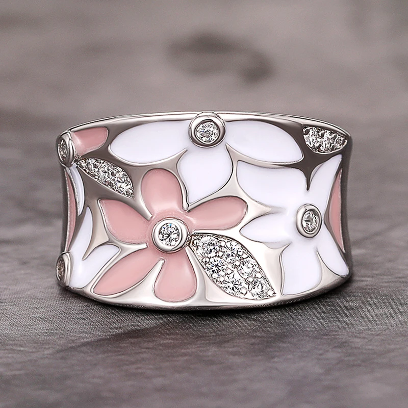 Huitan Aesthetic Enamel Flower Finger Ring for Women Wedding Party New 2023 Ring Silver Color Luxury Cubic Zirconia Jewelry Gift