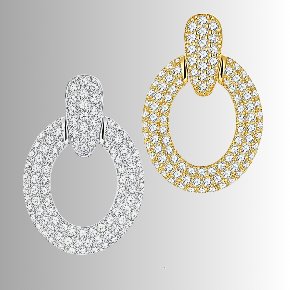 Questi orecchini pendenti con pavé di moissaniti interpretano l’eleganza classica con un design che mette la luce al centro della scena. La struttura importante ma armoniosa crea una composizione che valorizza il viso con riflessi intensi e continui, mantenendo sempre una linea raffinata e ordinata. La forma a goccia che sostiene l’elemento ovale introduce movimento e profondità visiva. Ogni superficie riflette la luce in modo diverso, generando una brillantezza diffusa che accompagna i gesti con naturalezza. Non è un gioiello discreto, ma un accessorio pensato per chi ama indossare la luce con sicurezza e carattere. Il risultato è un equilibrio tra eleganza e personalità: un modello luminoso, strutturato e deciso, capace di completare uno stile sofisticato senza perdere la sua essenzialità.