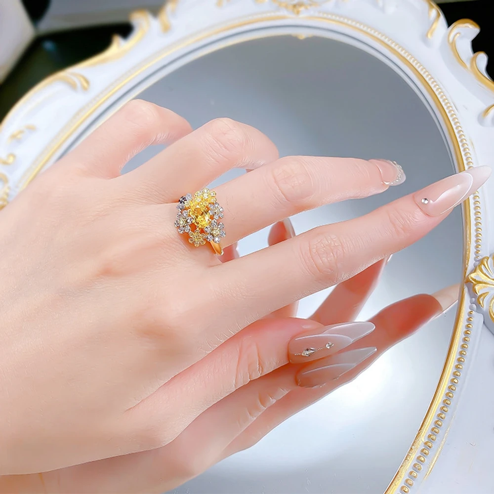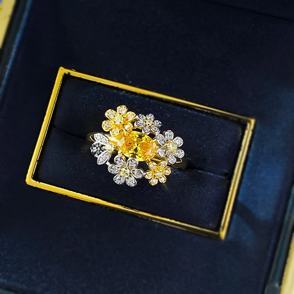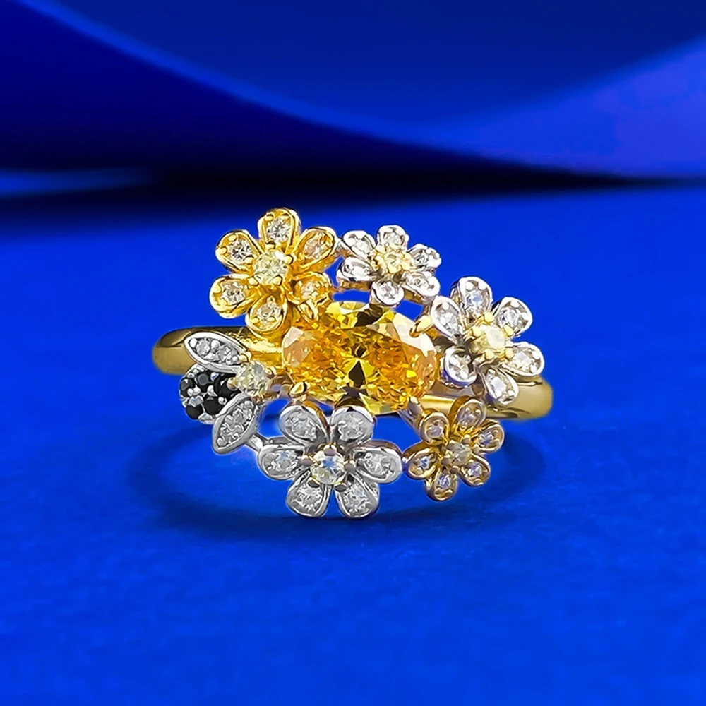 Wong Rain 925 Sterling Silver Oval Cut Citrine High Carbon Diamond Gems Flower Ring for Women Fine Jewelry Anniversary Gifts