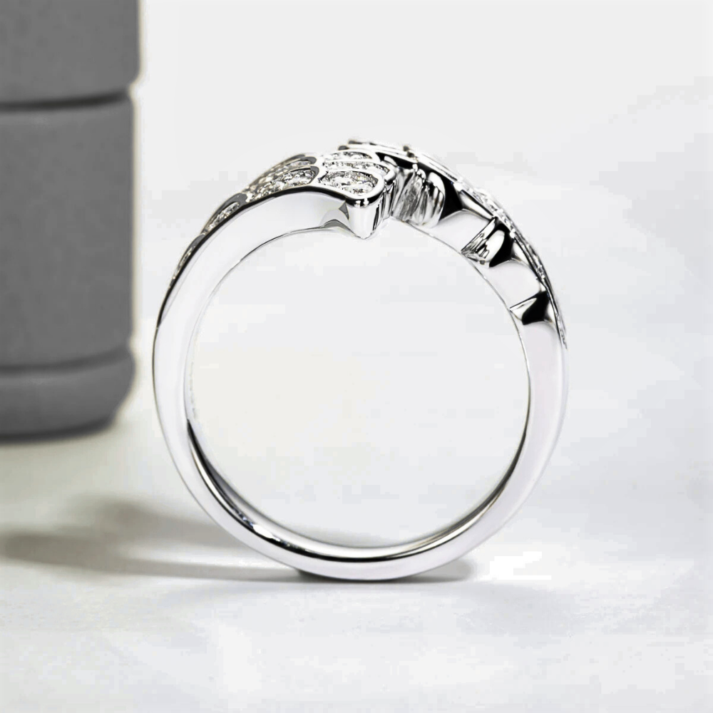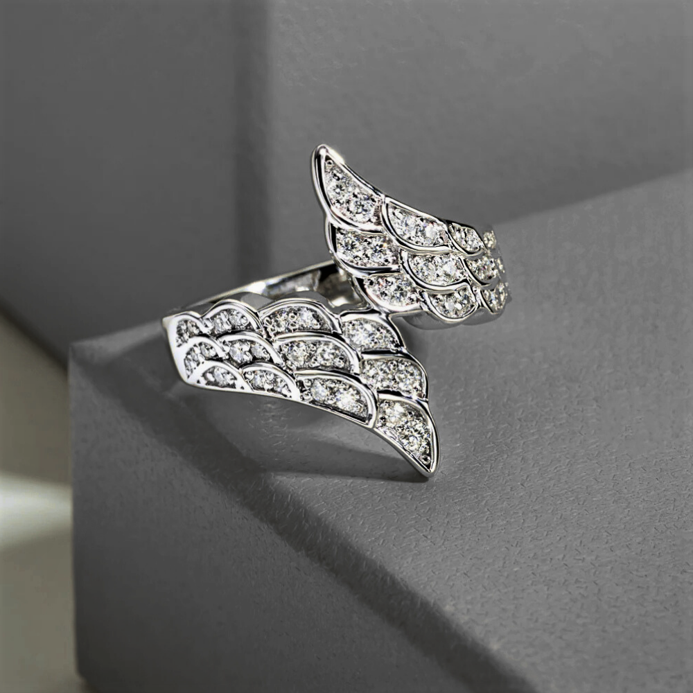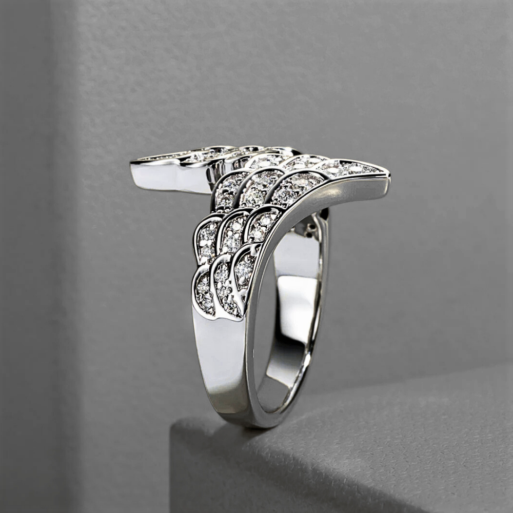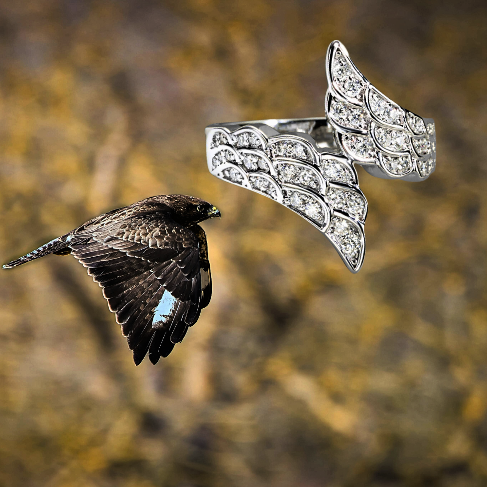 Questo anello prende forma da una visione stilistica decisa, in cui due ali contrapposte si avvicinano, definendo una struttura tridimensionale aperta, fluida e ben proporzionata. Il design contrariè crea un dialogo visivo continuo, dando al gioiello una presenza riconoscibile ma misurata. Le ali, richiamo universale a libertà e slancio, suggeriscono l’idea di movimento e autonomia senza bisogno di forzature narrative: il simbolo resta elegante, lasciando spazio all’interpretazione personale. La luce accompagna le linee con naturalezza, valorizzando la mano in modo armonioso e discreto, senza appesantire la forma complessiva del gioiello.