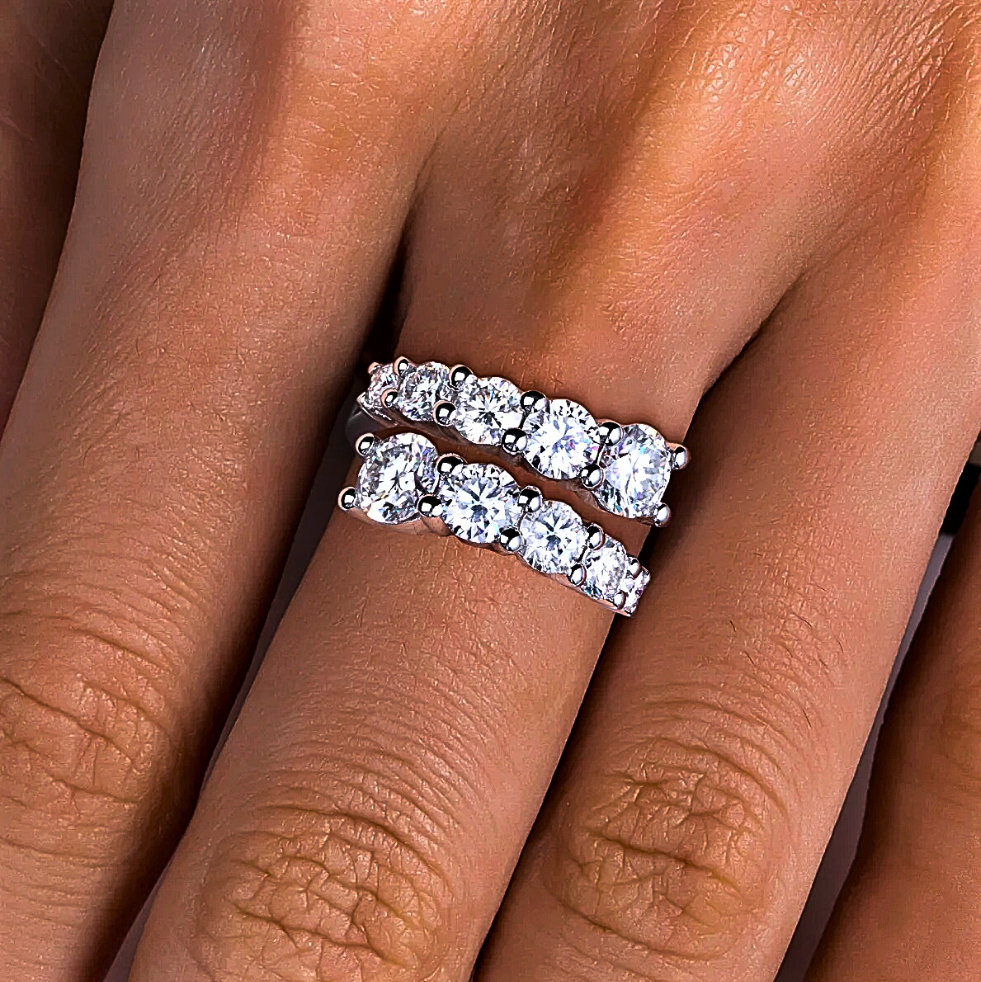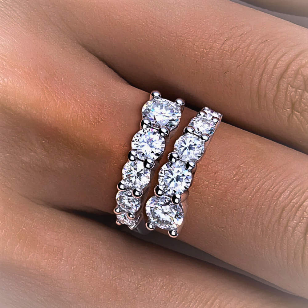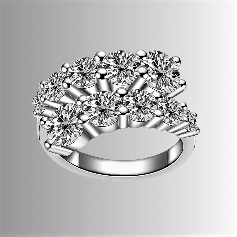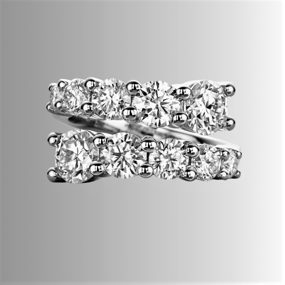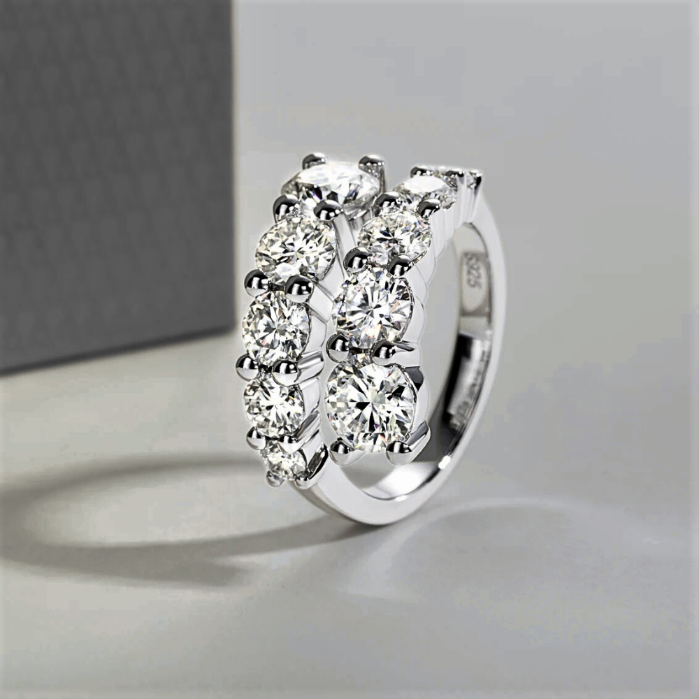 Il design aperto segue le linee naturali del dito, permettendo all’anello di adattarsi al gesto e alla postura della mano in modo armonioso. La disposizione sfalsata delle pietre crea una continuità visiva che accompagna il movimento, mentre i riflessi delle gemme cambiano leggermente con l’angolazione della luce, rendendo il gioiello interessante da osservare da ogni lato. Questa struttura permette di ottenere leggerezza sul dito, garantendo comfort durante l’uso quotidiano. L’effetto complessivo è un equilibrio tra presenza e discrezione, dove la sequenza di moissaniti guida lo sguardo lungo il profilo dell’anello senza appesantire la linea.