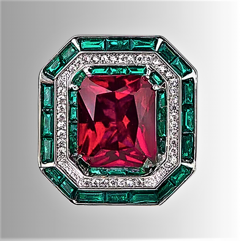 Rodeado de diamantes sintéticos de talla brillante blanca de calidad superior, la piedra central se realza aún más con dos bandas laterales de esmeraldas sintéticas de talla baguette , que añaden un nivel extra de valor, esplendor y lujo al diseño del anillo.