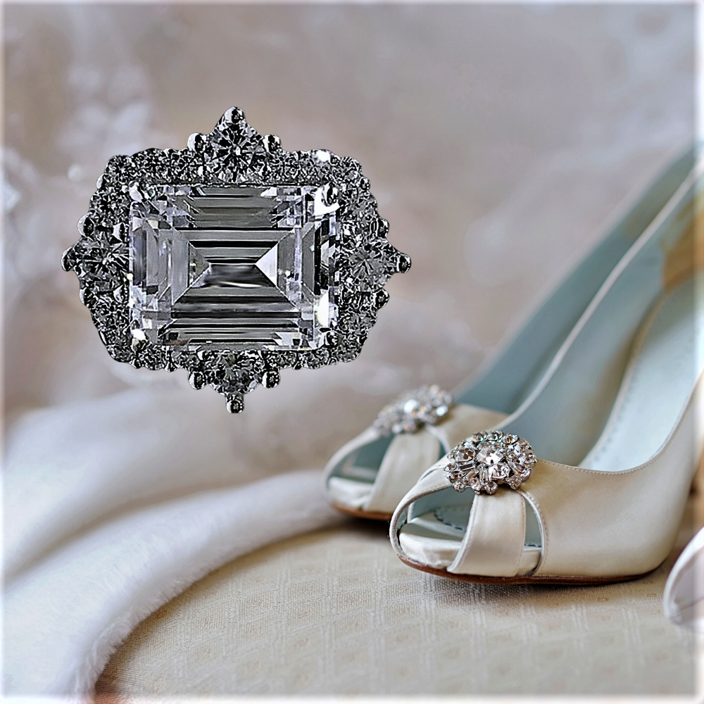 - Corona de Diamantes Sintéticos Talla Brillante : Rodeando la Talla Esmeralda, una corona de diamantes sintéticos talla brillante forma un hexágono alargado , un detalle único que amplifica el brillo del anillo, convirtiéndolo en un auténtico punto de luz.