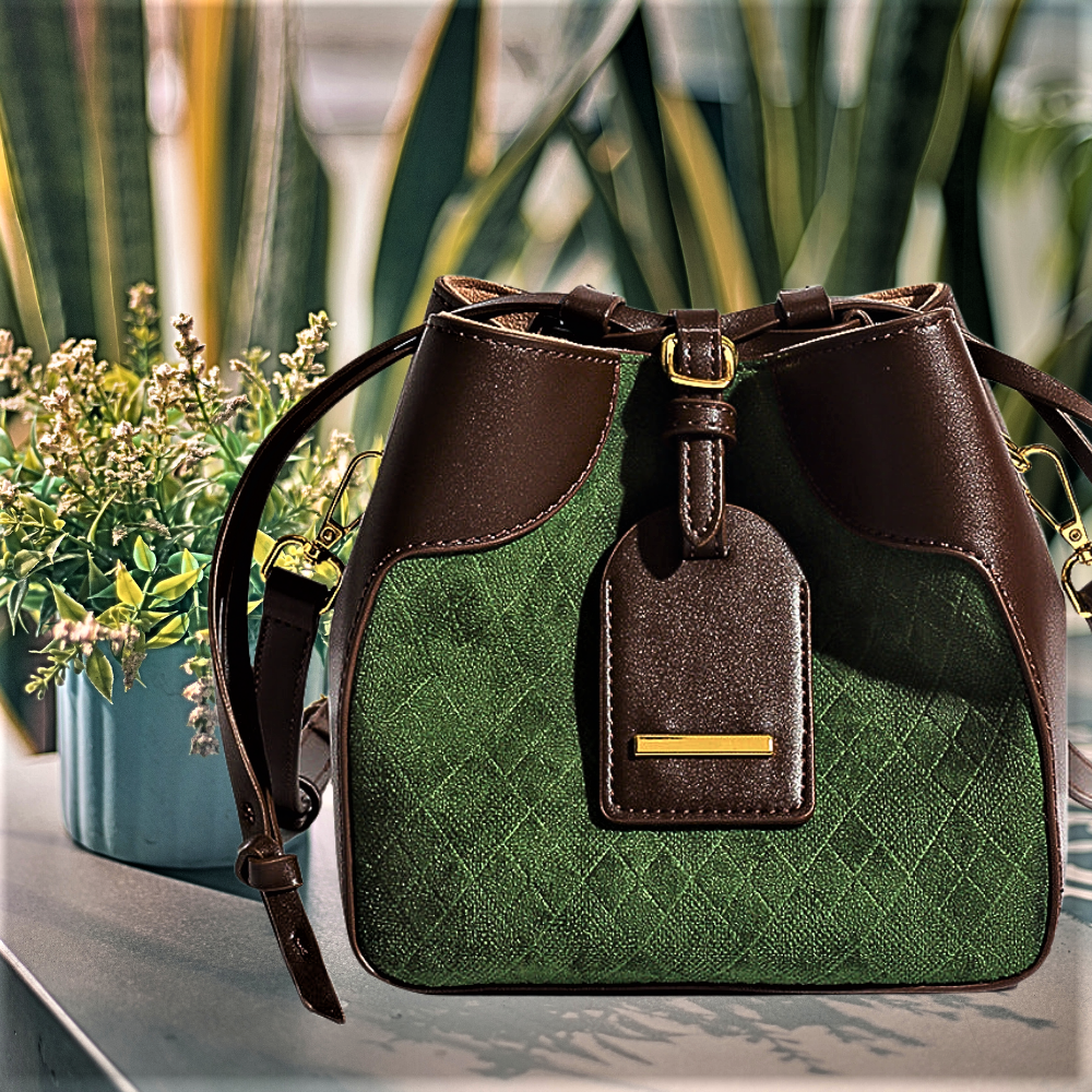 💥GlamLuxe presenta un Elegante y Sofisticado Bolso Bicolor de la Colección de Accesorios de Ropa que combina moda actual y funcionalidad . Un complemento de moda que respeta la tendencia actual de los Mini Bolsos con un toque de originalidad , gracias a su considerable capacidad. Disponible en dos variaciones de color : un verde oscuro intrigante y un marrón claro cálido para la parte de gamuza sintética trabajada con diamantes, combinado con un refinado cuero sintético marrón oscuro brillante . 👜