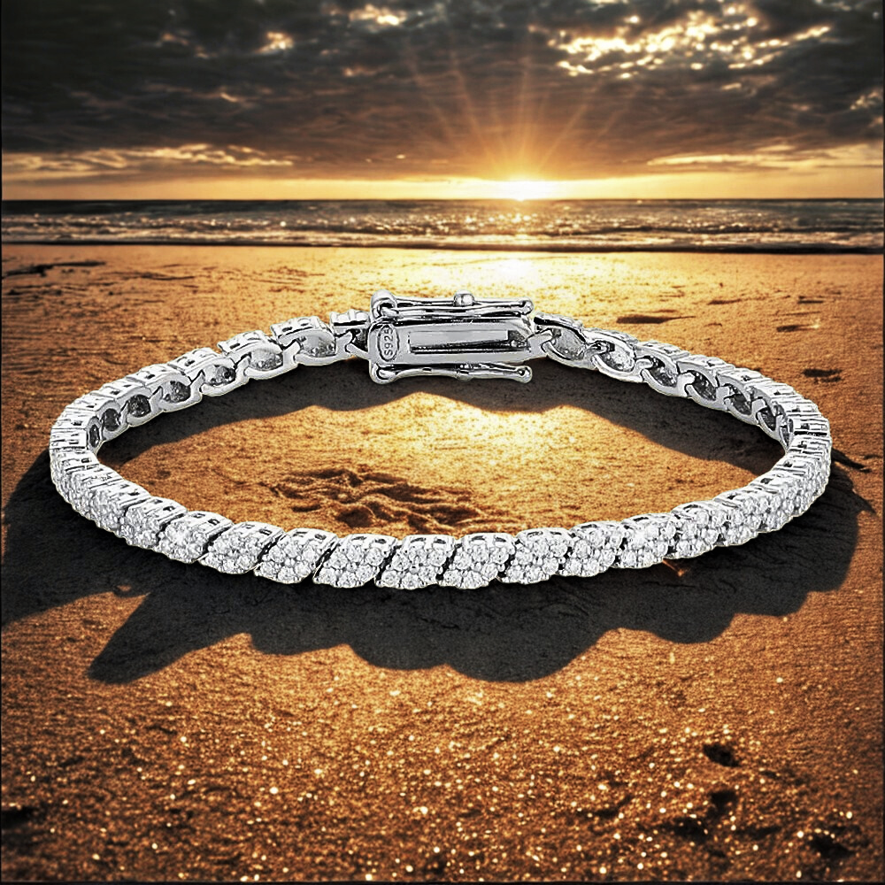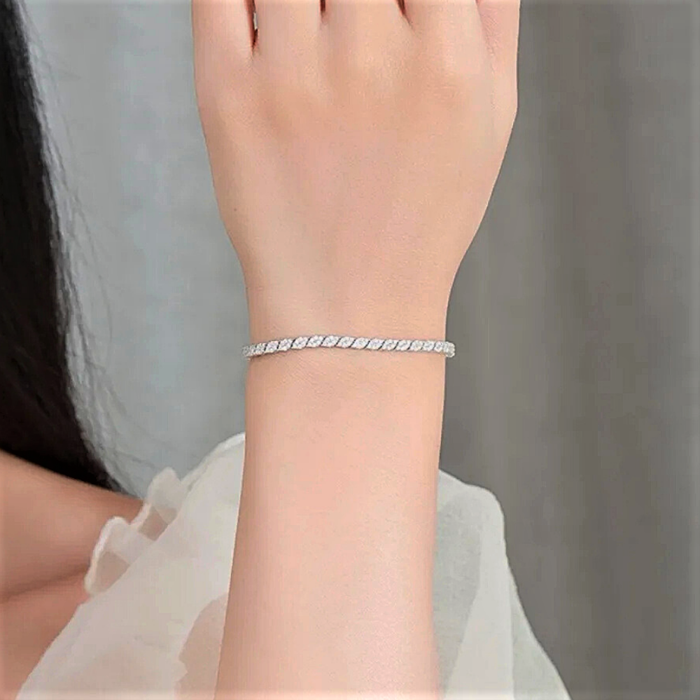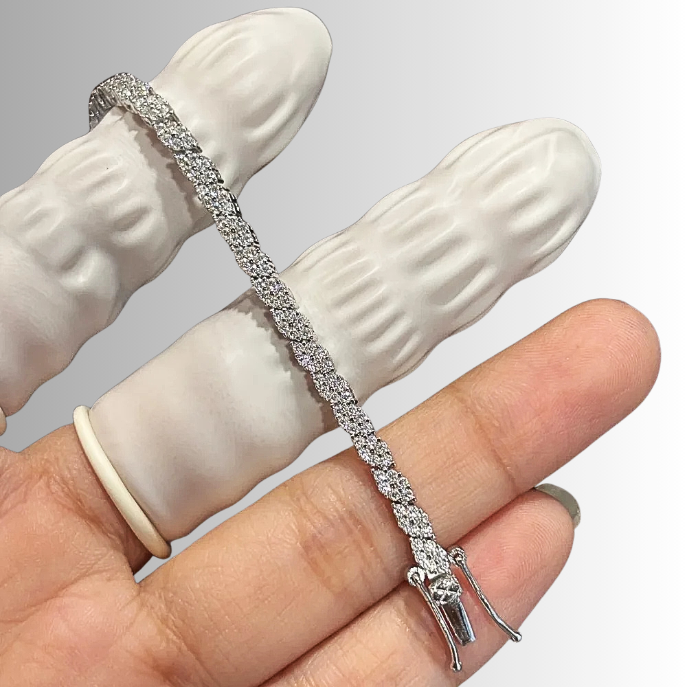 Questo bracciale nasce dall’incontro tra rigore geometrico e cura artigianale. La sequenza regolare di rombi allungati crea un ritmo visivo equilibrato, discreto ma estremamente luminoso, pensato per chi predilige gioielli raffinati, essenziali e ben costruiti. La luce non è affidata all’eccesso, ma alla ripetizione ordinata delle forme e alla qualità delle pietre, per un risultato elegante e moderno, adatto a ogni momento della giornata.