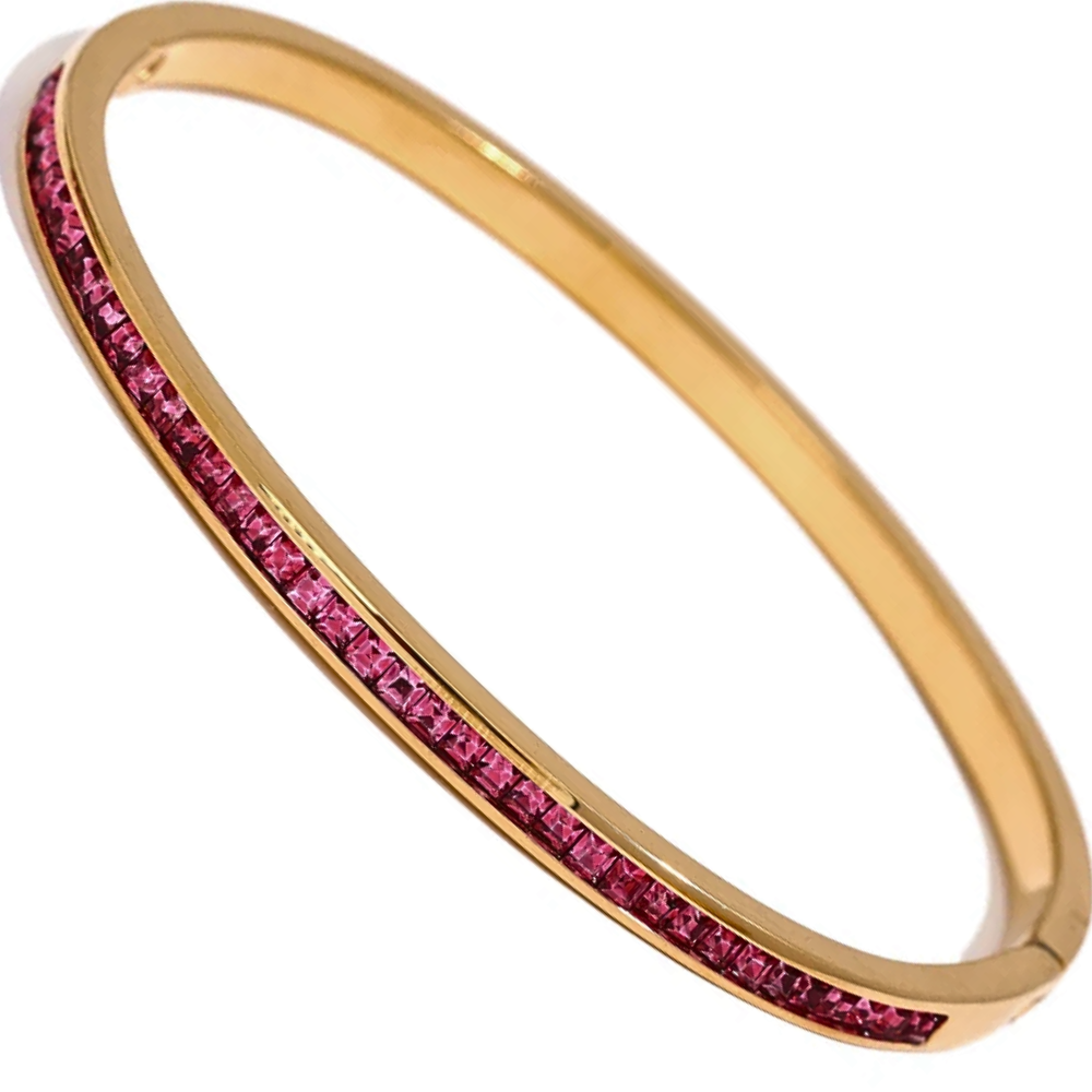 Las piedras de circonita cúbica de calidad AAA están colocadas mediante la técnica “track”, donde las gemas se colocan una al lado de la otra sin separaciones , creando un efecto de mosaico continuo. Esta disposición permite que las piedras capturen y reflejen la luz de una manera sorprendente, intensificando su brillo.