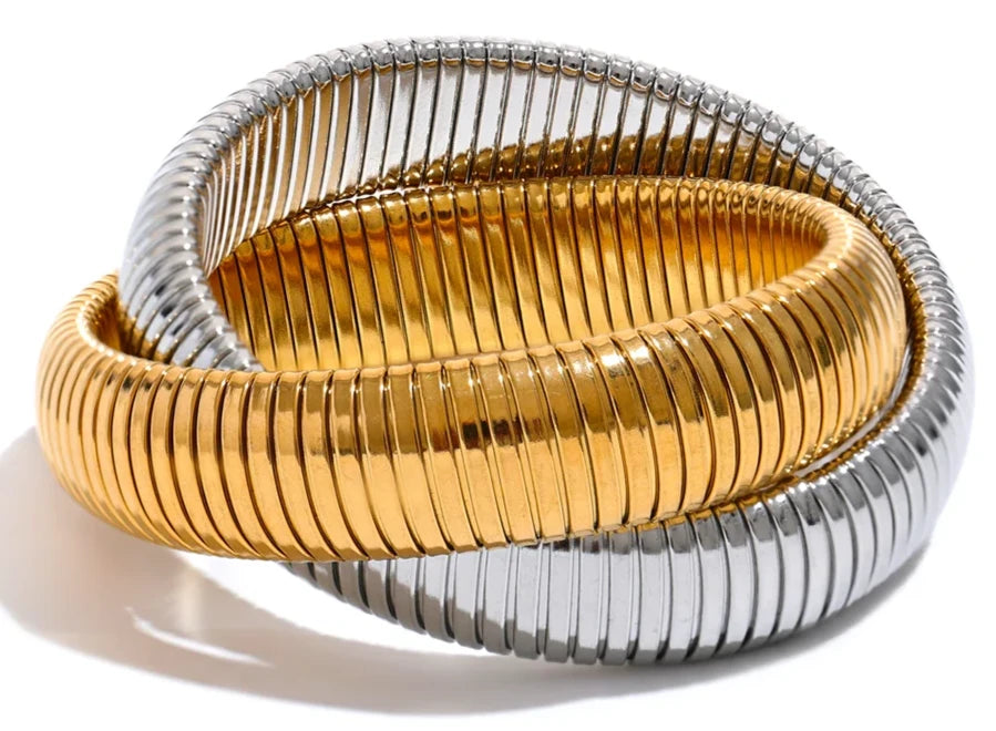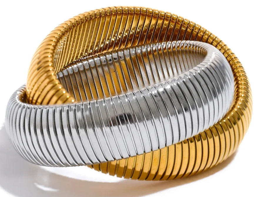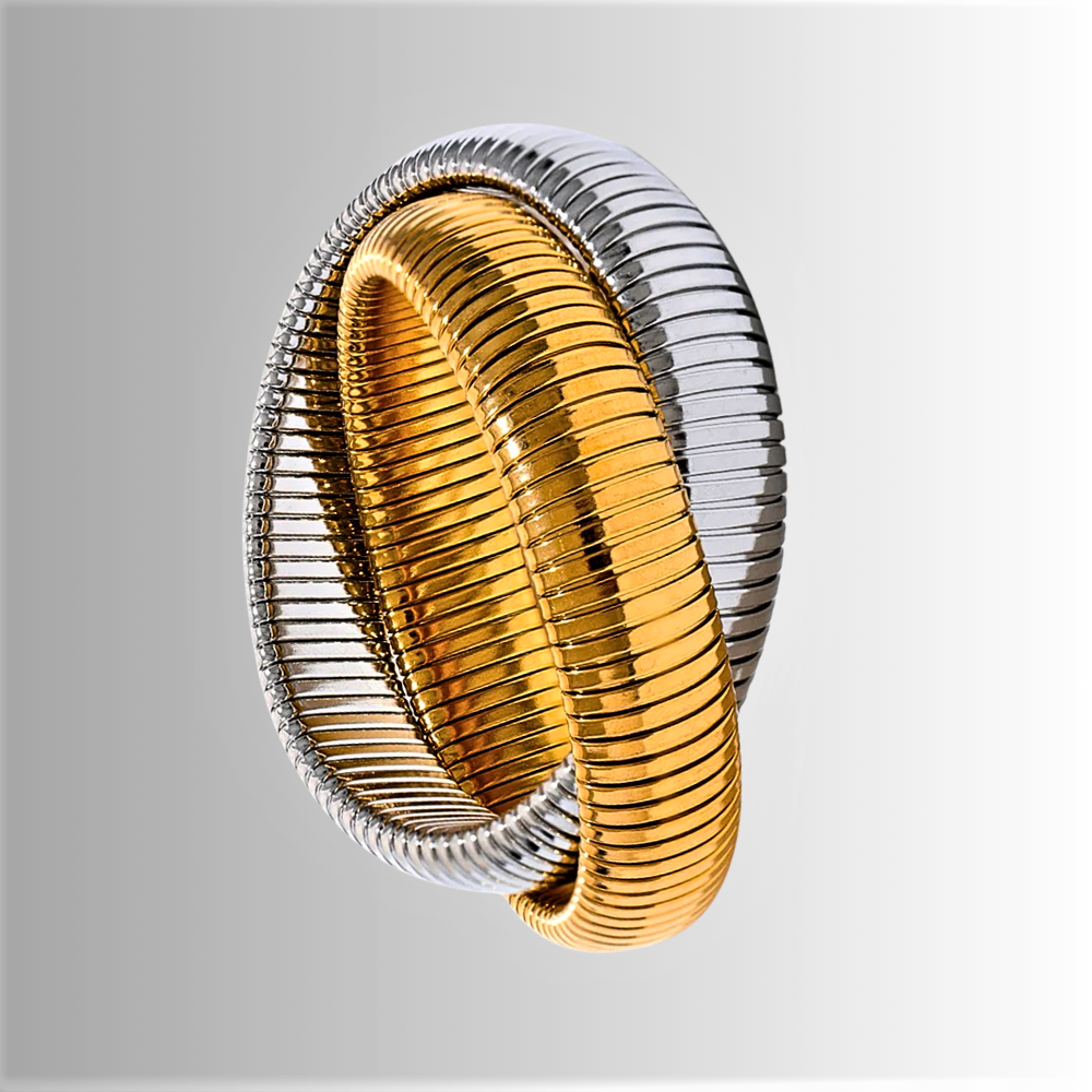 Compuesta por dos pulseras elásticas , una en oro amarillo y otra en oro blanco, entrelazadas entre sí, esta pulsera presenta un diseño en espiral enrollado sobre sí mismo inspirado en la forma de una tubería de gas, lo que le da un aspecto distintivo y moderno. Realizadas en oro amarillo de 18 quilates y acero inoxidable bañado en oro blanco, las dos pulseras elásticas se entrecruzan creando un efecto visual dinámico y cautivador.