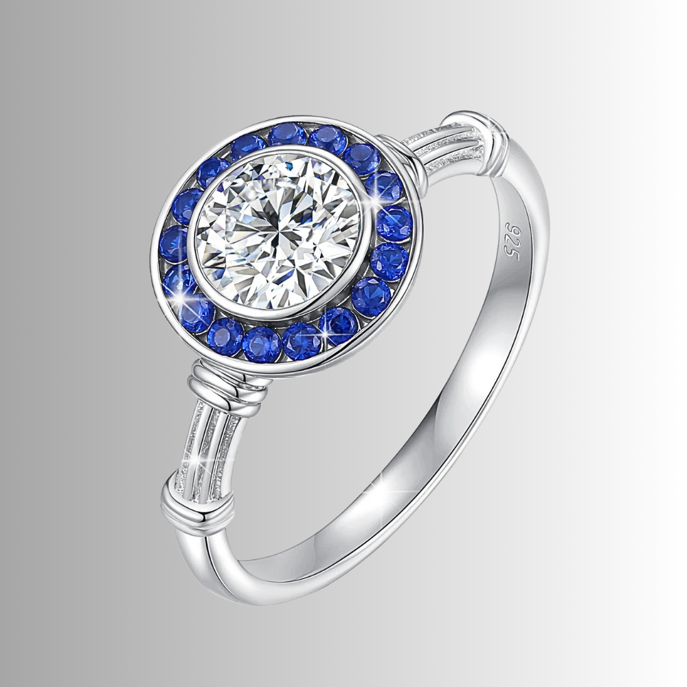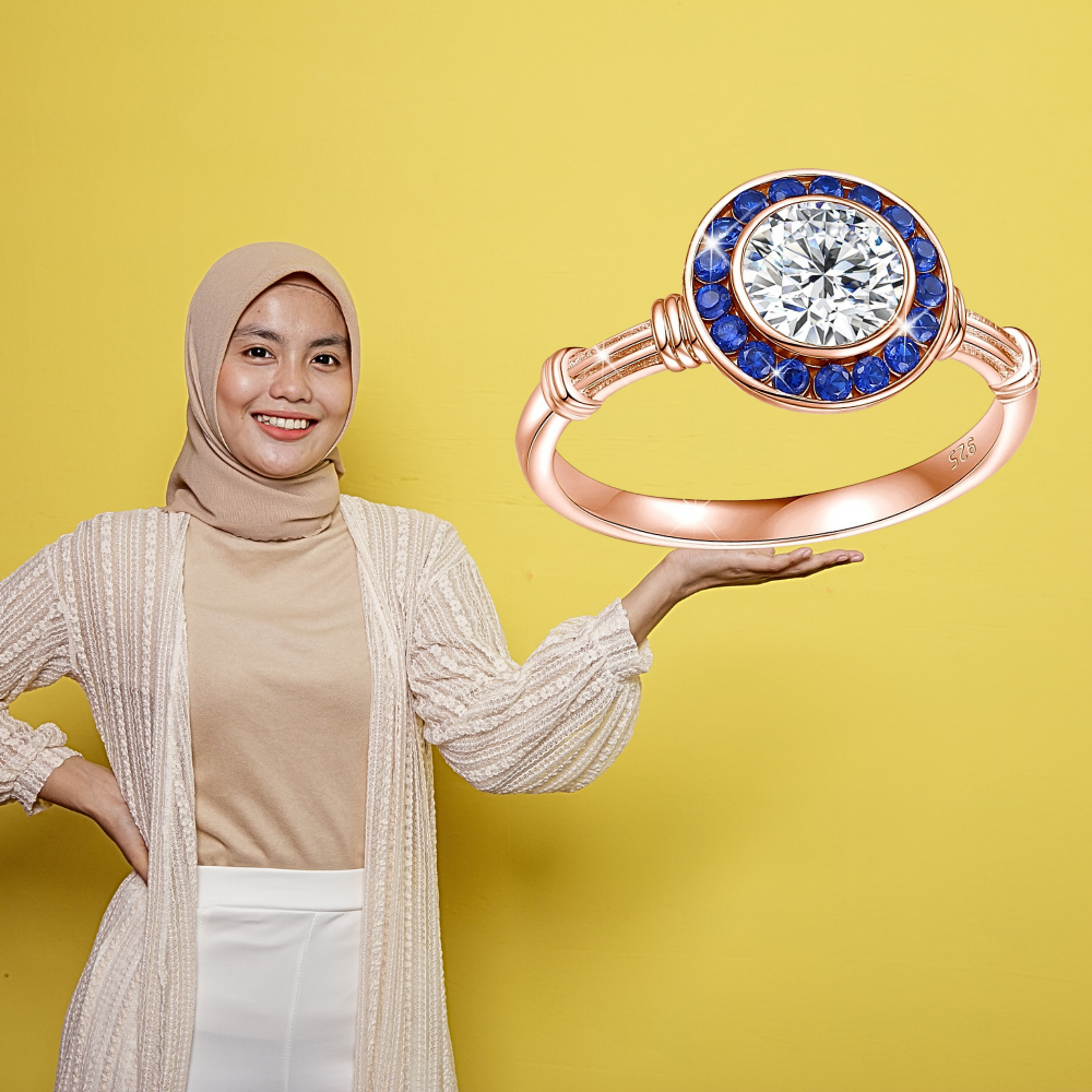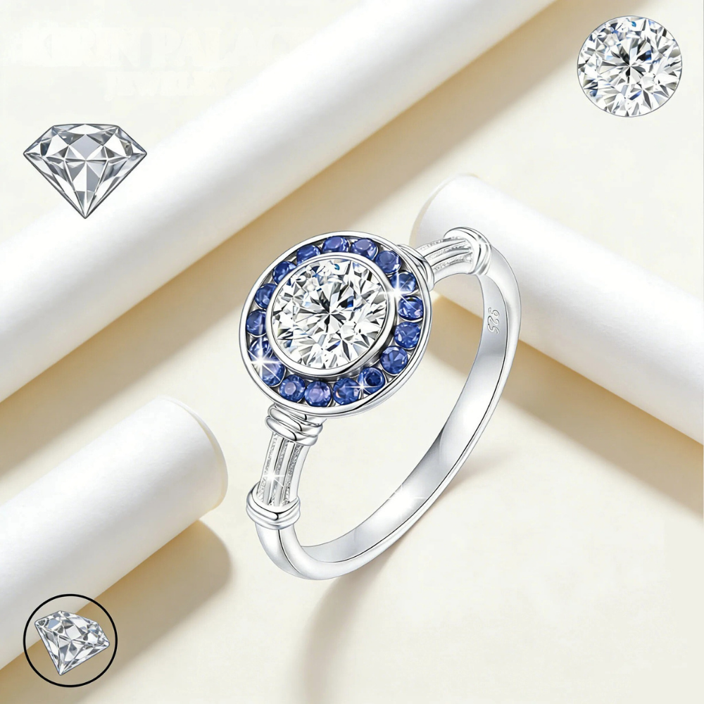 Al centro spicca una moissanite taglio brillante da 1,00 carato, certificata GRA, scelta per la sua elevata brillantezza e per un fuoco particolarmente vivace. La gemma è incastonata in un castone sottile che ne valorizza la presenza senza appesantire il profilo. A incorniciare la pietra centrale, una sequenza di gemme dal colore blu zaffiro intenso, disposte a binario lungo il gambo, crea una striscia cromatica continua e luminosa. Il risultato è un contrasto elegante, dal gusto leggermente retrò, che dona carattere all’anello mantenendo una linea sobria. Sotto il motivo centrale, il gambo introduce una pausa visiva inattesa: la linea si apre brevemente tra due volumi sagomati e viene raccordata da una sequenza di piccoli elementi cilindrici in metallo lucido. Questo dettaglio interrompe la continuità in modo controllato, aggiungendo luce e carattere al profilo dell’anello e rafforzandone l’identità senza alterarne l’equilibrio complessivo.