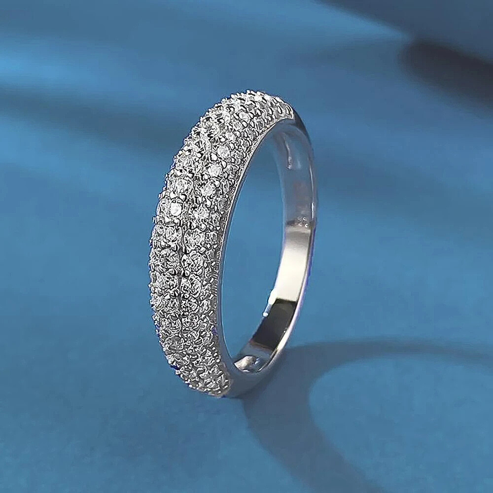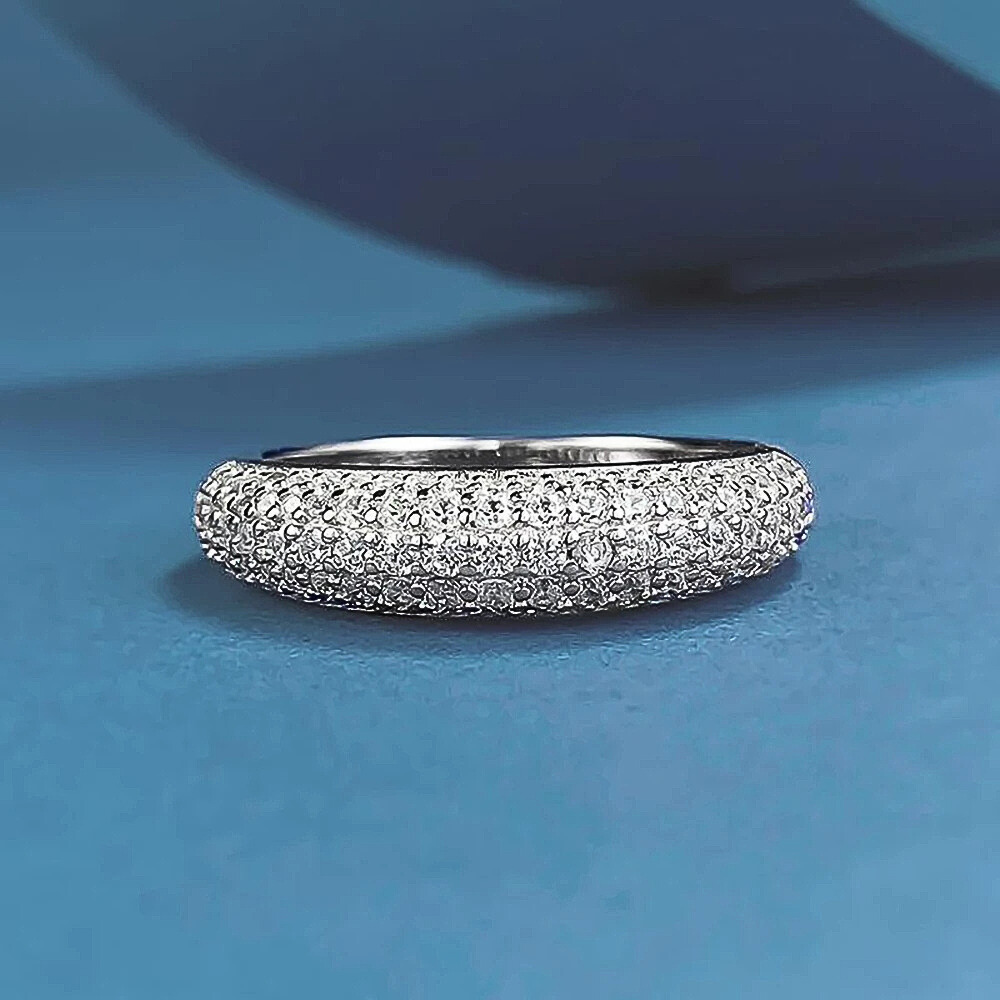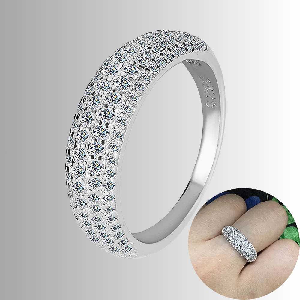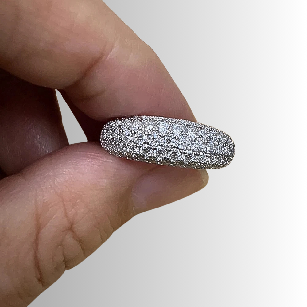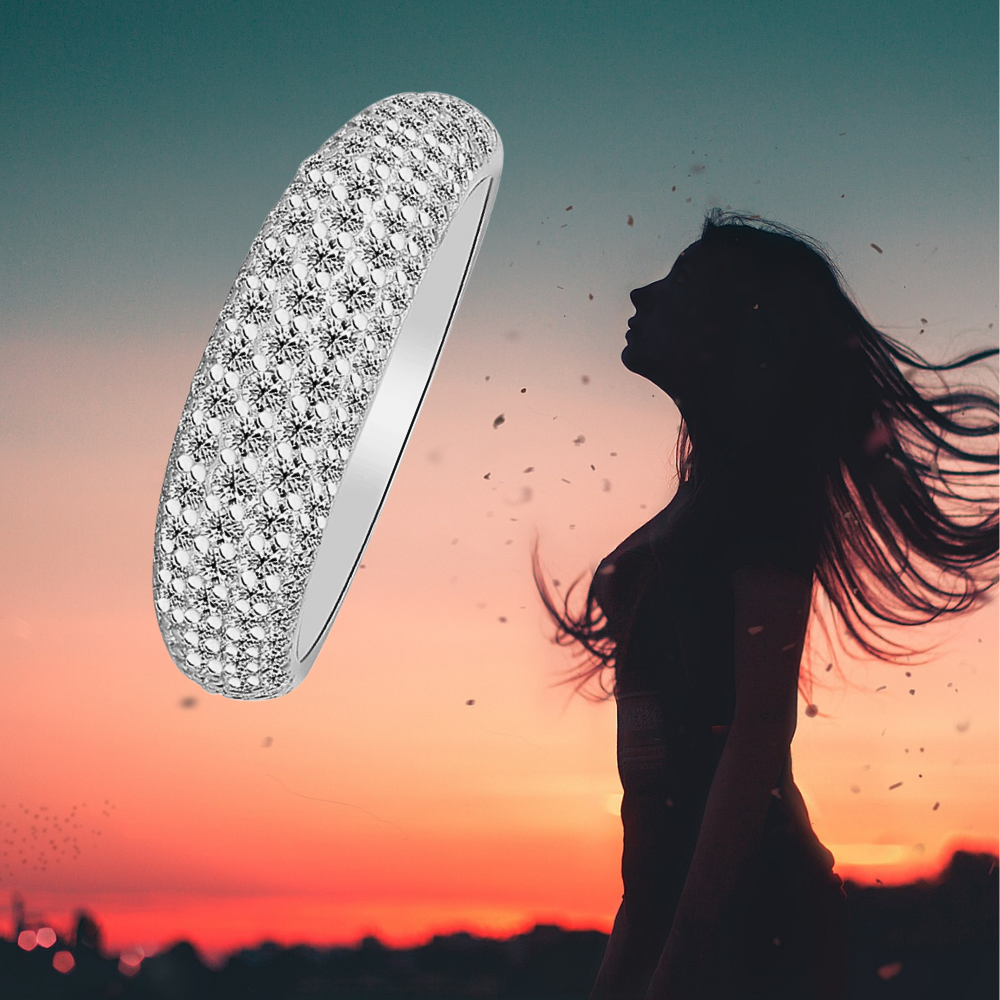 Cinque file regolari di micro moissaniti D Color taglio brillante, da 1,5 mm ciascuna, ricoprono la superficie dell’anello con una disposizione continua e precisa. Le pietre, certificate GRA, sono selezionate per garantire una brillantezza intensa e costante, capace di riflettere la luce in modo omogeneo lungo tutta la fascia. La caratura complessiva di 1,00 ct assicura un equilibrio perfetto tra luminosità e sobrietà.