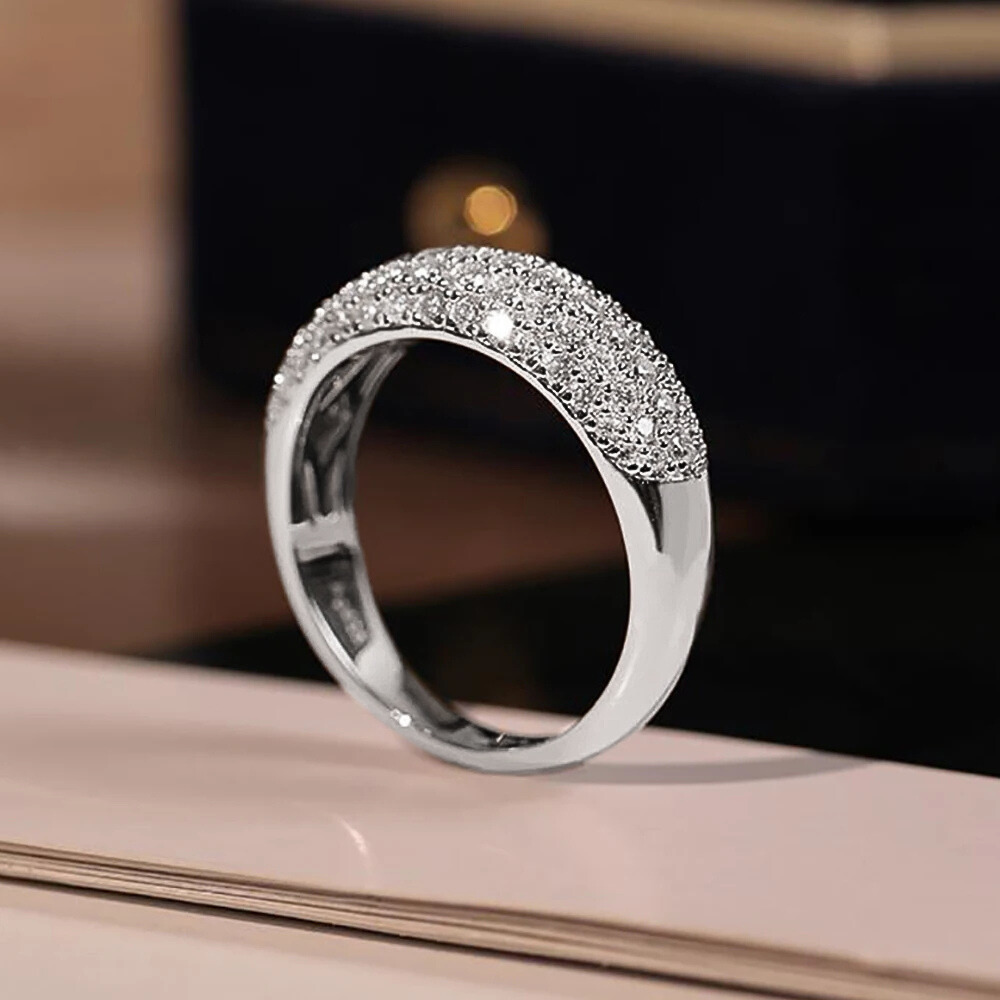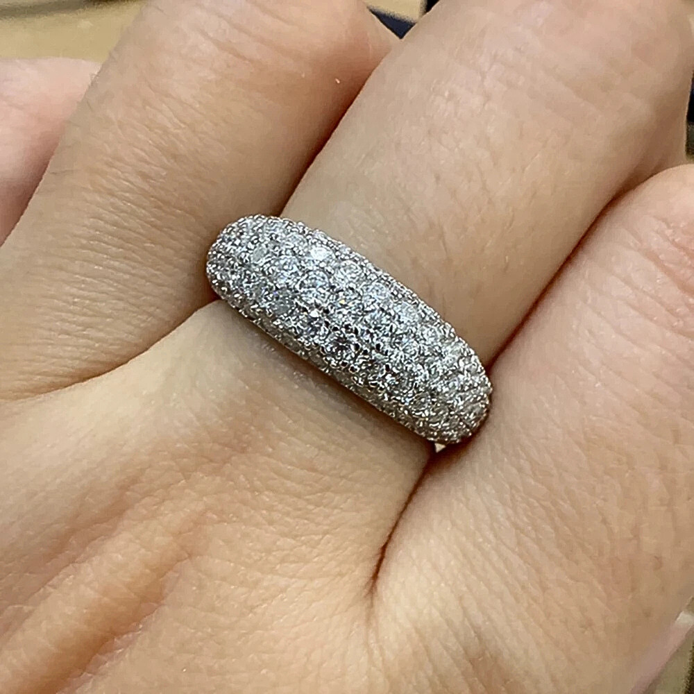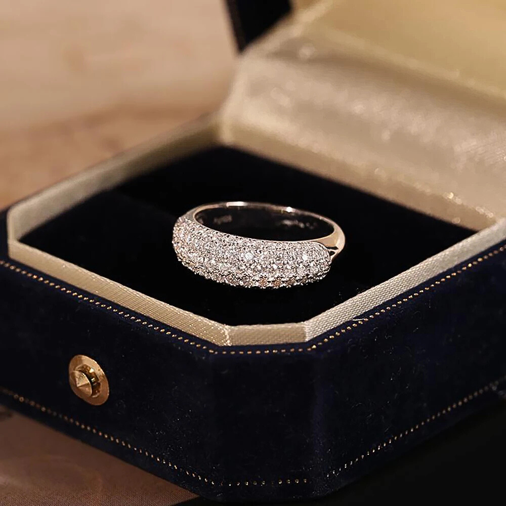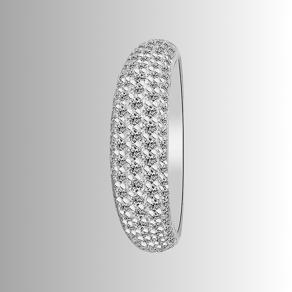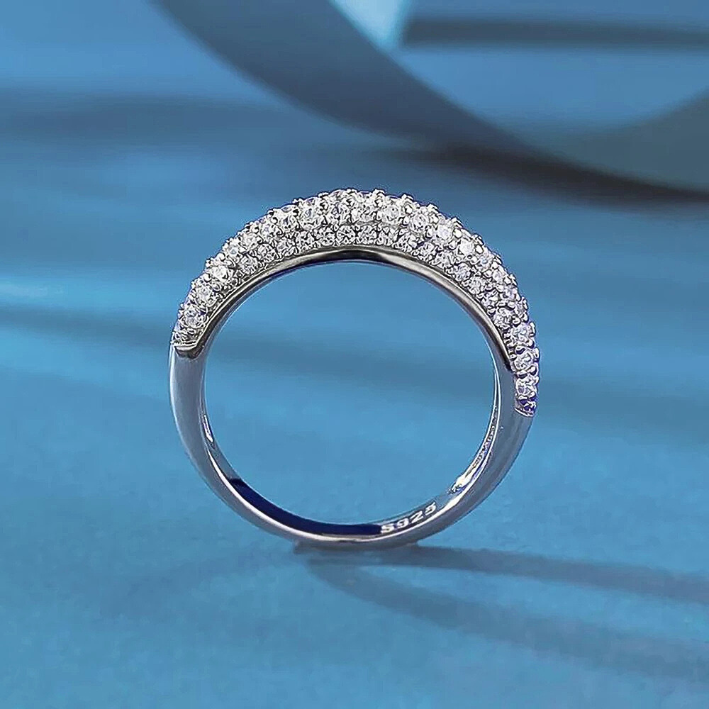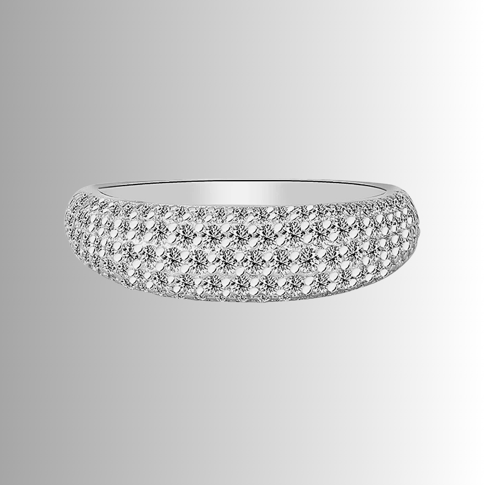 Cinque file regolari di micro moissaniti D Color taglio brillante, da 1,5 mm ciascuna, ricoprono la superficie dell’anello con una disposizione continua e precisa. Le pietre, certificate GRA, sono selezionate per garantire una brillantezza intensa e costante, capace di riflettere la luce in modo omogeneo lungo tutta la fascia. La caratura complessiva di 1,00 ct assicura un equilibrio perfetto tra luminosità e sobrietà.