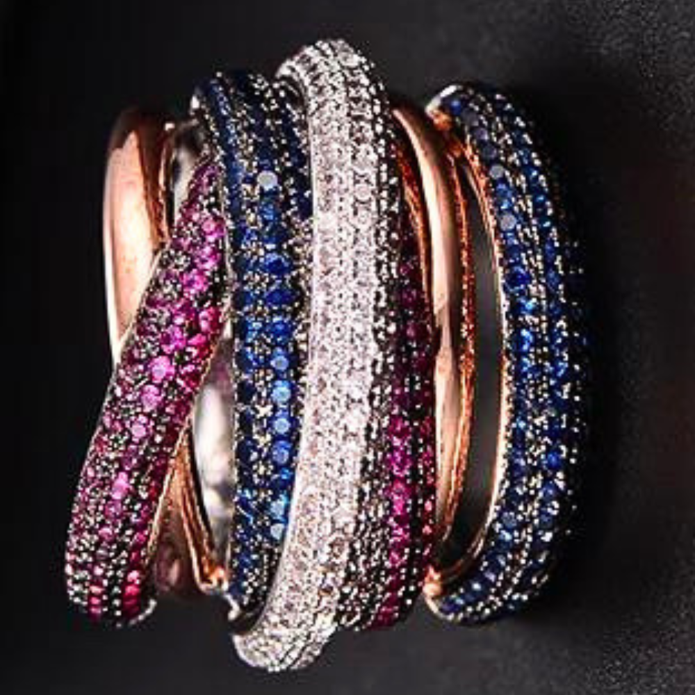 Este anillo no es solo una pieza de joyería, sino una obra de arte portátil. Con unas medidas de 25 mm de ancho, presenta 6 tiras curvas adornadas con un pavé de circonitas cúbicas de talla brillante de alta calidad, cuyos colores mezclados crean efectos similares a los de un arco iris brillante e intenso . Estas tiras se entrecruzan de forma tridimensional con otras 2 tiras de metal brillante, creando un diseño único y visualmente llamativo.