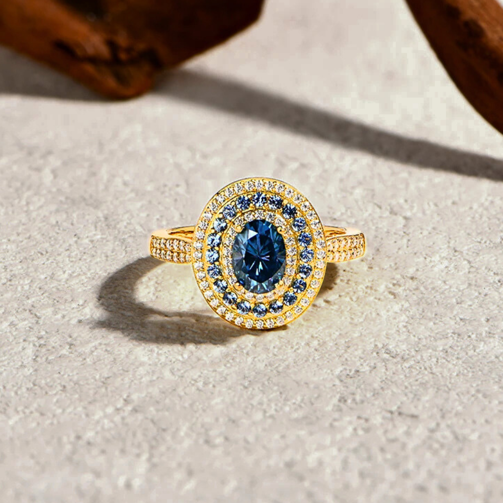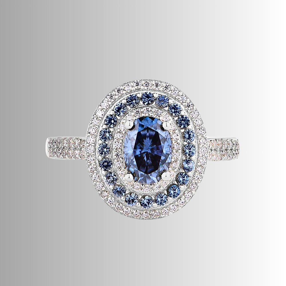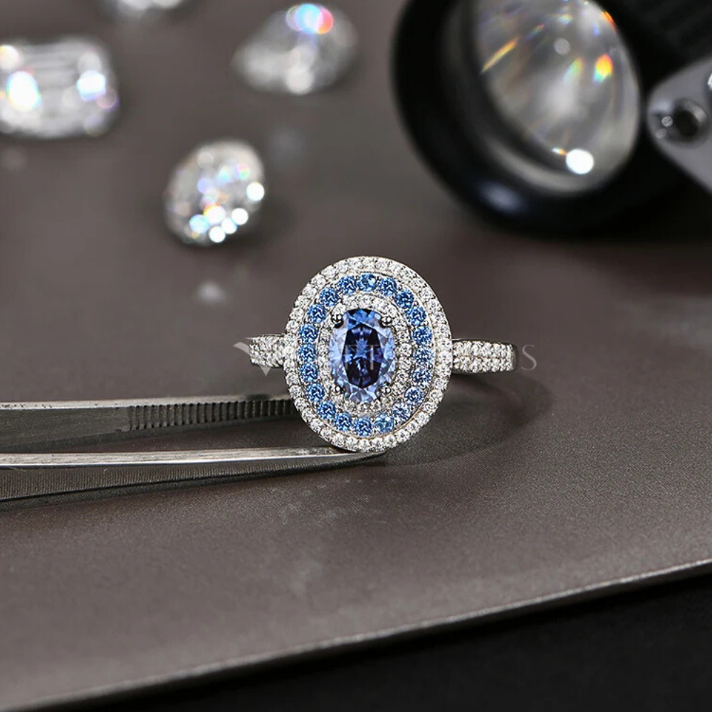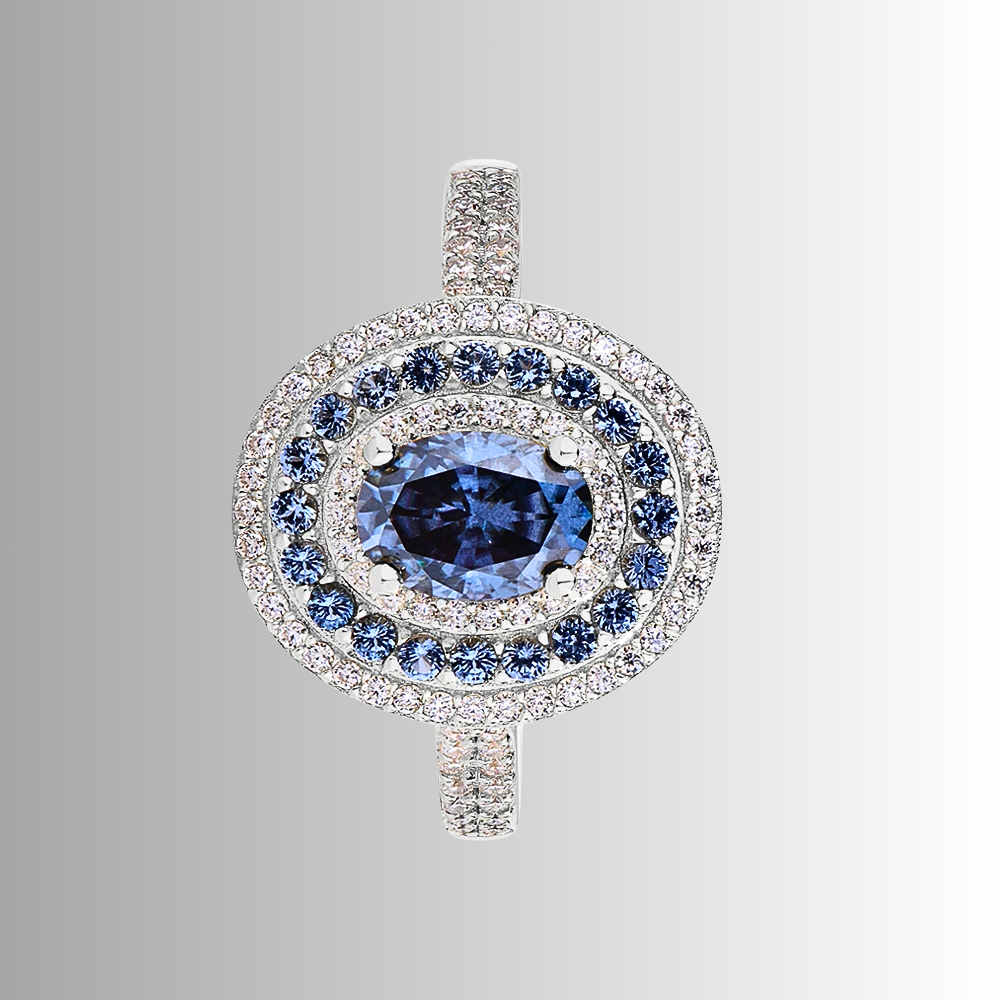 Al centro della composizione si trova una moissanite blu zaffiro Ceylon taglio ovale da 6 x 7 mm, pari a 1,50 carati. Il suo colore azzurro tenue ma brillante viene esaltato dall’incastonatura a quattro punte, che lascia filtrare la luce e mette in evidenza la trasparenza e la vivacità della gemma senza renderla dominante. La gemma centrale è incorniciata da una costruzione ovale articolata su tre livelli. Una prima fila di micro moissaniti bianche disegna il profilo più interno, seguita da una seconda fascia di moissaniti blu zaffiro Ceylon leggermente più grandi, che riprende il colore della pietra principale. Il disegno si completa con una terza fila ovale di moissaniti bianche, creando un contrasto armonioso e ben definito che amplifica la profondità visiva.