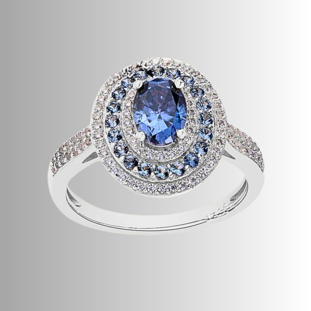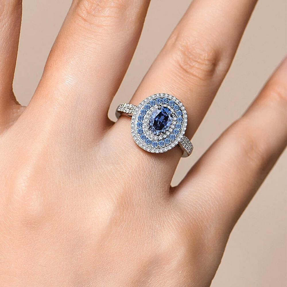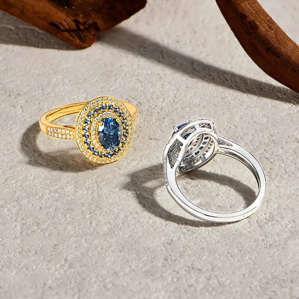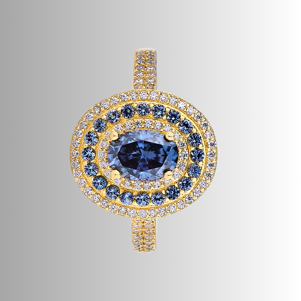 Al centro della composizione si trova una moissanite blu zaffiro Ceylon taglio ovale da 6 x 7 mm, pari a 1,50 carati. Il suo colore azzurro tenue ma brillante viene esaltato dall’incastonatura a quattro punte, che lascia filtrare la luce e mette in evidenza la trasparenza e la vivacità della gemma senza renderla dominante. La gemma centrale è incorniciata da una costruzione ovale articolata su tre livelli. Una prima fila di micro moissaniti bianche disegna il profilo più interno, seguita da una seconda fascia di moissaniti blu zaffiro Ceylon leggermente più grandi, che riprende il colore della pietra principale. Il disegno si completa con una terza fila ovale di moissaniti bianche, creando un contrasto armonioso e ben definito che amplifica la profondità visiva.