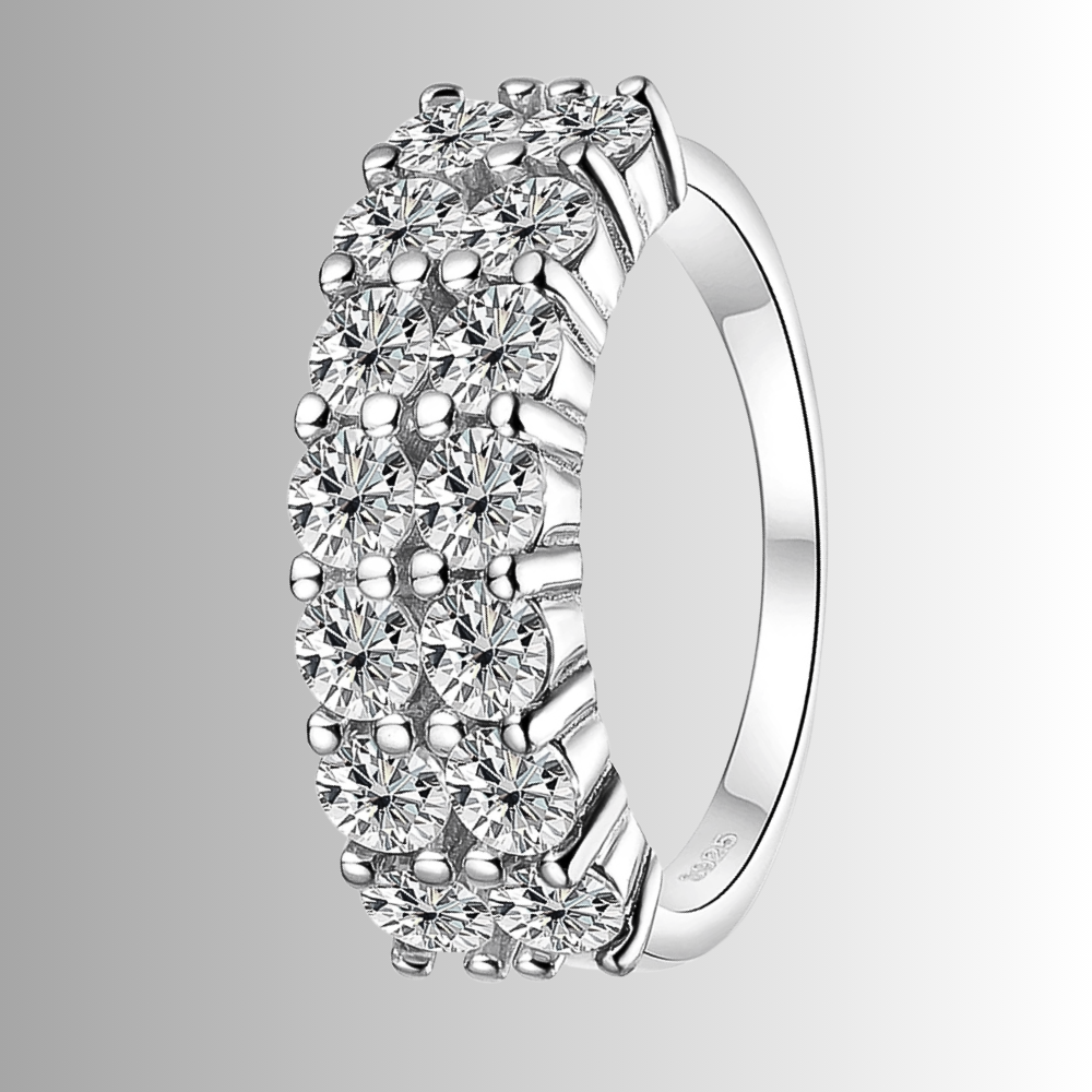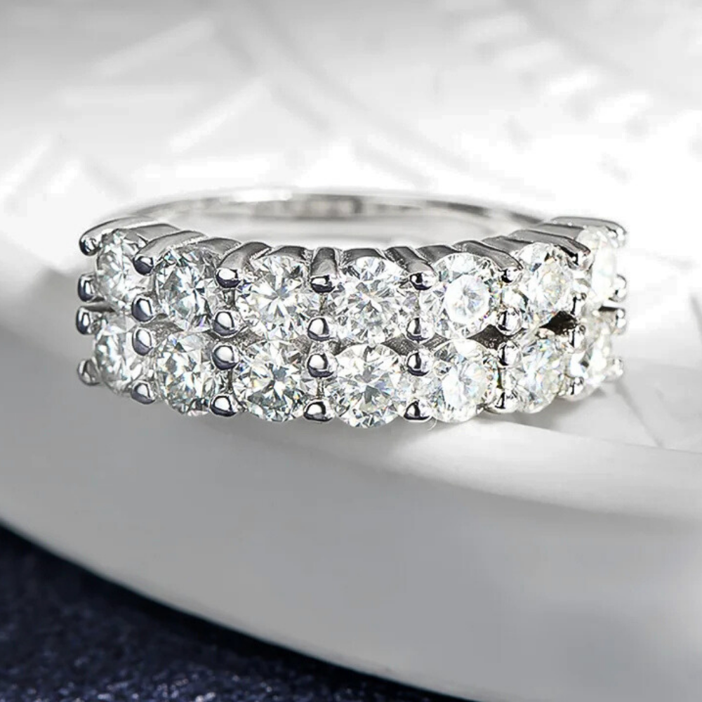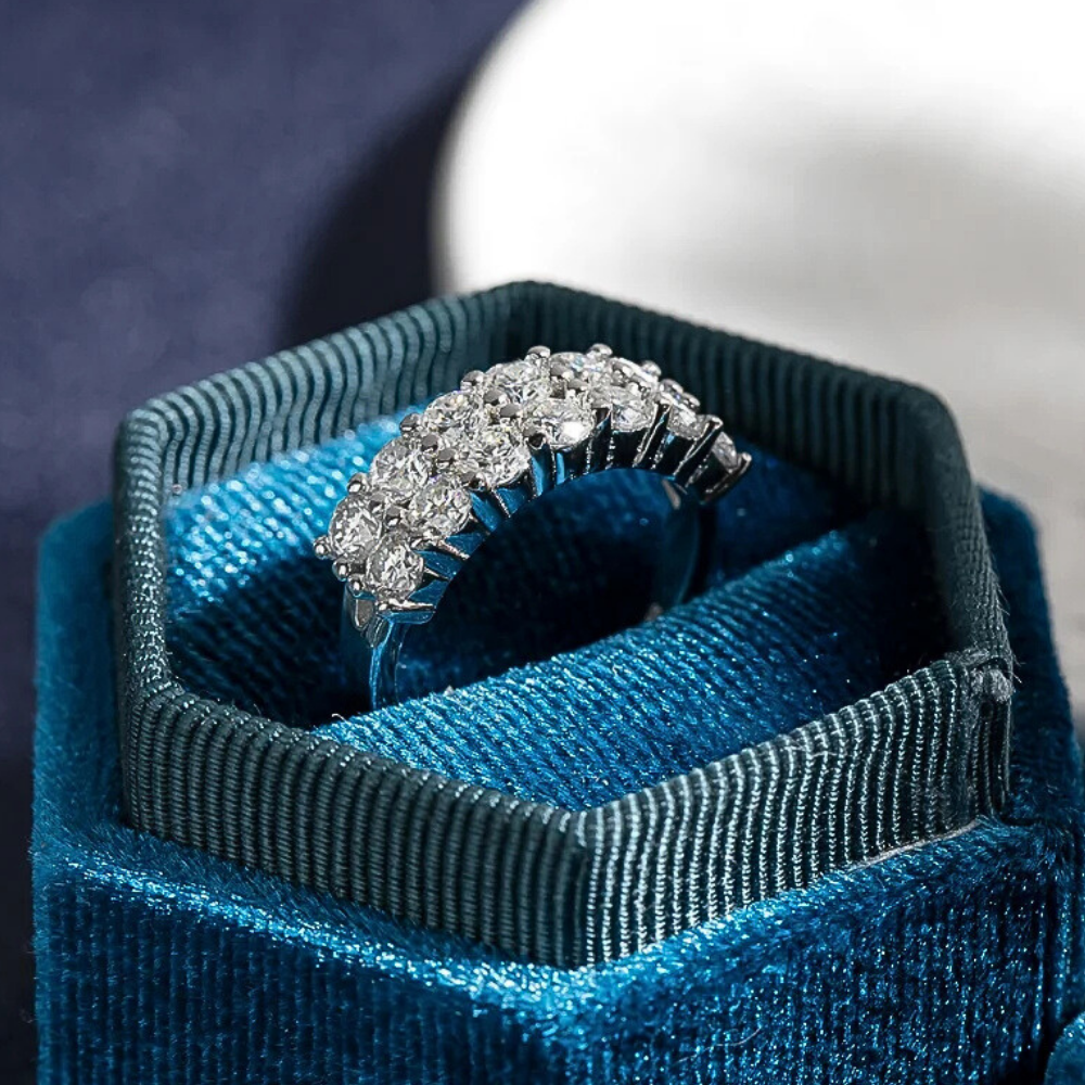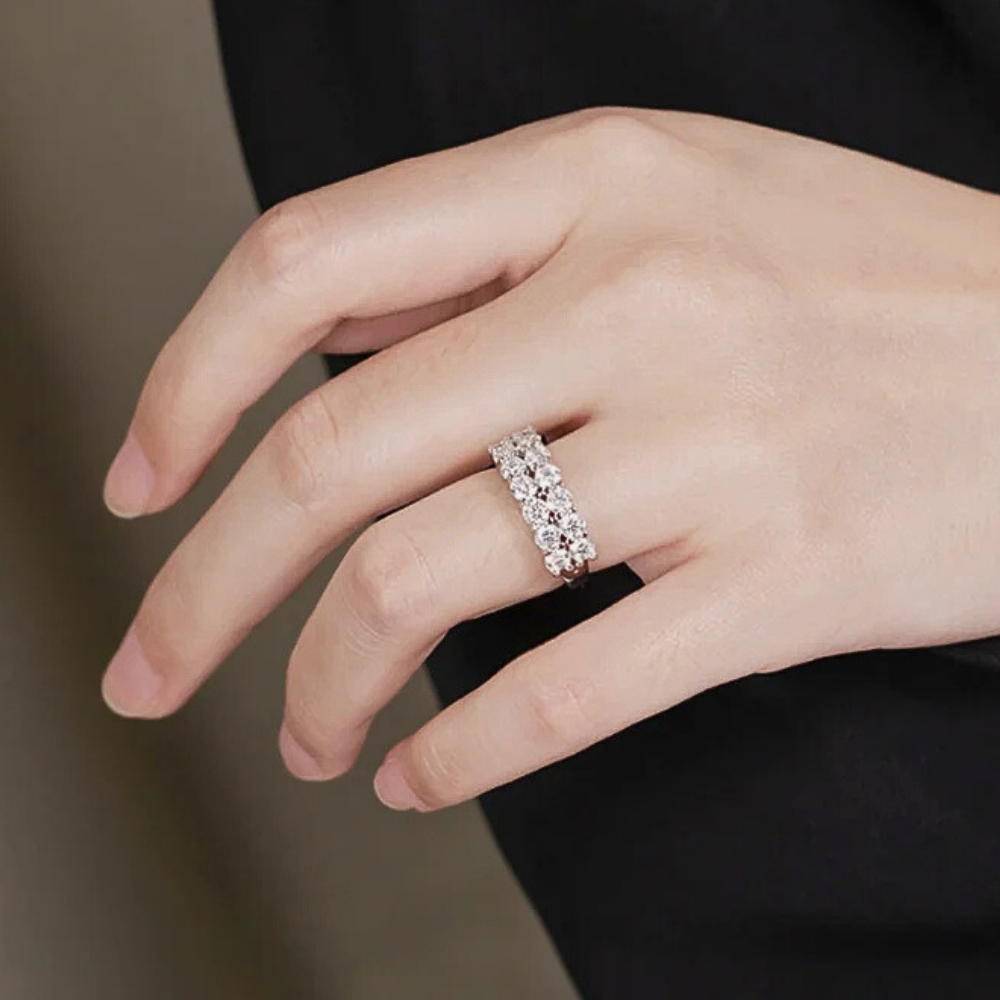 Le protagoniste sono 14 moissaniti certificate GRA, ciascuna da 3 mm ( ct 0,10), per un totale di 1,40 carati. La tonalità D color e la purezza VVS1 garantiscono una resa luminosa intensa e regolare, con riflessi netti e una brillantezza superiore a quella offerta dai brillanti naturali. Le pietre sono fissate con un sistema a griffes condivise, dove una singola punta blocca due moissaniti affiancate. Questa scelta tecnica crea un disegno compatto e lineare, trasformando la fascia in una sequenza rettangolare di luce che mantiene un aspetto ordinato e contemporaneo.