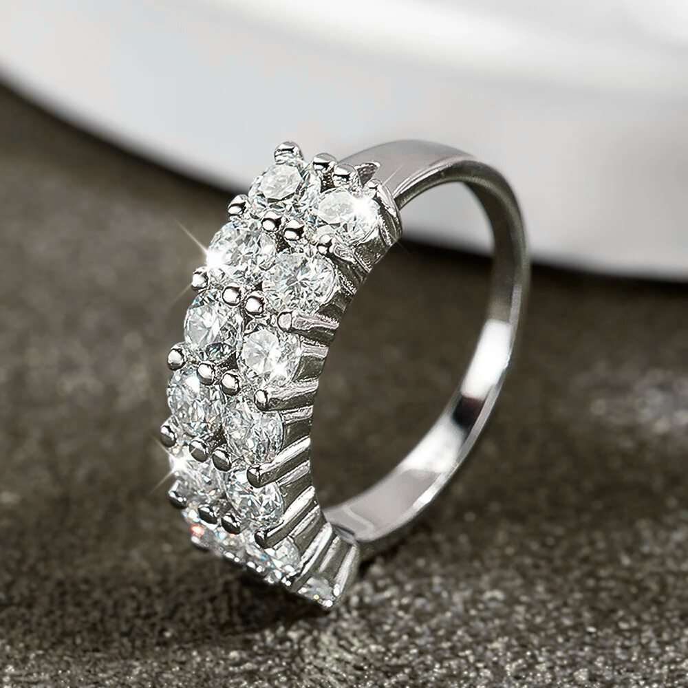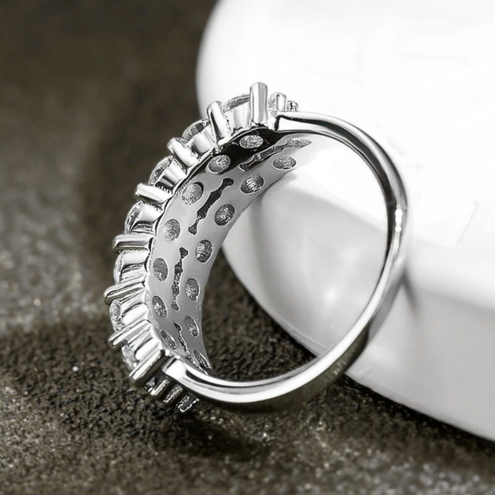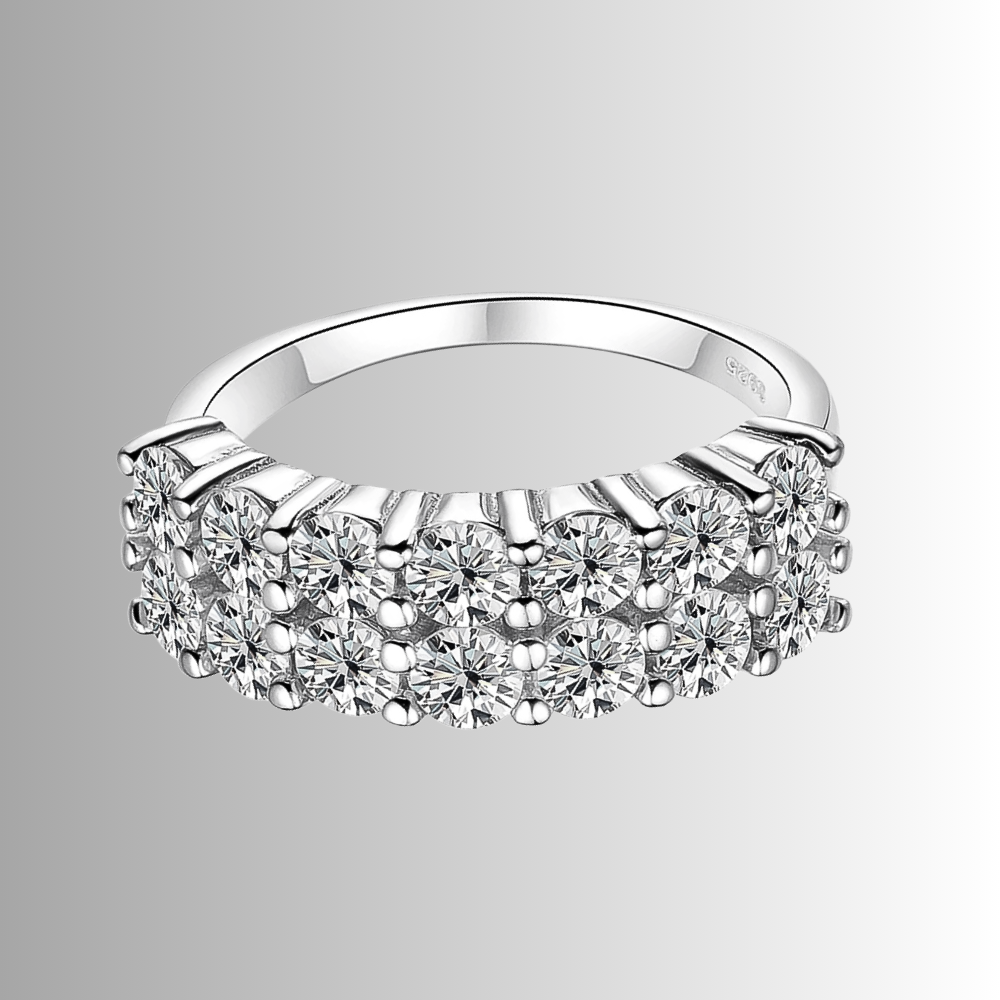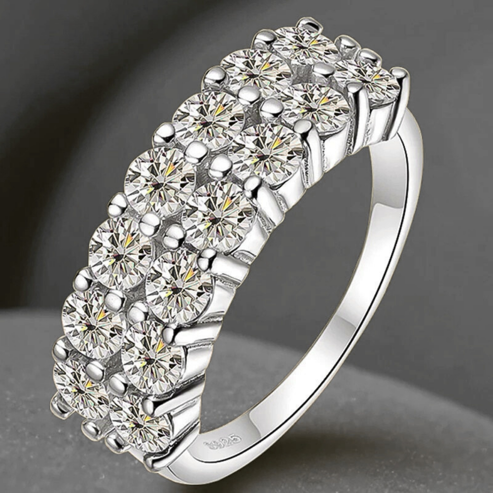 Le protagoniste sono 14 moissaniti certificate GRA, ciascuna da 3 mm ( ct 0,10), per un totale di 1,40 carati. La tonalità D color e la purezza VVS1 garantiscono una resa luminosa intensa e regolare, con riflessi netti e una brillantezza superiore a quella offerta dai brillanti naturali. Le pietre sono fissate con un sistema a griffes condivise, dove una singola punta blocca due moissaniti affiancate. Questa scelta tecnica crea un disegno compatto e lineare, trasformando la fascia in una sequenza rettangolare di luce che mantiene un aspetto ordinato e contemporaneo.