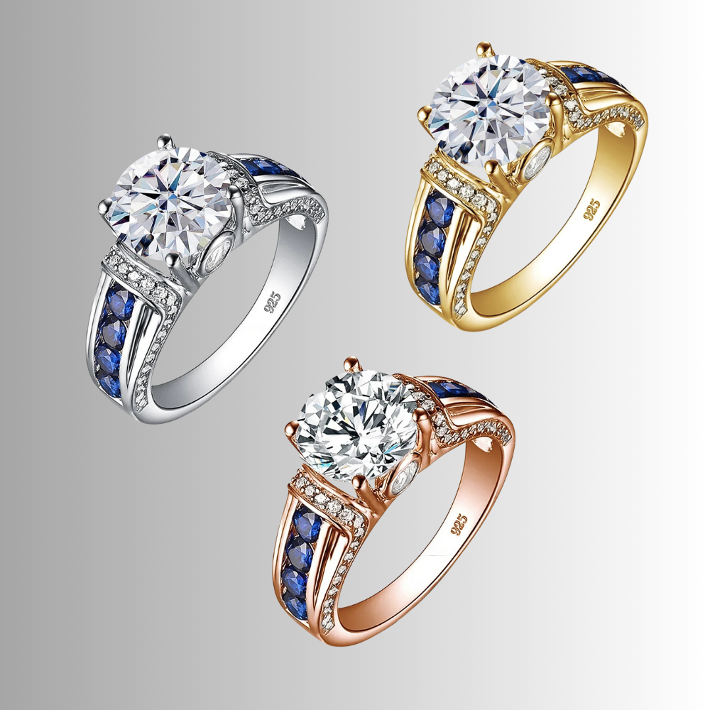 Sui due lati del gambo, una coppia di strisce a binario accoglie quattro moissaniti per lato, creando un ritmo luminoso ordinato e moderno. È disponibile anche la variante con otto moissaniti blu zaffiro, sempre con taglio brillante, per chi desidera un contrasto cromatico raffinato. Entrambe le versioni sono proposte con placcatura in oro 18 carati nei toni bianco con finitura al rodio, giallo o rosa.