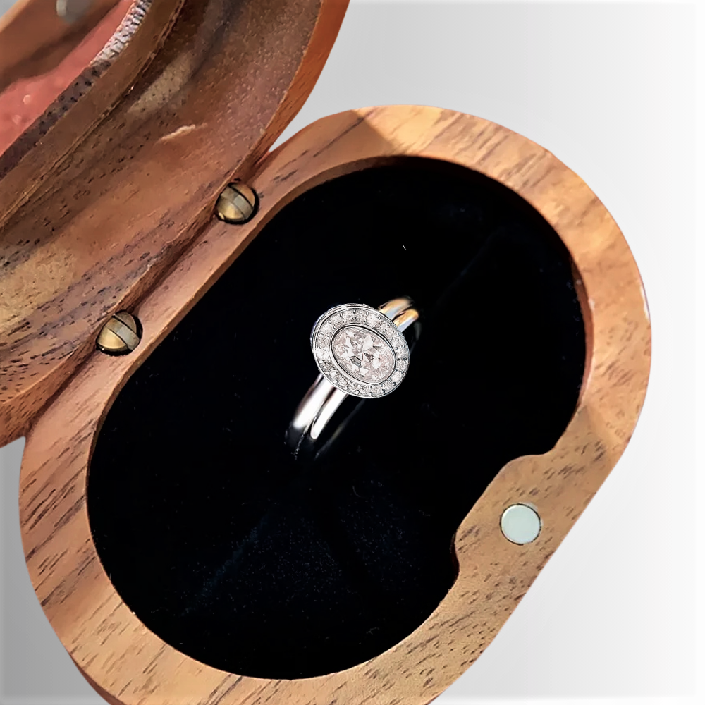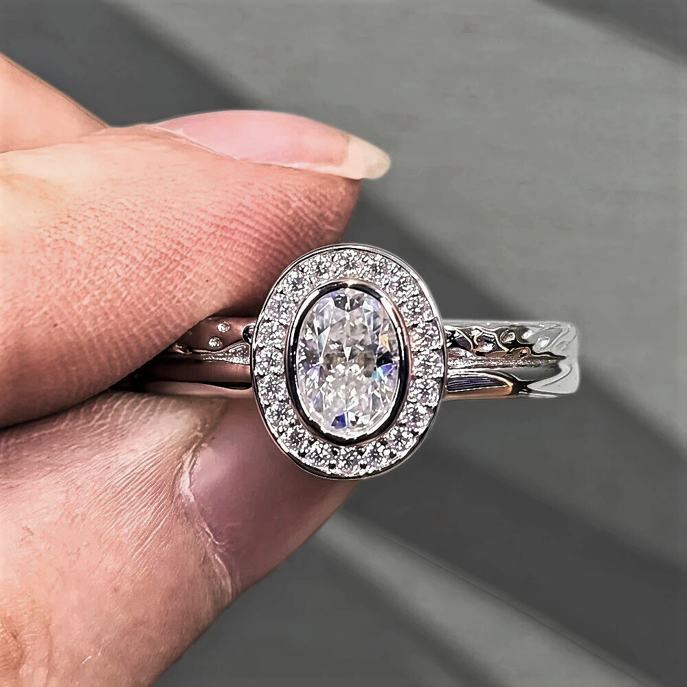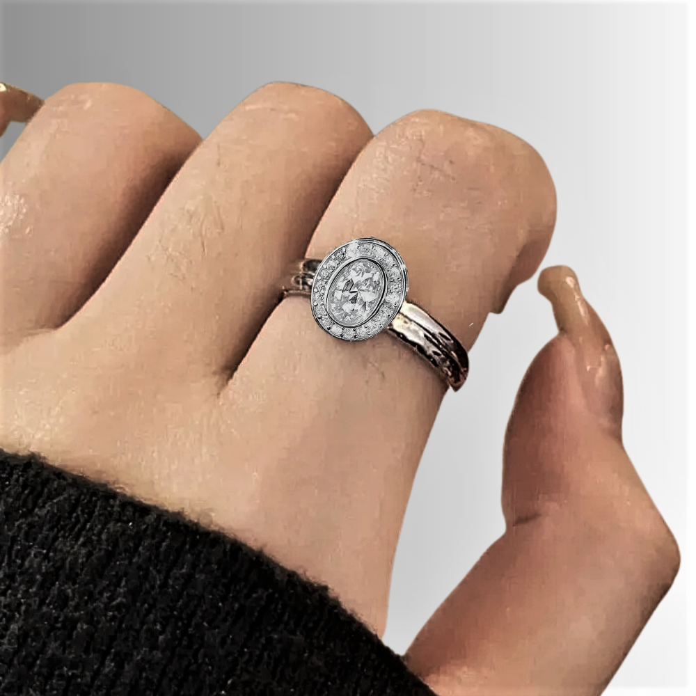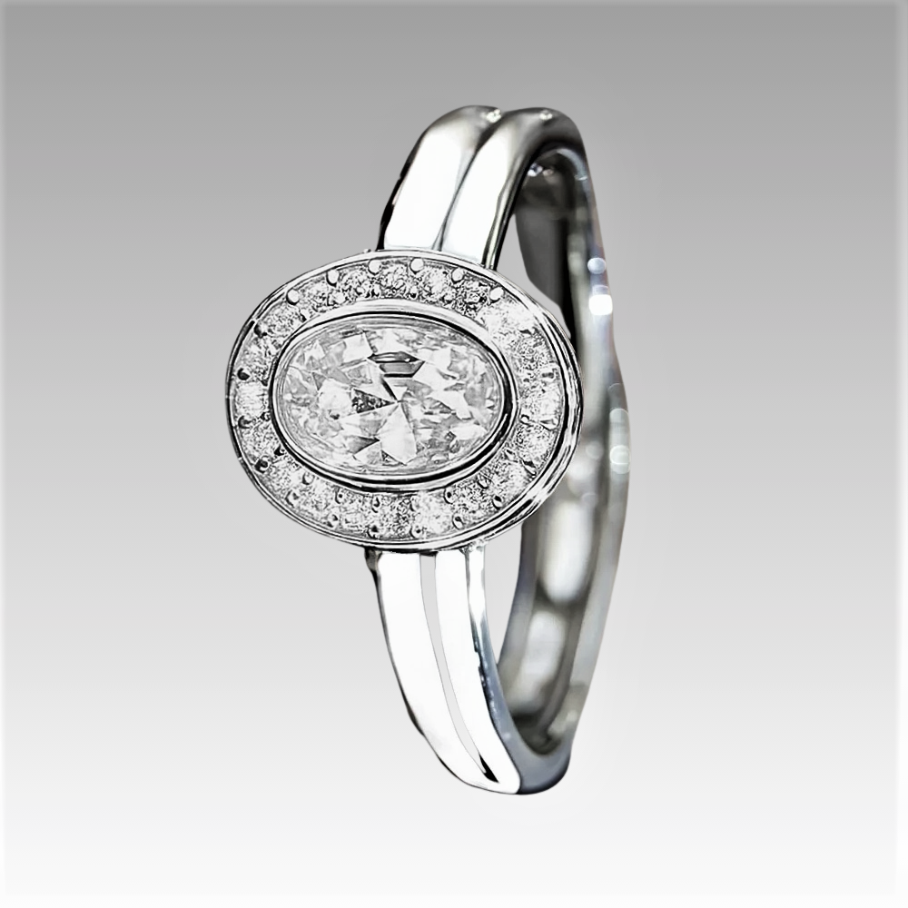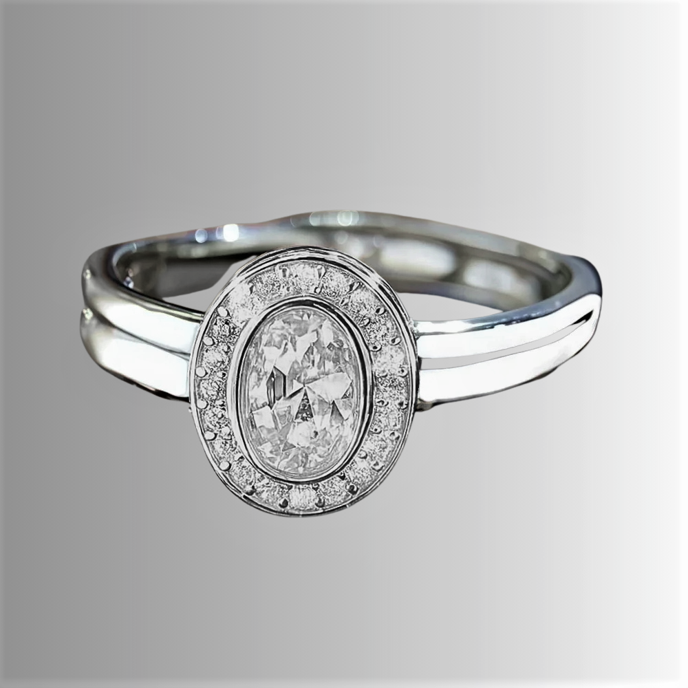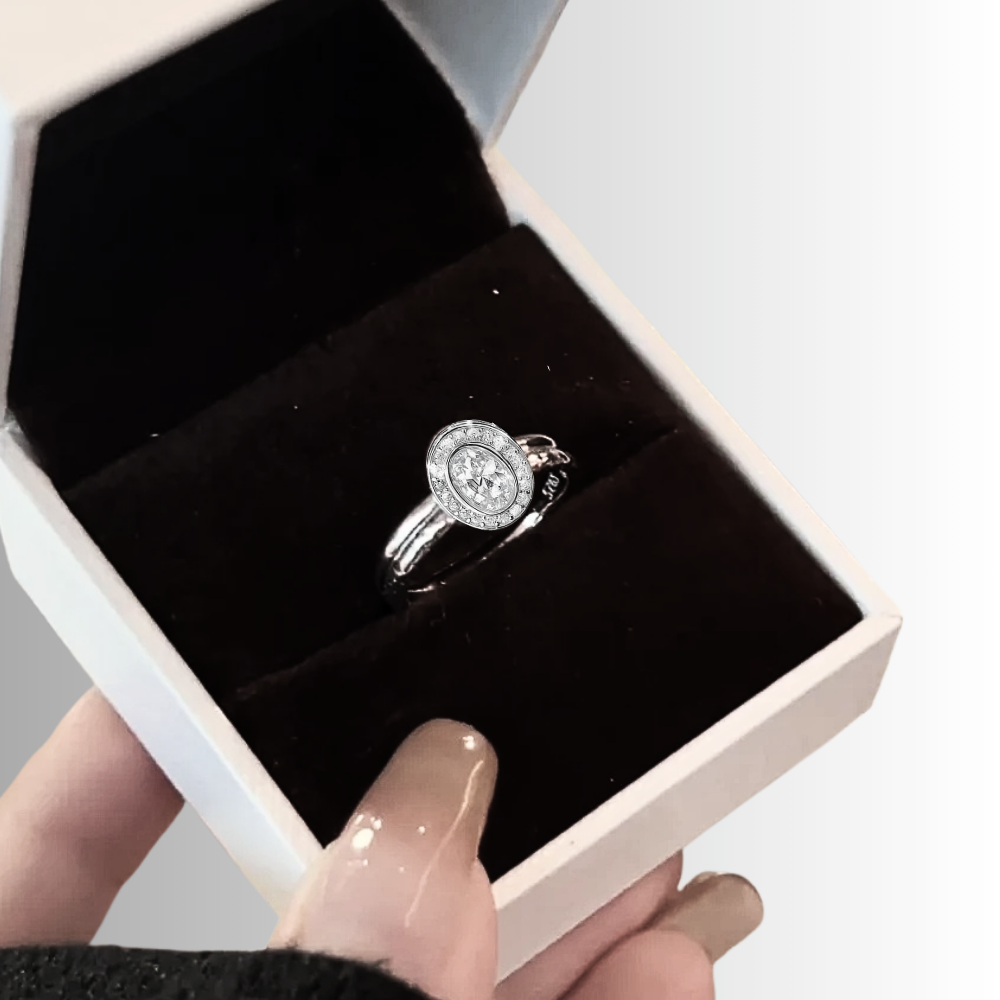 Il doppio gambo liscio e leggermente bombato sostiene una struttura ovale centrale, creando continuità tra base e parte superiore. Al centro, una moissanite ovale D Color certificata GRA da mm 6x4 (ct 0,50) cattura la luce con riflessi morbidi e regolari. La cornice di micro moissaniti D Color da mm 1 (ct totali 0,20) amplifica la luminosità, definendo il volume senza appesantire il disegno complessivo. La scelta del taglio ovale conferisce all’anello un aspetto contemporaneo e adattabile. La sua silhouette allungata dona slancio al dito e rende il gioiello facile da abbinare, sia a look essenziali che a combinazioni più curate, mantenendo sempre un’eleganza misurata.