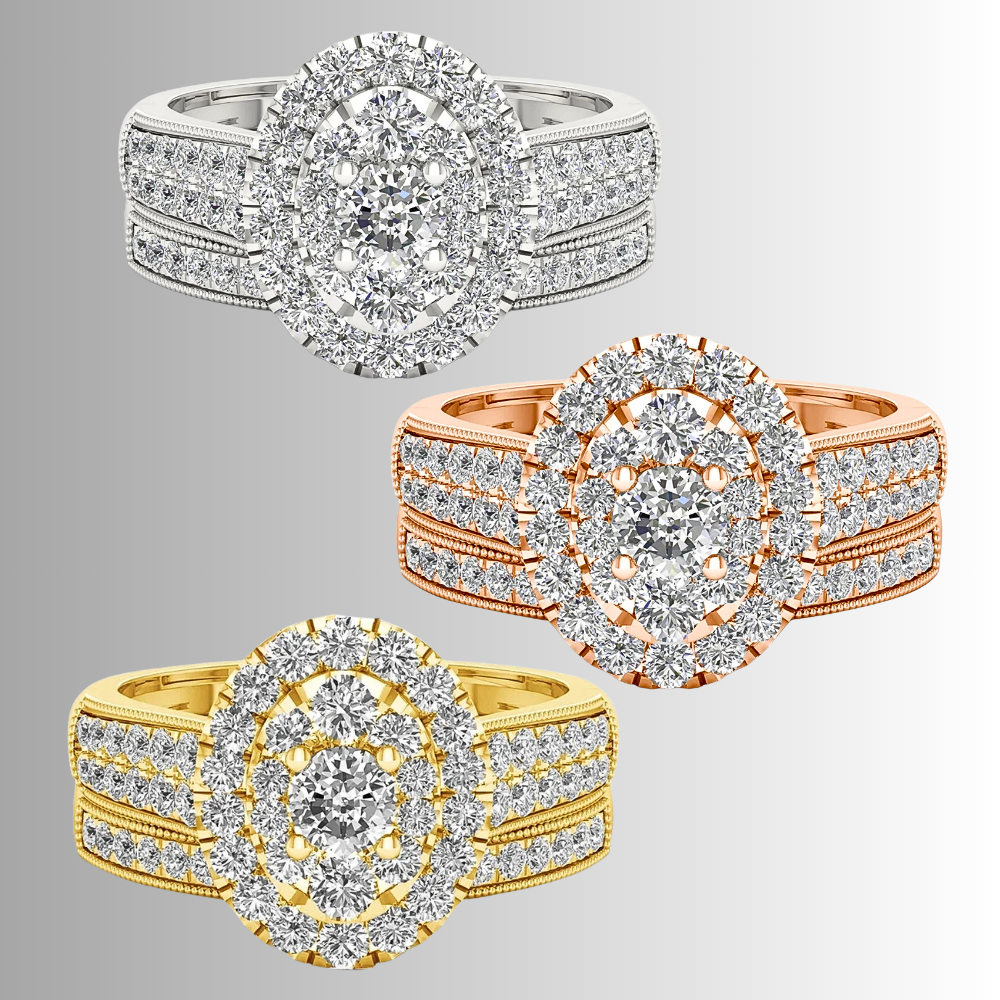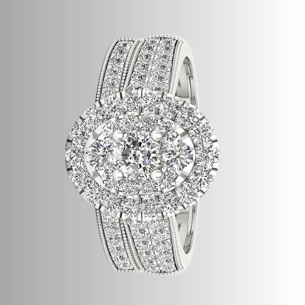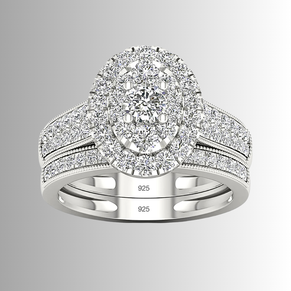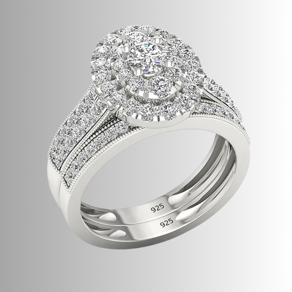 Questo mini set nasce per chi cerca un equilibrio tra eleganza e personalità. Il fascione principale combina linee architettoniche e dettagli studiati: il gambo ospita due strisce parallele di moissaniti D Color, affiancate da micro sfere metalliche lucide che creano un gioco di contrasti tra pieno e vuoto, moltiplicando i riflessi. Al centro, una composizione di castoni forma un ovale perfetto: una pietra più grande circondata da pietre di dimensioni medie e piccole genera un effetto ottico unico, dando l’impressione di una singola gemma luminosa e intensa.