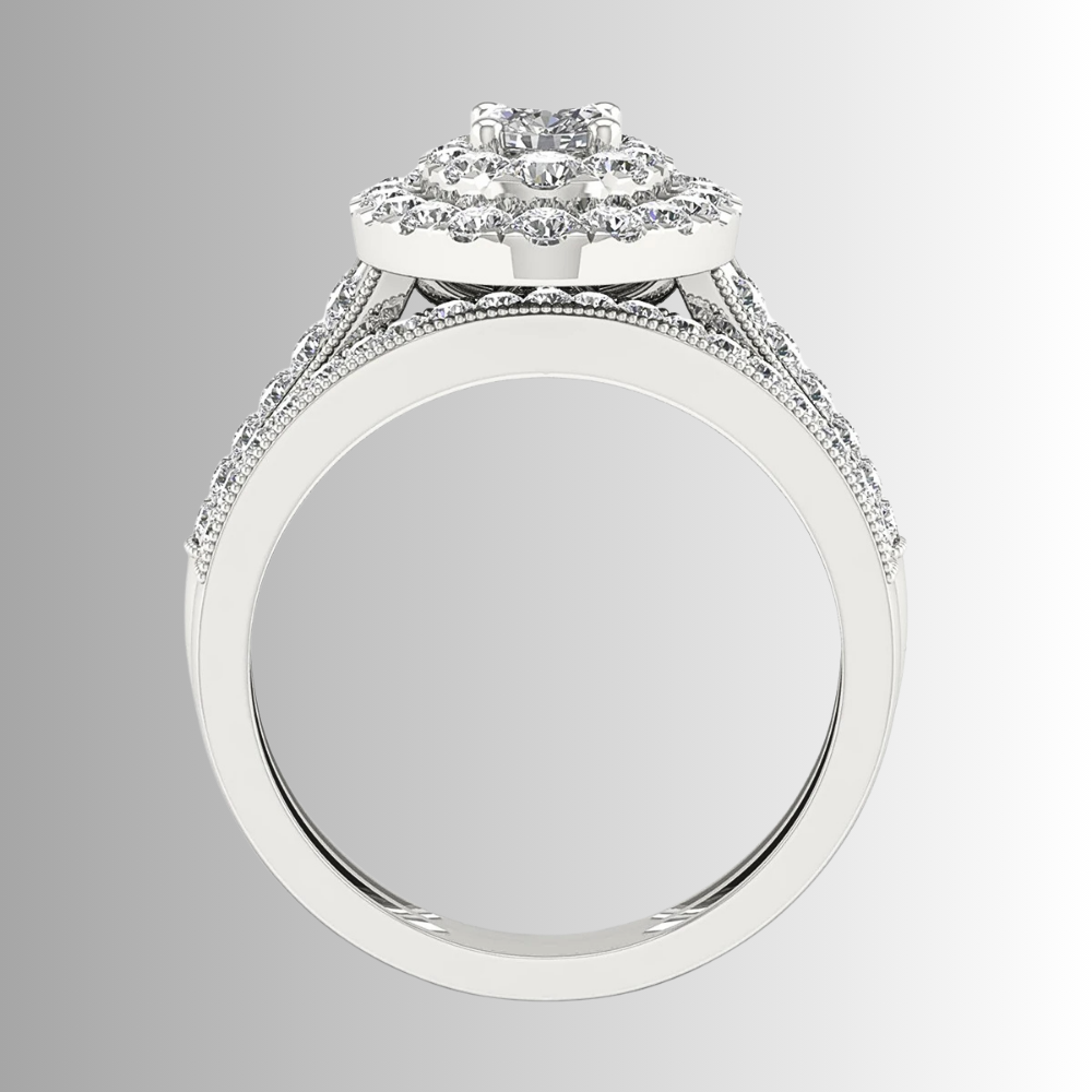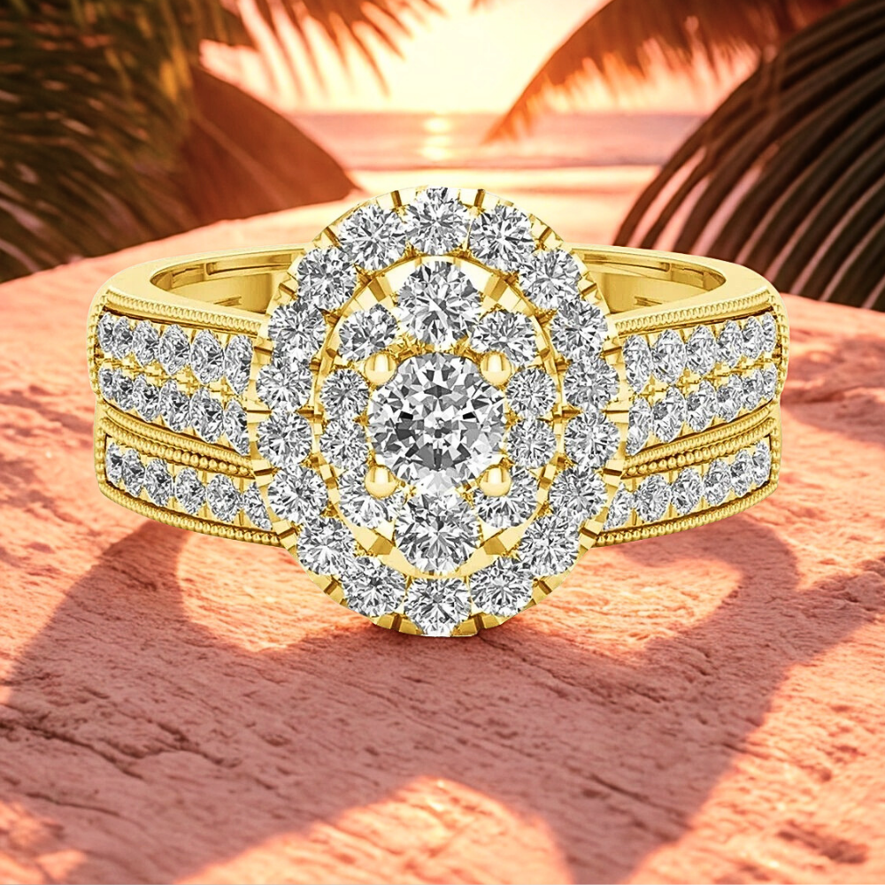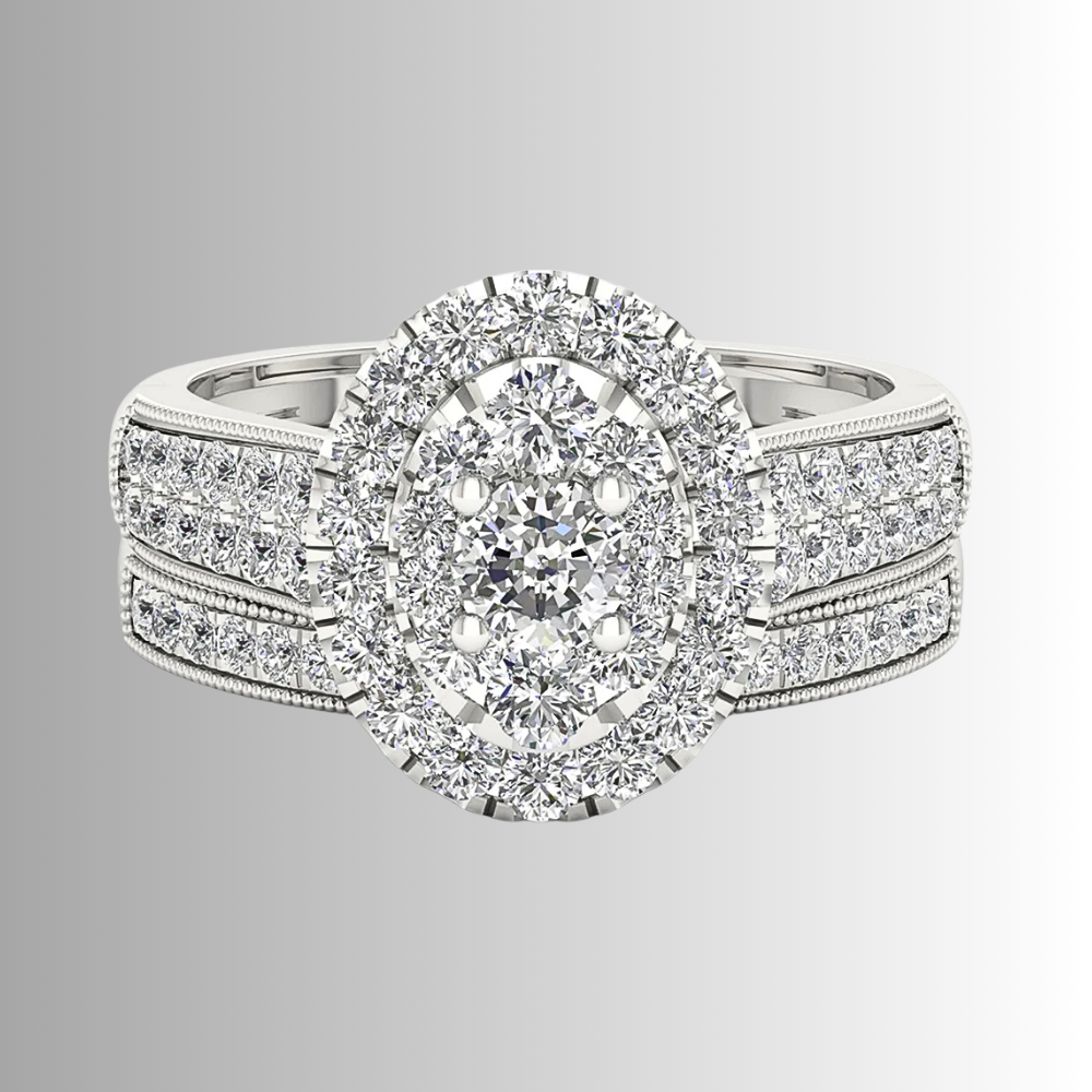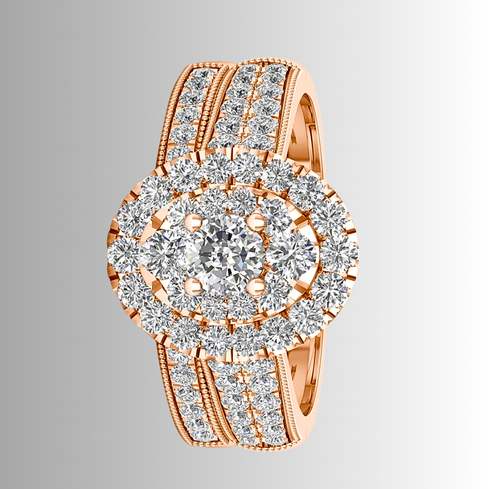 Questo mini set nasce per chi cerca un equilibrio tra eleganza e personalità. Il fascione principale combina linee architettoniche e dettagli studiati: il gambo ospita due strisce parallele di moissaniti D Color, affiancate da micro sfere metalliche lucide che creano un gioco di contrasti tra pieno e vuoto, moltiplicando i riflessi. Al centro, una composizione di castoni forma un ovale perfetto: una pietra più grande circondata da pietre di dimensioni medie e piccole genera un effetto ottico unico, dando l’impressione di una singola gemma luminosa e intensa.