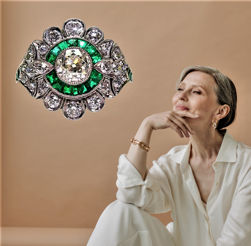 La estructura del anillo está embellecida , además de por las esmeraldas naturales , también por 10 pétalos , cada uno de los cuales contiene una piedra blanca de talla antigua, que irradian desde el centro como rayos de luz. Los extremos del diseño están adornados con dos lirios esculpidos , cada uno formado por un pavé de circonitas de talla antigua , culminando con 2 brillantes esmeraldas colombianas , añadiendo un toque más de nobleza y esplendor al conjunto.