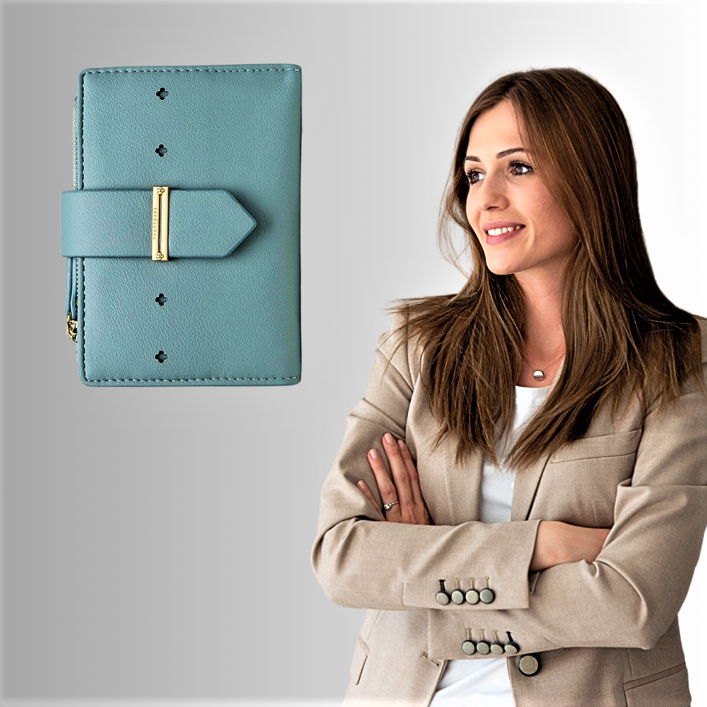 La belleza de esta mini billetera también radica en sus detalles: una hebilla decorativa que no solo oculta el botón de seguridad sino que añade un toque de elegancia, flanqueada por 4 deliciosas flores perforadas que embellecen el diseño. Cada elemento ha sido diseñado para crear un equilibrio perfecto entre belleza y funcionalidad.