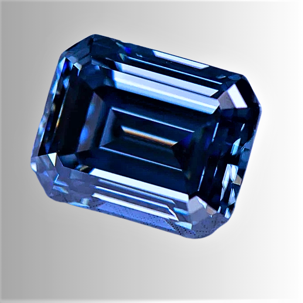 Intensa come un cielo notturno e regale come un manto imperiale, la Moissanite Royal Blue dal taglio smeraldo incanta per la sua profondità magnetica. Le facce rettangolari a gradini riflettono la luce in modo netto e ordinato, creando un effetto di trasparenza blu vellutato, che alterna riflessi scuri e bagliori elettrici.