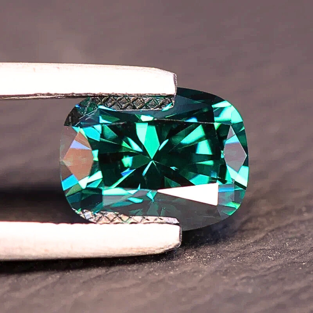 Slanciata ed essenziale, la Moissanite Verde Smeraldo con taglio cuscino allungato è una dichiarazione di stile che unisce forma e colore in un’armonia solenne. Le proporzioni rettangolari, ammorbidite dagli angoli arrotondati, guidano la luce lungo percorsi eleganti, mettendo in risalto la profondità vellutata del verde.
