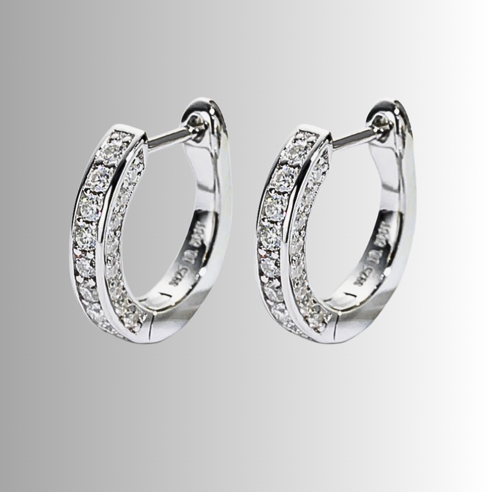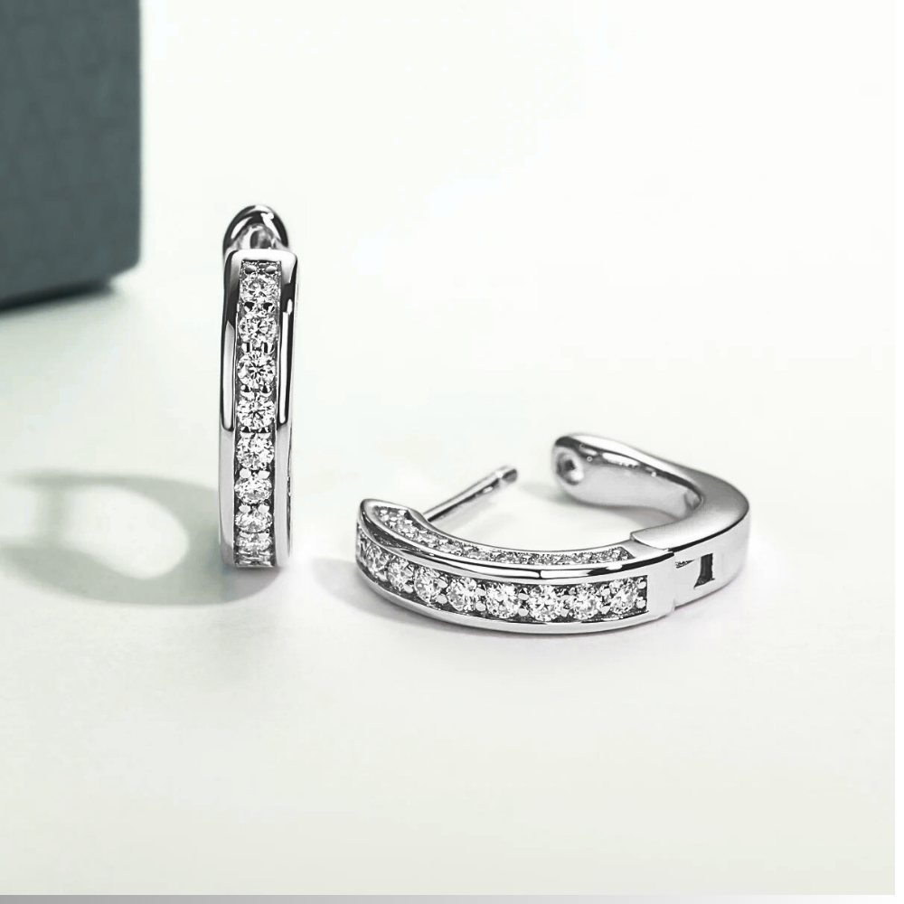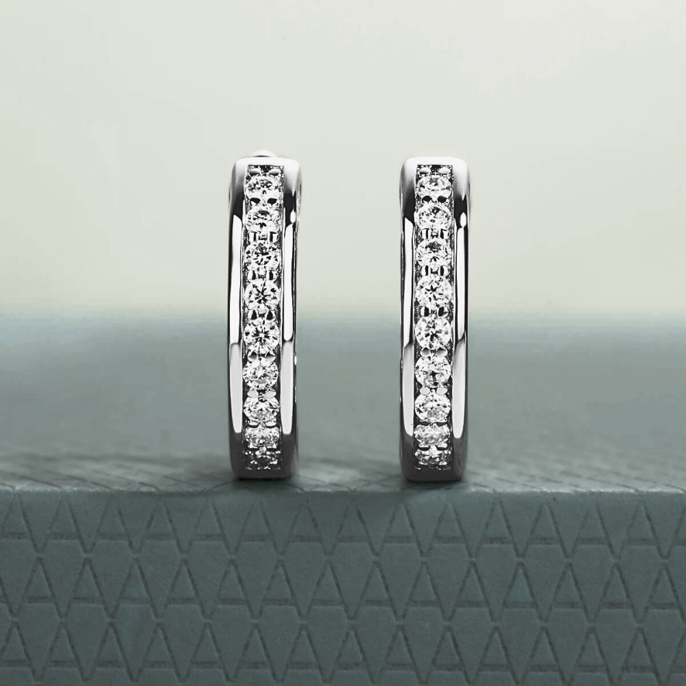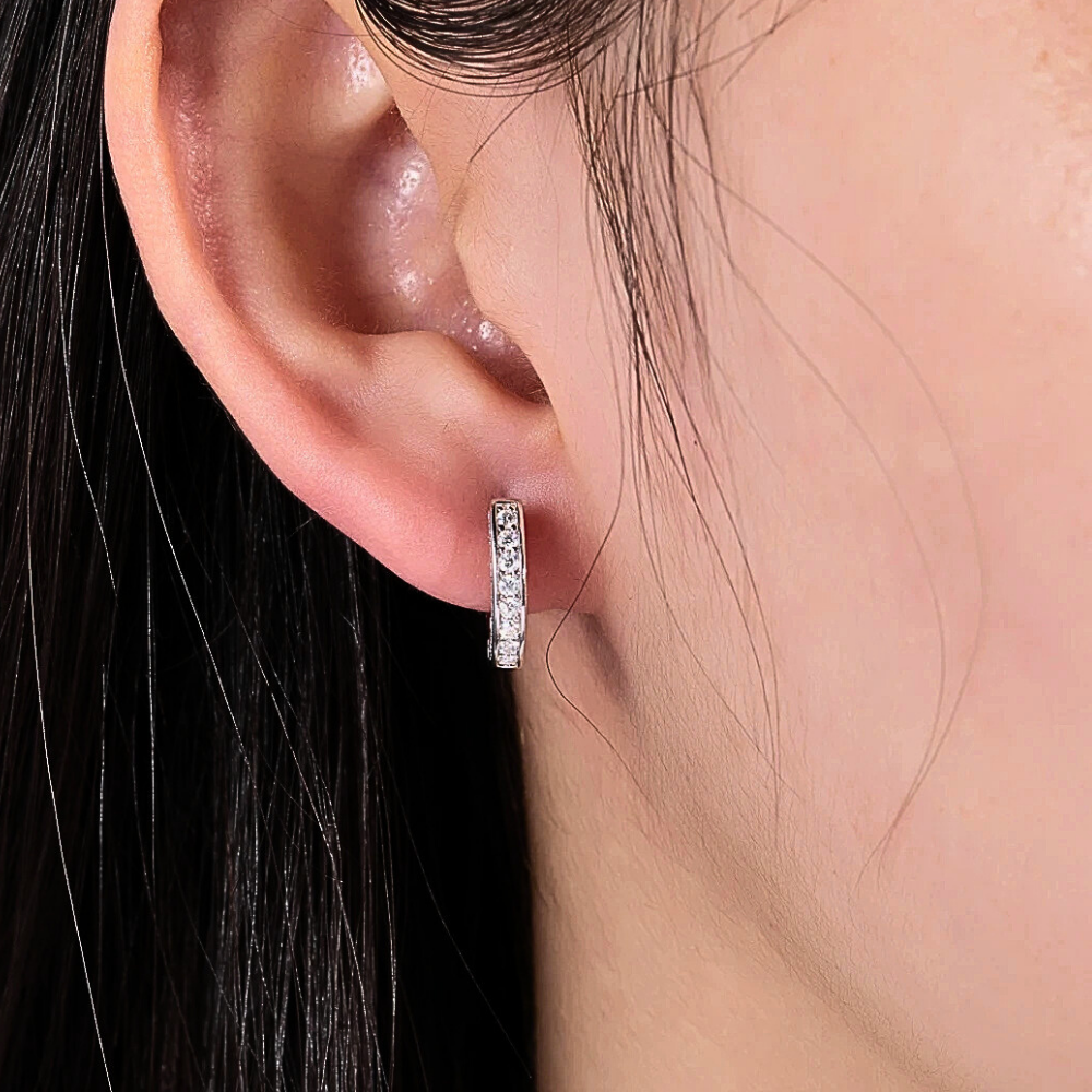 La superficie frontale è decorata da una composizione di moissaniti organizzata su tre linee parallele. Al centro corre una striscia di 9 pietre da 1,5 mm, mentre sui due lati si sviluppano altre due file di 10 gemme leggermente più piccole. Questa disposizione crea un gioco di proporzioni elegante e dinamico che amplifica la brillantezza senza appesantire il profilo dell’orecchino. La caratura totale raggiunge 0,56 ct, offrendo una luminosità raffinata e ben distribuita.