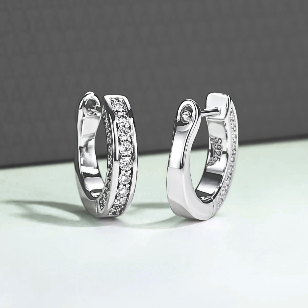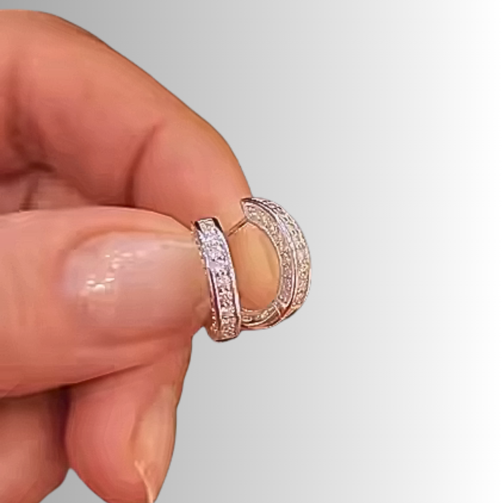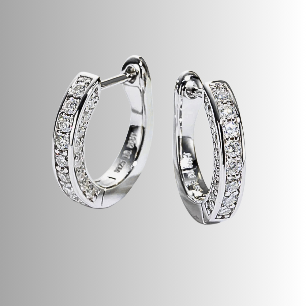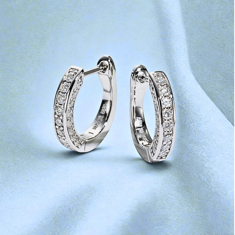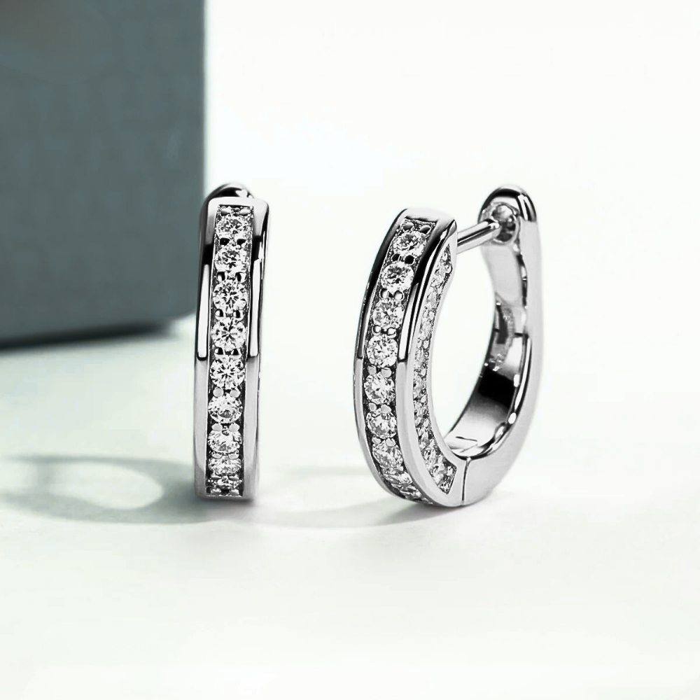 La superficie frontale è decorata da una composizione di moissaniti organizzata su tre linee parallele. Al centro corre una striscia di 9 pietre da 1,5 mm, mentre sui due lati si sviluppano altre due file di 10 gemme leggermente più piccole. Questa disposizione crea un gioco di proporzioni elegante e dinamico che amplifica la brillantezza senza appesantire il profilo dell’orecchino. La caratura totale raggiunge 0,56 ct, offrendo una luminosità raffinata e ben distribuita.