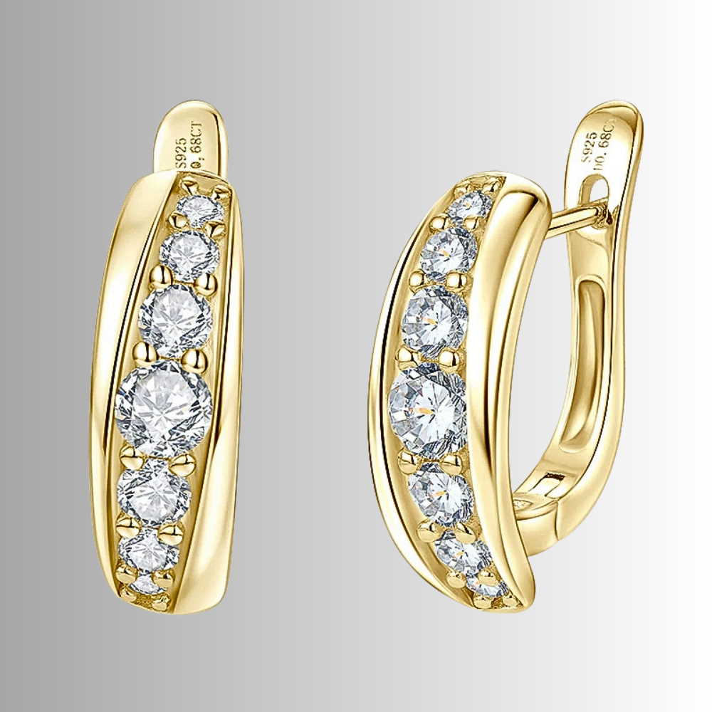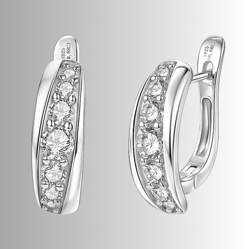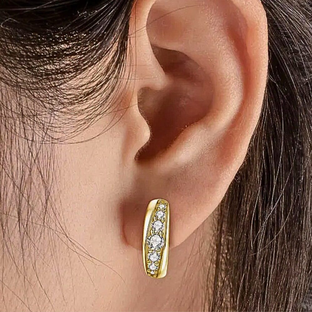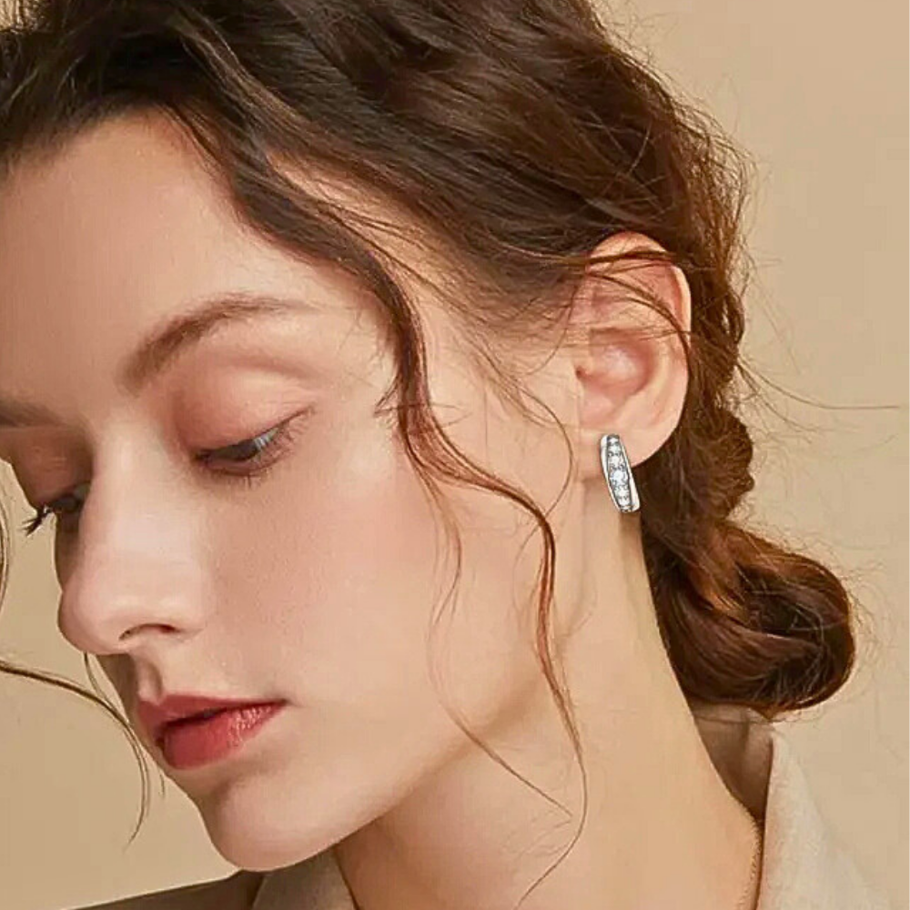 La parte centrale dell’orecchino è impreziosita da una fila di 6 moissaniti D color disposte in progressione dimensionale. La pietra centrale da 4 mm cattura immediatamente lo sguardo, mentre le due successive da 3 mm accompagnano il disegno con equilibrio. Verso le estremità la dimensione delle gemme diminuisce gradualmente con pietre da 2,5 mm e 2 mm, creando una composizione armoniosa e dinamica. Questa disposizione conferisce profondità visiva e valorizza la brillantezza complessiva per una caratura totale di circa 0,68 ct.