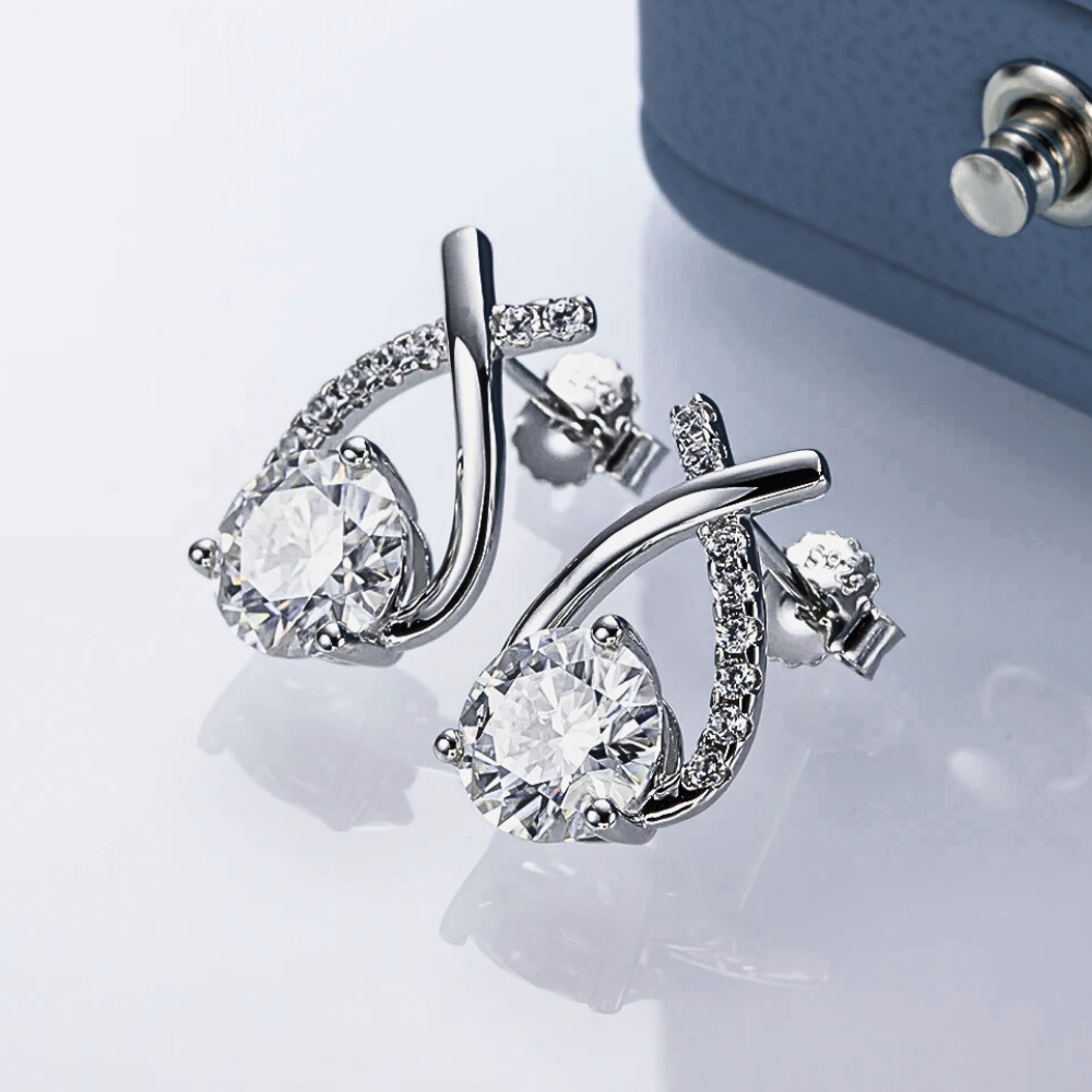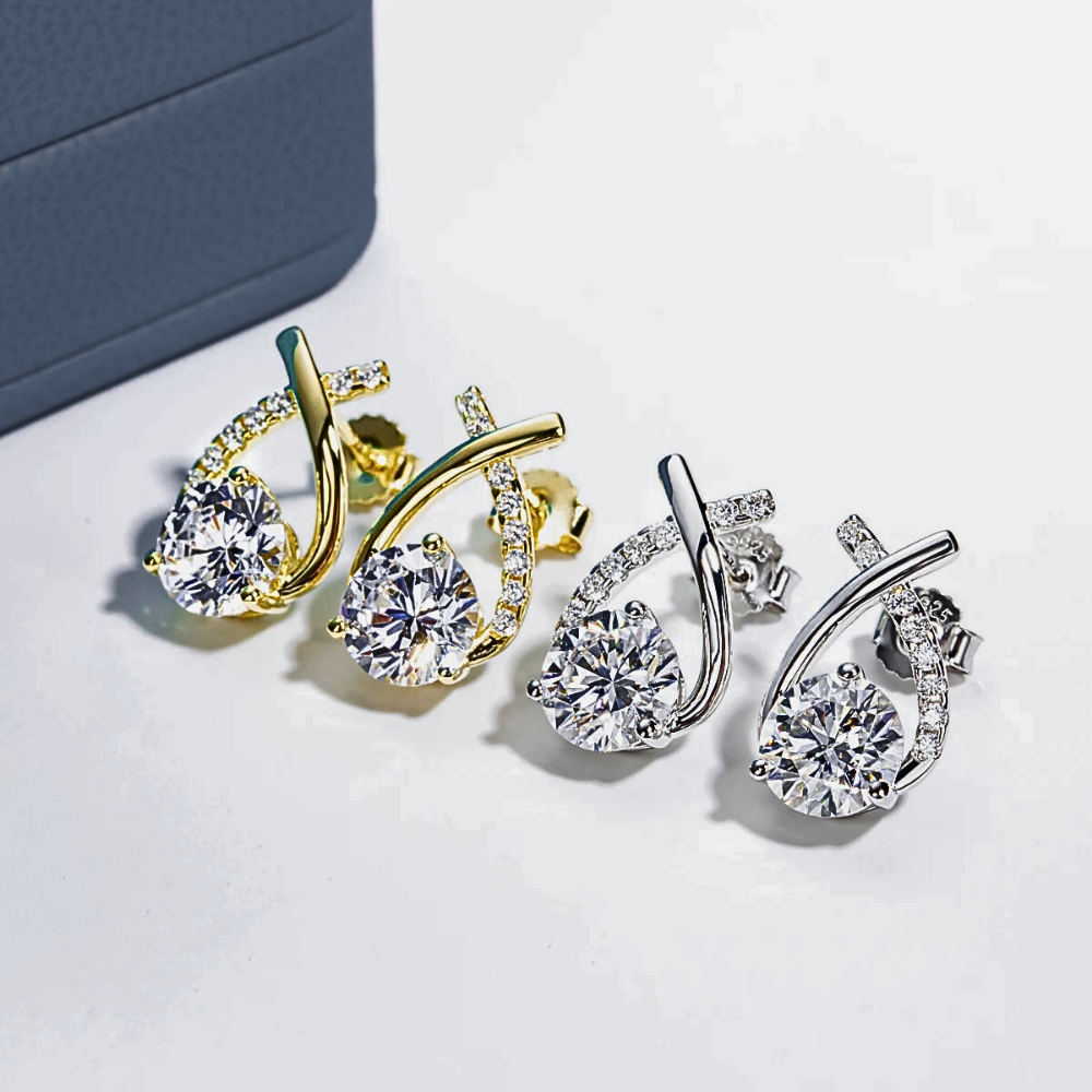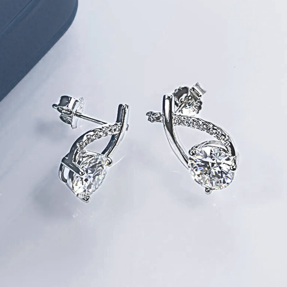 Questi orecchini a nodo con moissaniti interpretano un’idea moderna di eleganza, dove il design si sviluppa attraverso linee fluide che si incrociano creando un segno grafico distintivo. La forma ricorda un movimento naturale del metallo che si piega e si sovrappone, generando un piccolo ovale dinamico capace di incorniciare la pietra centrale. Il risultato è un equilibrio visivo molto pulito: la struttura in metallo lucido disegna una curva continua mentre una sottile fascia pavé introduce una brillantezza diffusa che accompagna lo sguardo verso la gemma principale. L’insieme rimane essenziale, ma la composizione delle linee e la dimensione della pietra creano una presenza luminosa ben definita.