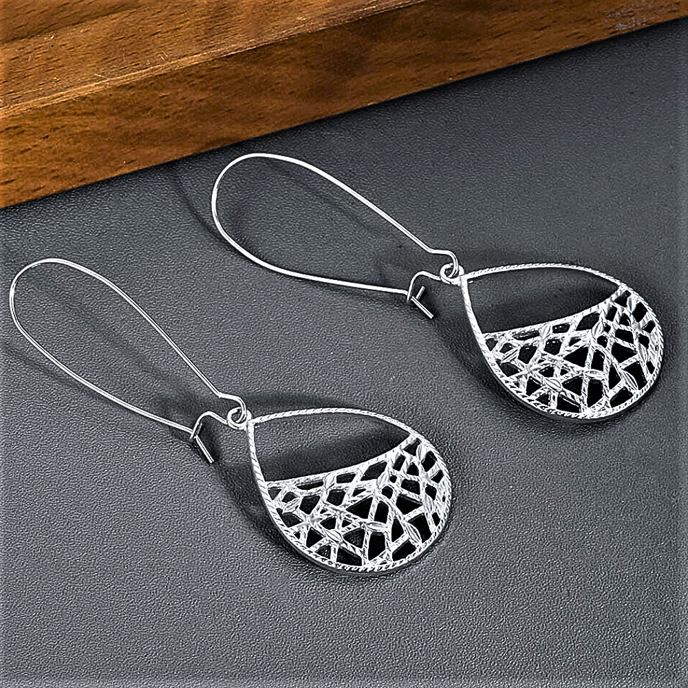 Estos pendientes están hechos de aleación de cobre hipoalergénico de alta calidad, seleccionado por su resistencia y capacidad para reflejar la luz, creando un efecto visual impresionante. Su forma de lágrima, con un diseño moleteado a lo largo del borde, agrega textura y profundidad , mientras que la malla interna le da un carácter distintivo y un encanto sutil.