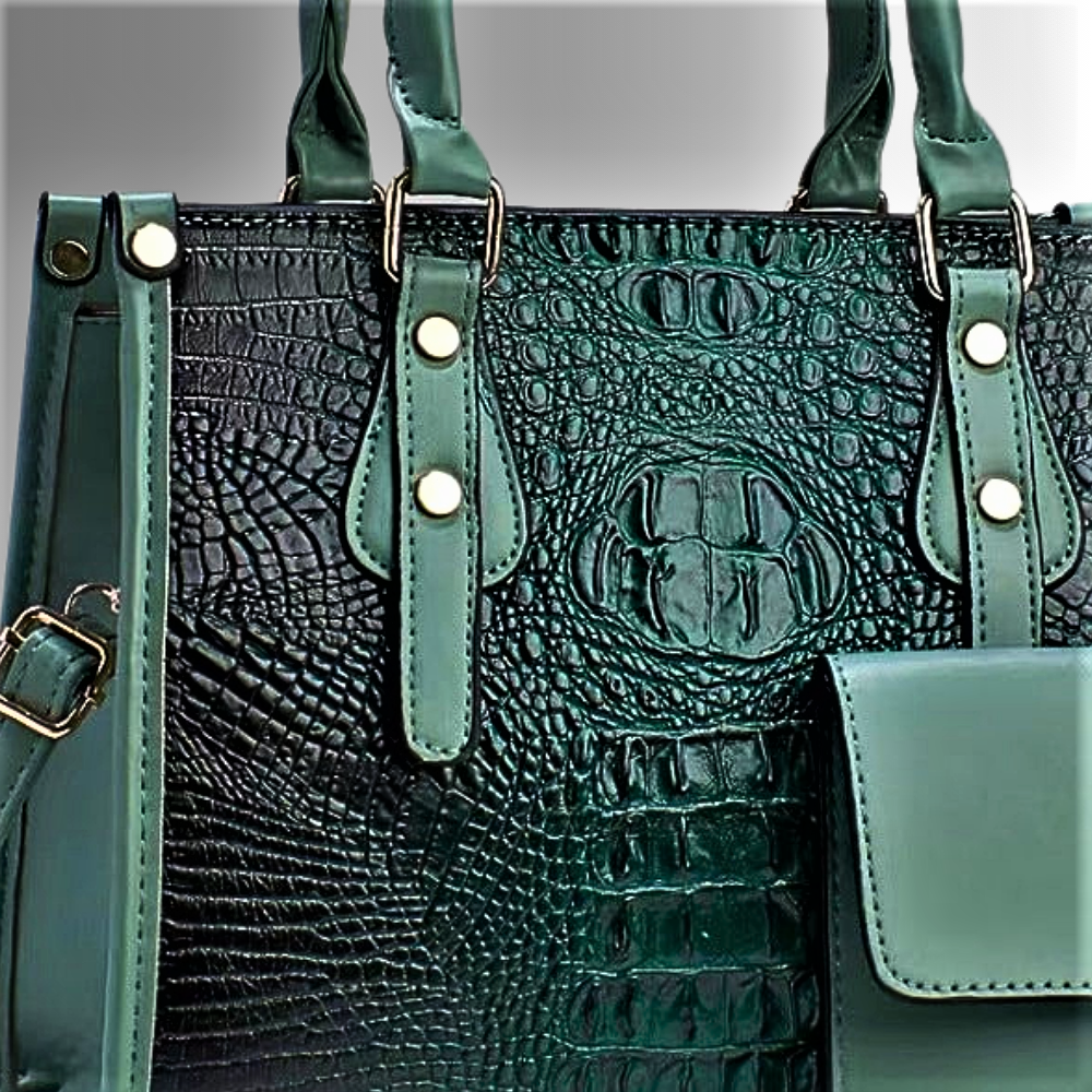 Esta propuesta es una experiencia de estilo completa. El bolso principal, con dos asas resistentes y una correa de hombro ajustable, ofrece versatilidad de uso , mientras que su estructura interna, bien organizada con forros de tela de poliéster resistente y dos bolsillos internos, garantiza una gestión óptima de sus artículos personales. El bolso de mano y la cartera a juego , aunque sin la elaboración “cocodrilo” pero idénticos a los bordes del bolso , completan perfectamente el conjunto, subrayando una extrema elegancia y coherencia estilística .