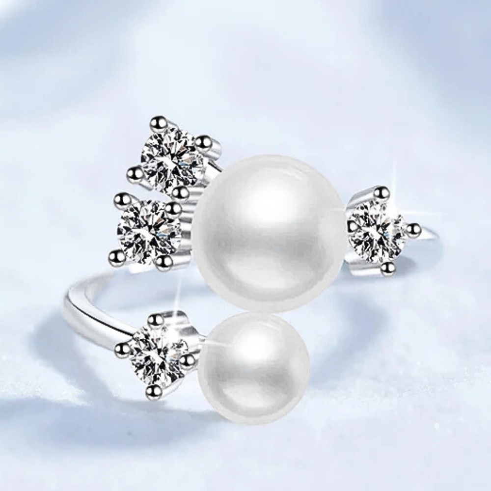 Le moissaniti D color VVS1 certificate GRA, con un totale di 0,40 ct, illuminano l’anello con scintillio puro e continuo. Il castone a quattro punte protegge ciascuna pietra, valorizzandone il taglio e la luminosità. Le perle naturali d’acqua dolce AAAA, senza imperfezioni visibili, aggiungono morbidezza e raffinatezza, creando un elegante contrasto con la lucentezza delle moissaniti.
