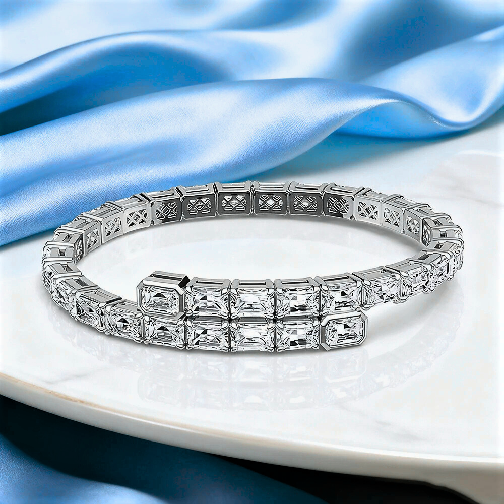Il bracciale è composto da 34 moissaniti D Color con taglio smeraldo, dimensioni 4 x 6 mm, ciascuna da ct 0,80, per un totale di ct 27,20. Il taglio rettangolare, con faccette ampie e ordinate, valorizza la purezza delle pietre e restituisce riflessi intensi e continui. La moissanite, nota per un indice di rifrazione superiore a quello del diamante naturale, garantisce una brillantezza evidente ma mai disordinata.