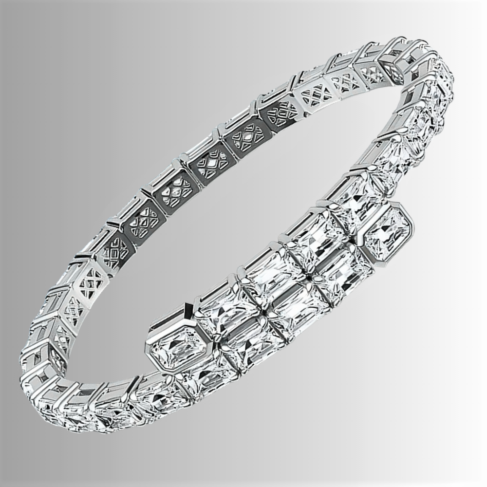 I castoni rettangolari a 4 punte sono collegati tra loro mediante soluzioni tecniche avanzate che consentono l’elasticità necessaria all’apertura e alla chiusura del bracciale. I due lembi contrapposti si allontanano con naturalezza e tornano alla posizione originale una volta indossati, mantenendo stabilità e comfort. Le estremità terminano con castoni chiusi, a completamento di una struttura solida e coerente.