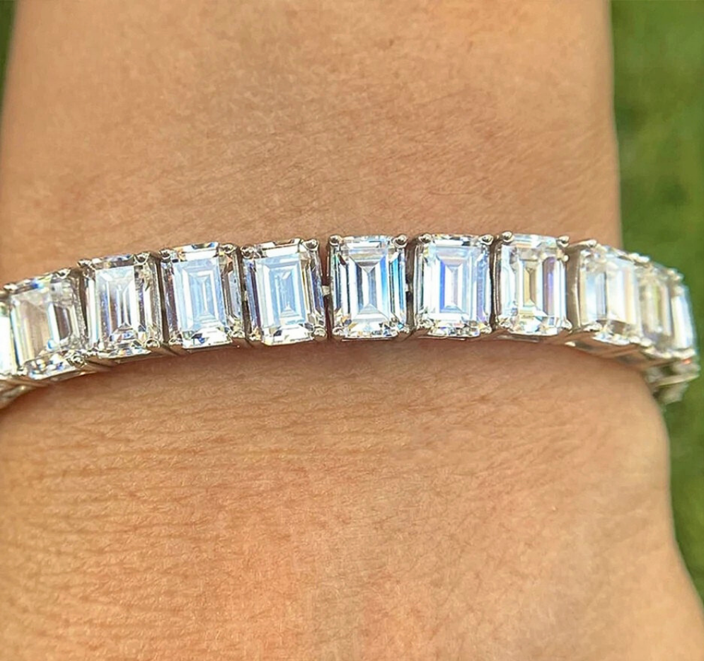 Realizzato interamente a mano in Argento Sterling 925, il bracciale è rifinito con tripla placcatura in oro bianco a 18 carati e completato da una rodiatura finale. I castoni a 4 punte, studiati per sostenere la pietra sui lati lunghi, assicurano stabilità, continuità di luce, comfort e una resa estetica impeccabile.